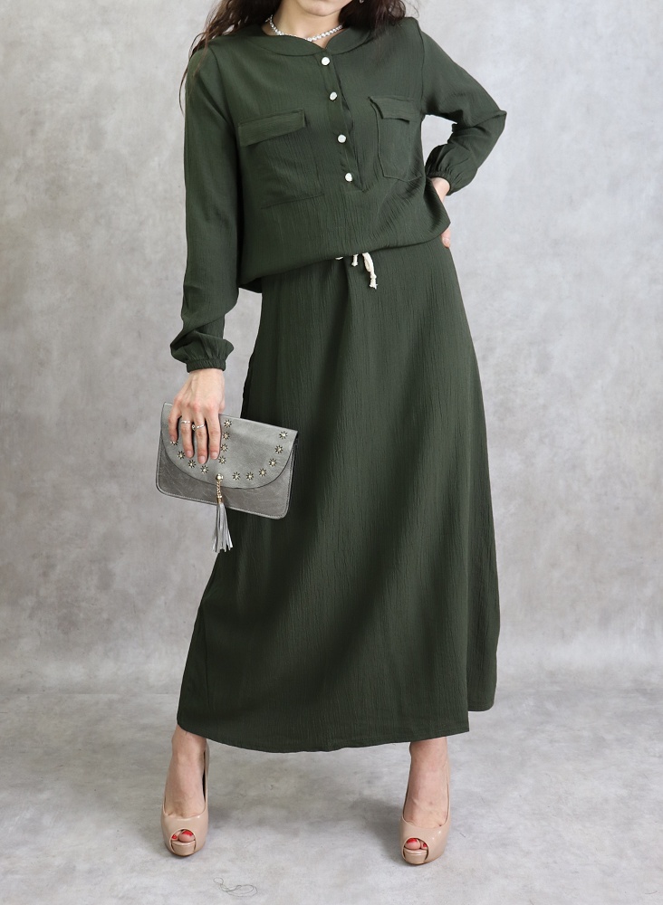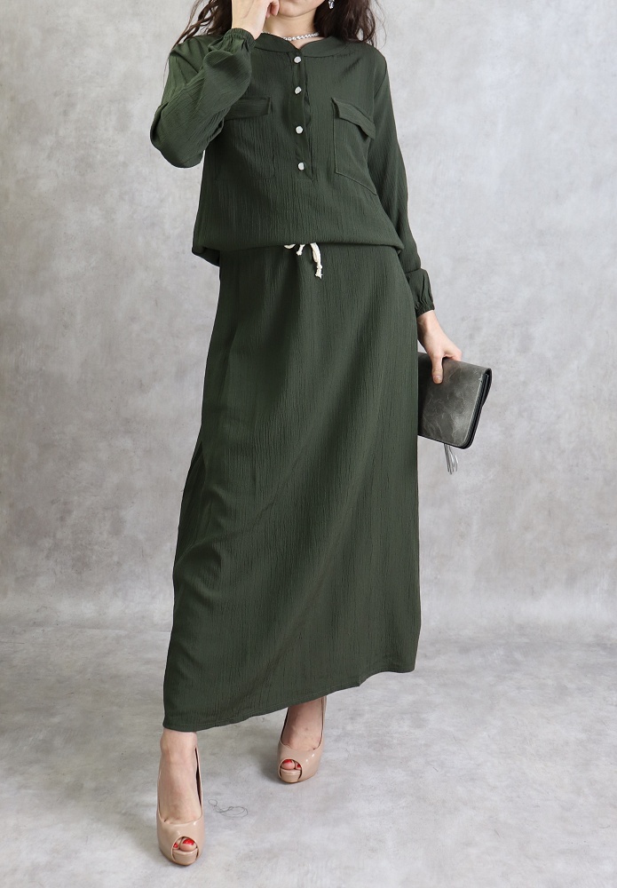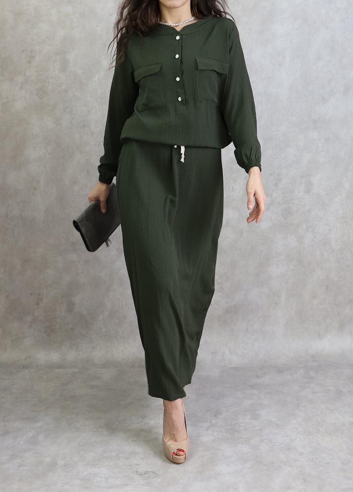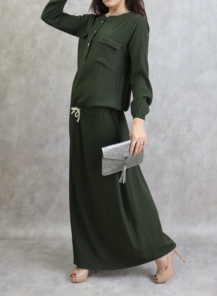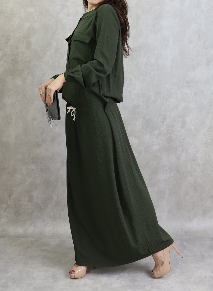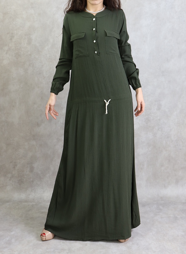 Robe longue, col rond, fermeture boutonnée devant, 2 poches plaquées, manches longues élastiques aux poignets, lien de serrage à la taille. Coupe droite, tissu fluide et opaque, effet crêpe.