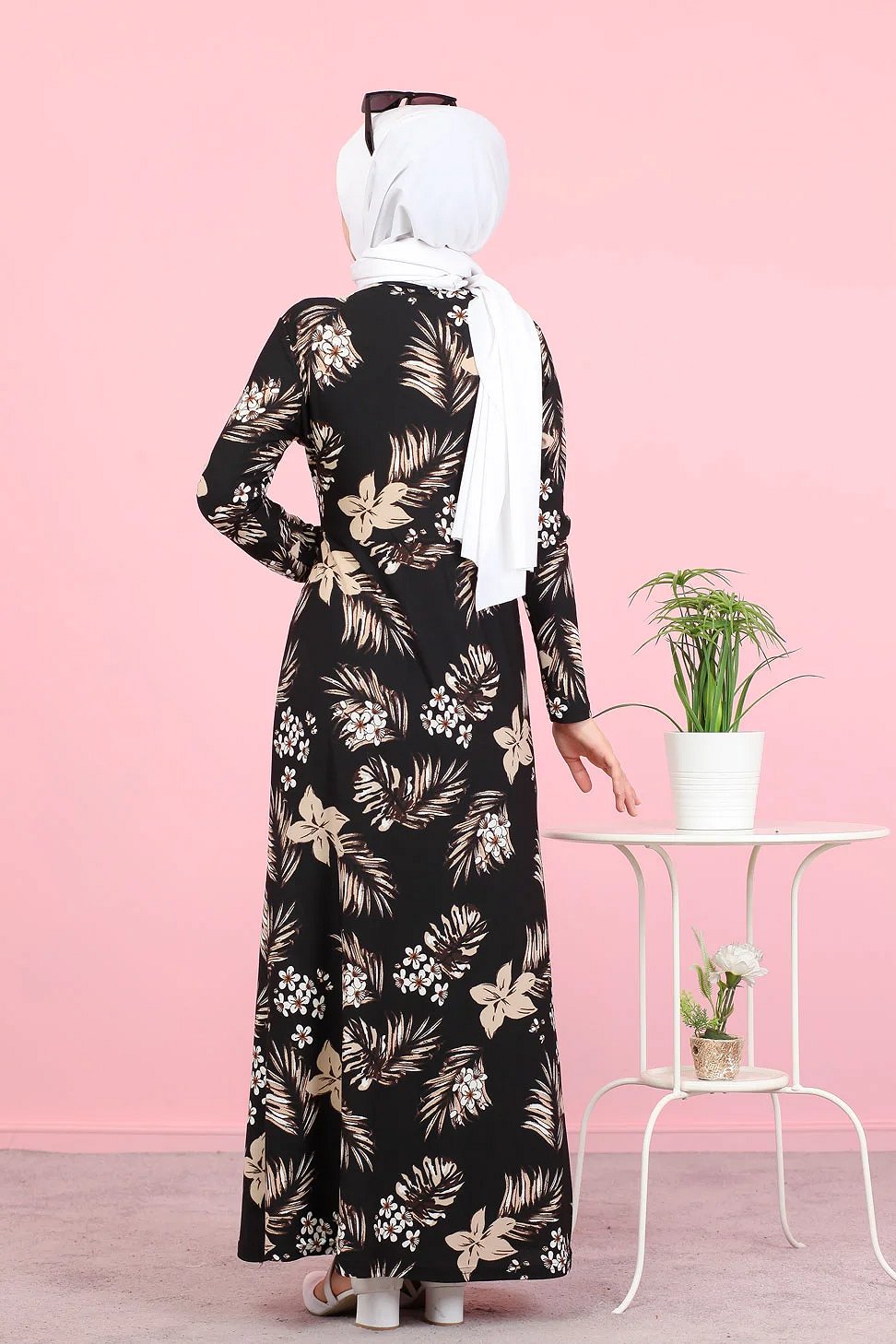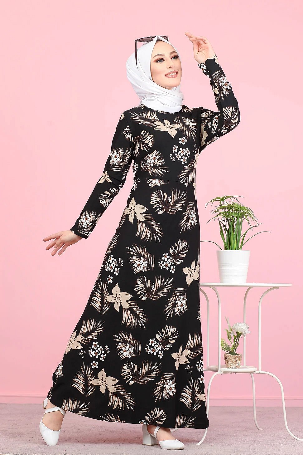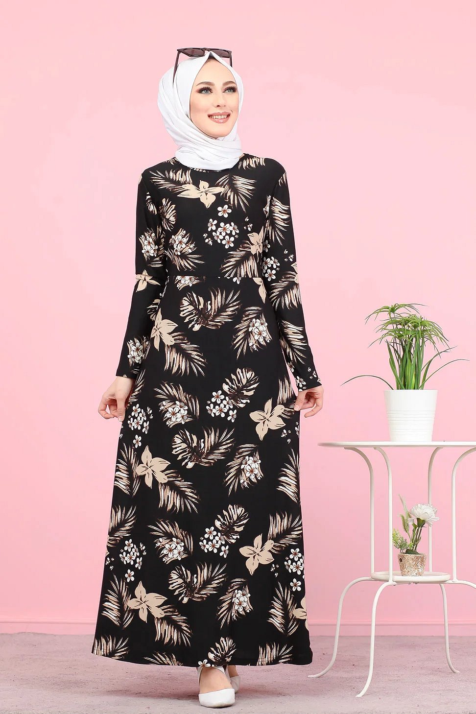 Robe longue légèrement cintrée à la taille, col rond, manches longues.