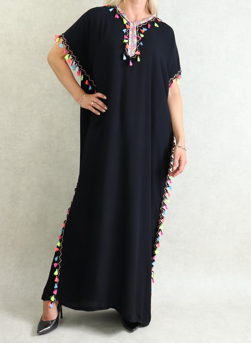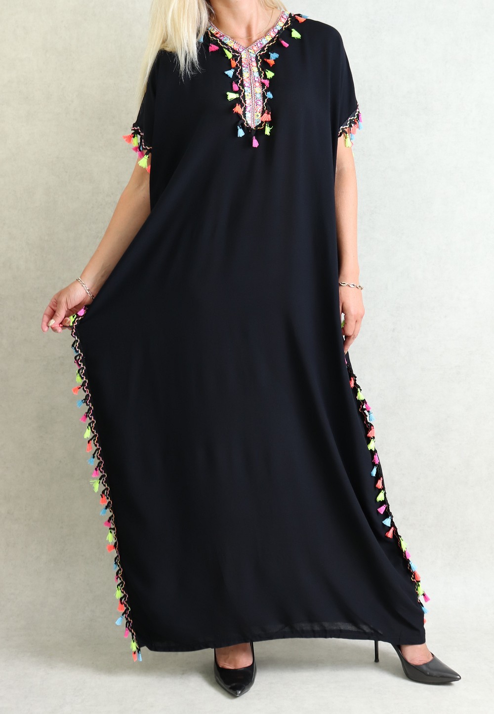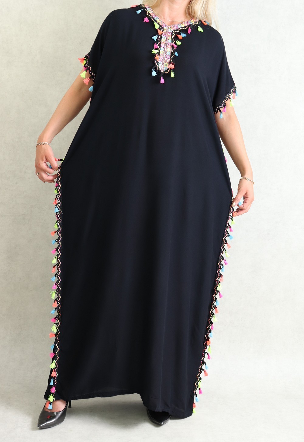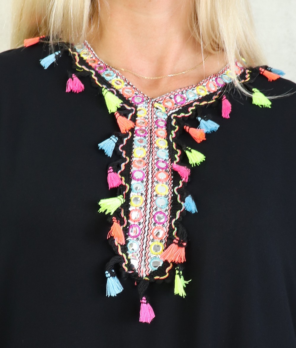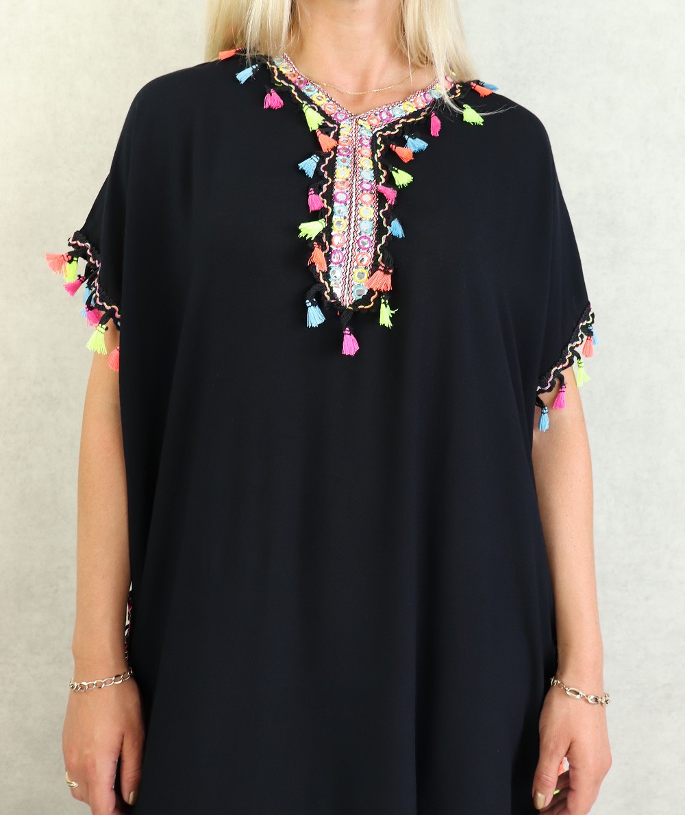 Robe orientale avec pompons multicolores (Robes pas cher pour femme) - Couleur Noir - REF. 36049 (18.00 €)
