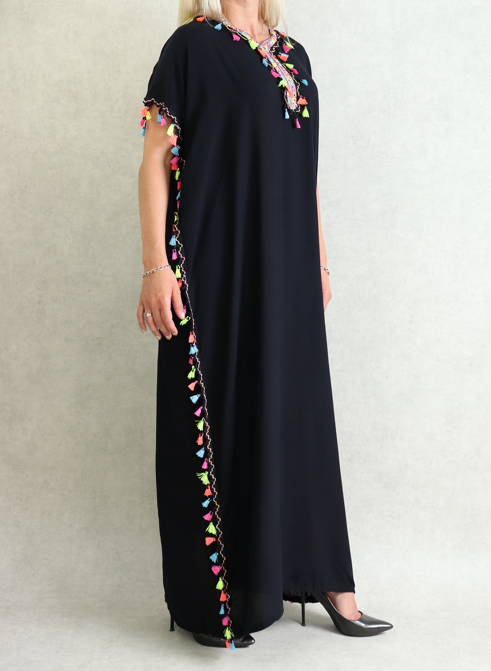 Robe noire orientale longue avec pompons multicolores et decorations pour femme