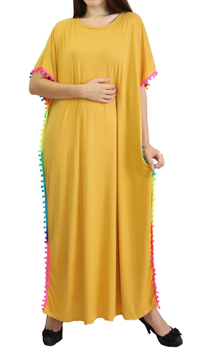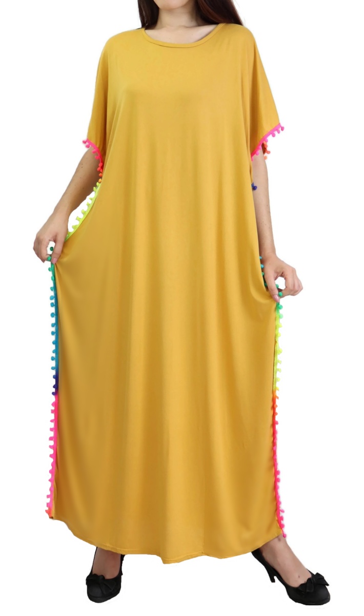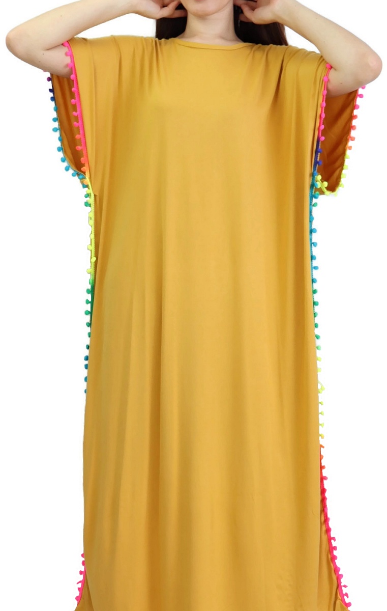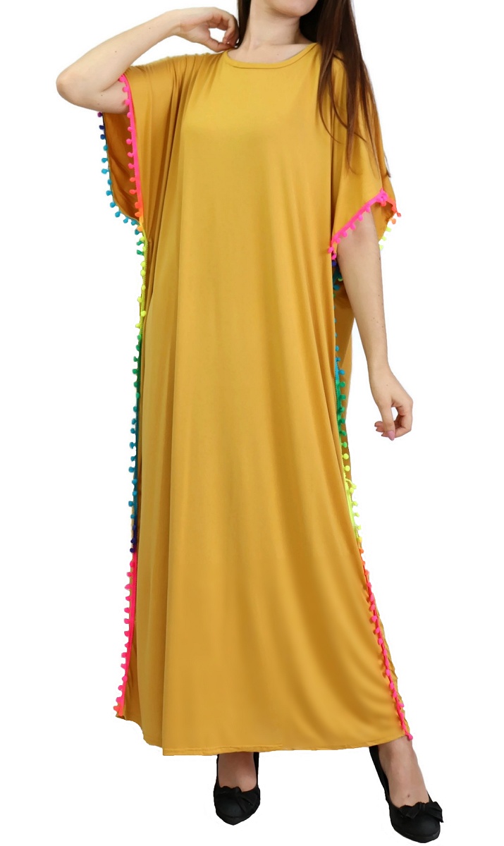 Robe orientale à pompons multicolores sur les côtés pour femme - Couleur Jaune moutarde Vetement & Accessoire
