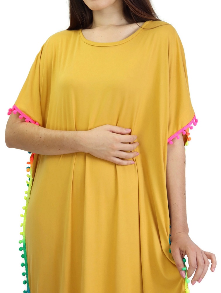 Robe orientale a pompons multicolores sur les cotes pour femme - Couleur Jaune moutarde