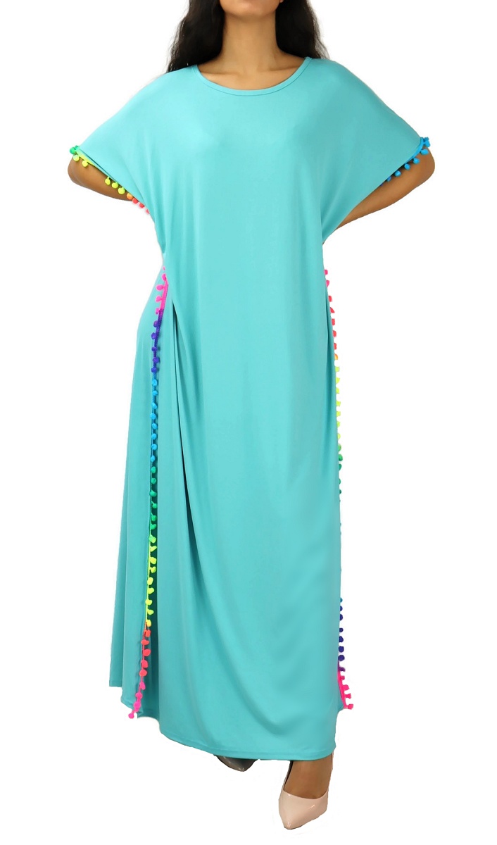 Robe orientale a pompons multicolores sur les cotes pour femme - Couleur bleu cyan