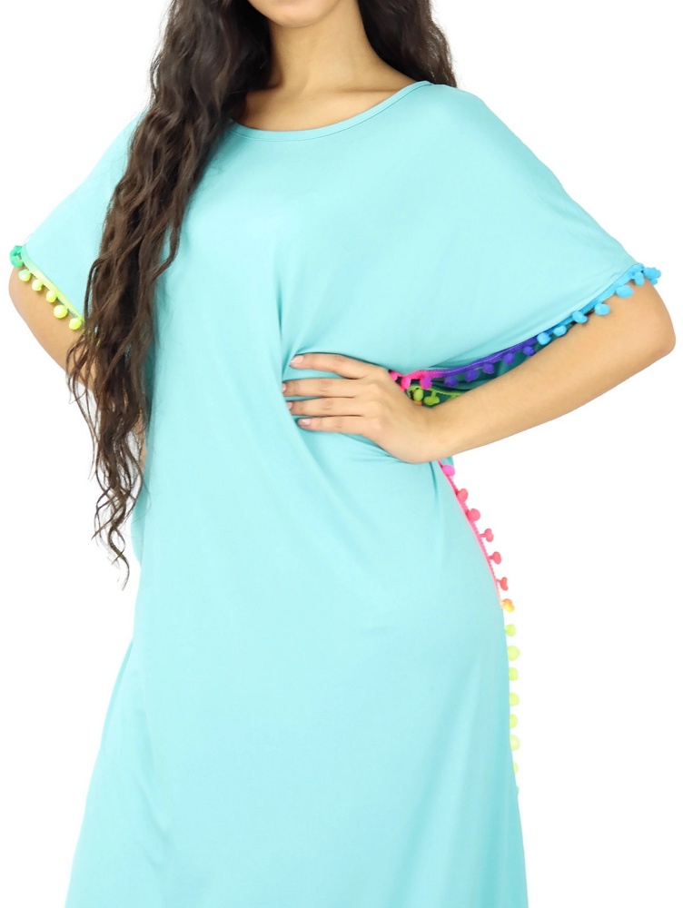 Robe orientale à pompons multicolores sur les côtés pour femme - Couleur bleu cyan Vetement & Accessoire