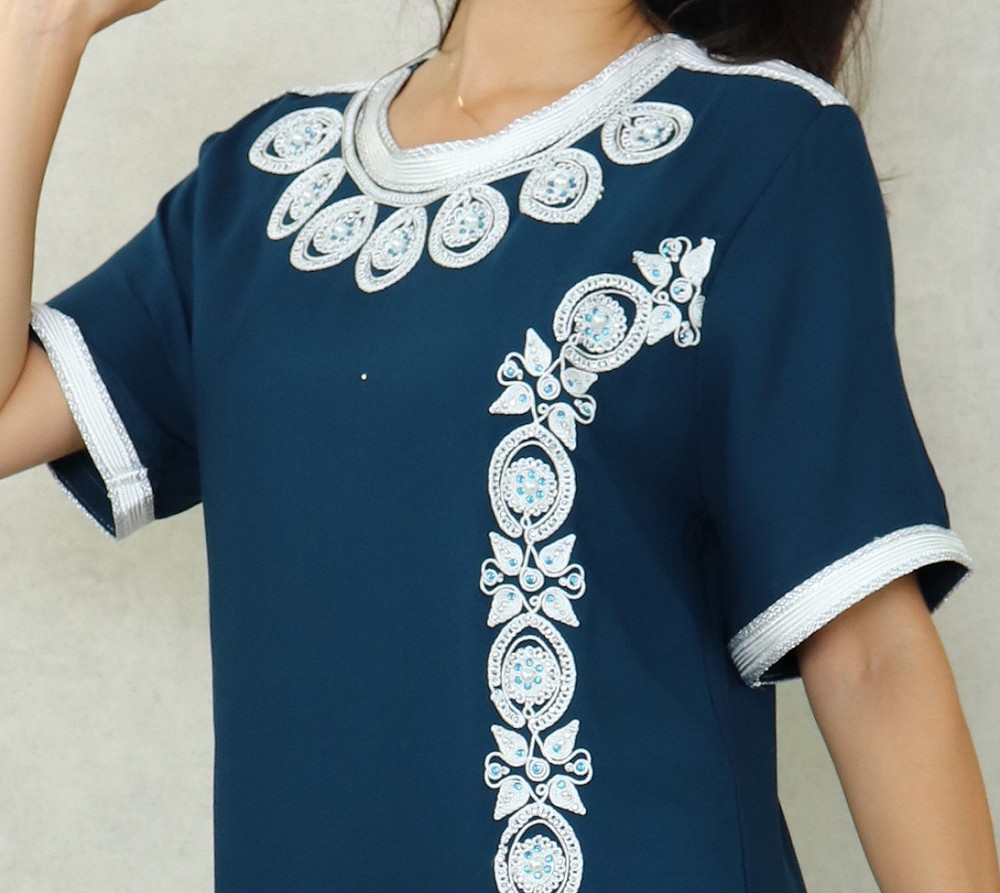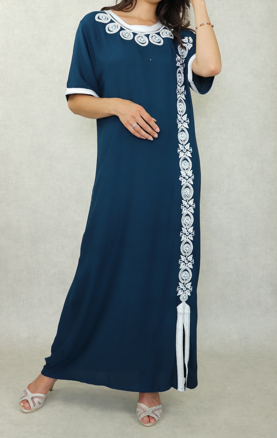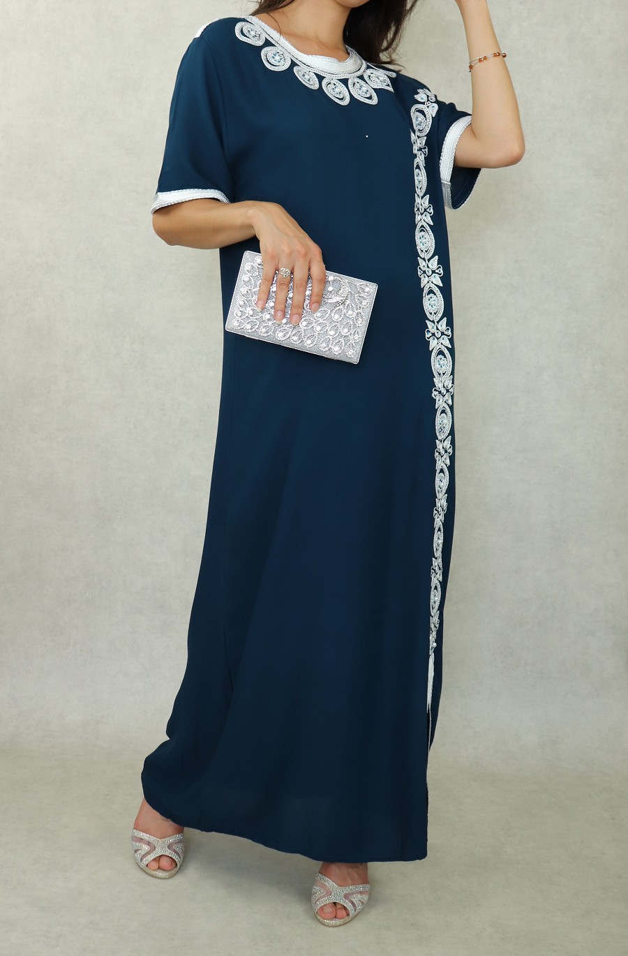 Robe orientale algérienne à manches courte brodée et perlée pour femme - Couleur Bleu marine Vetement & Accessoire