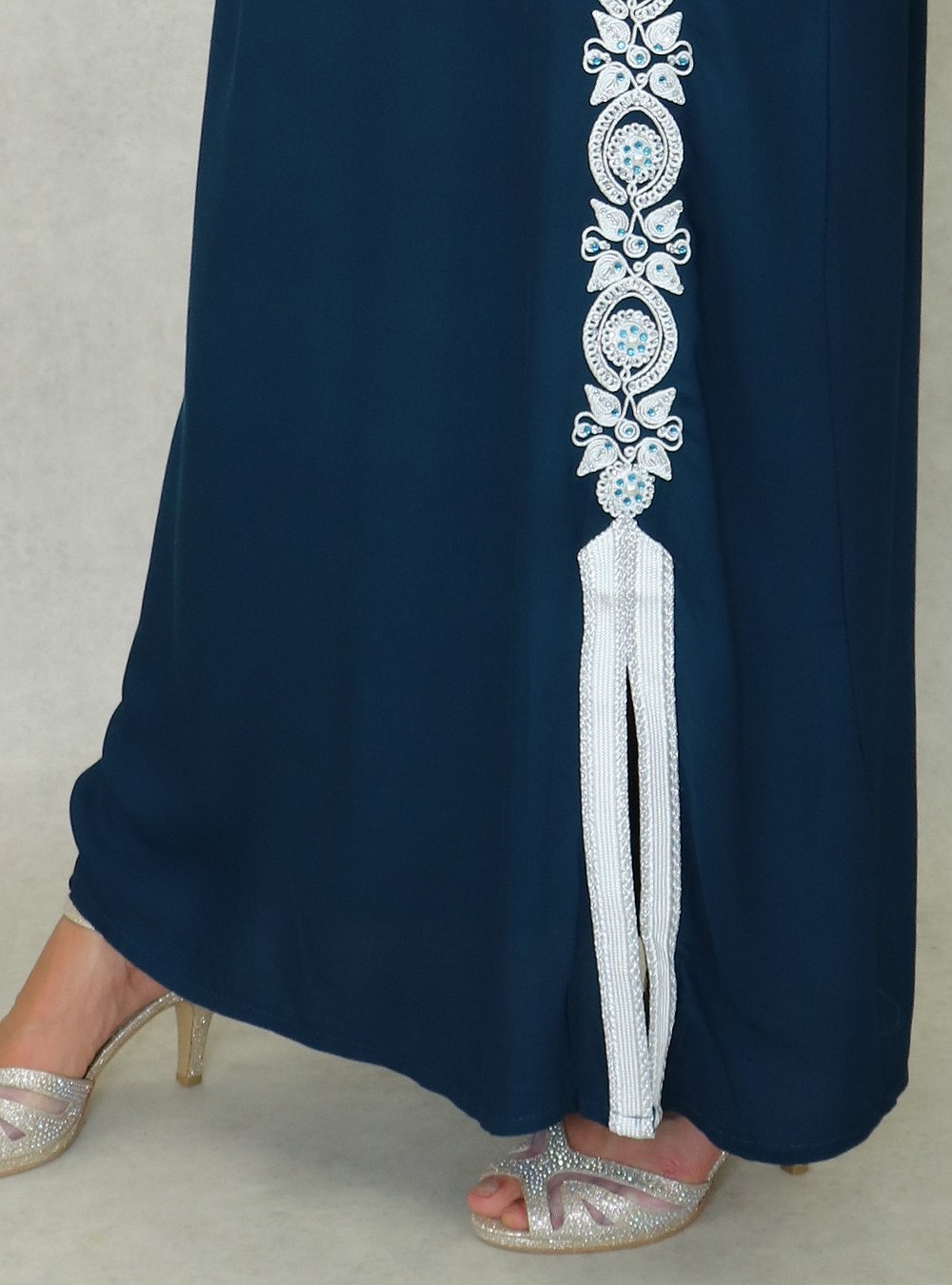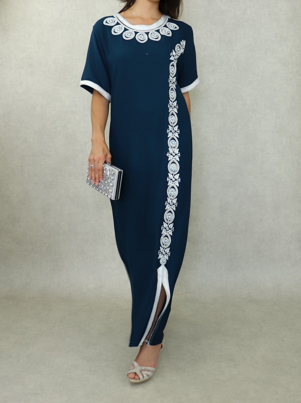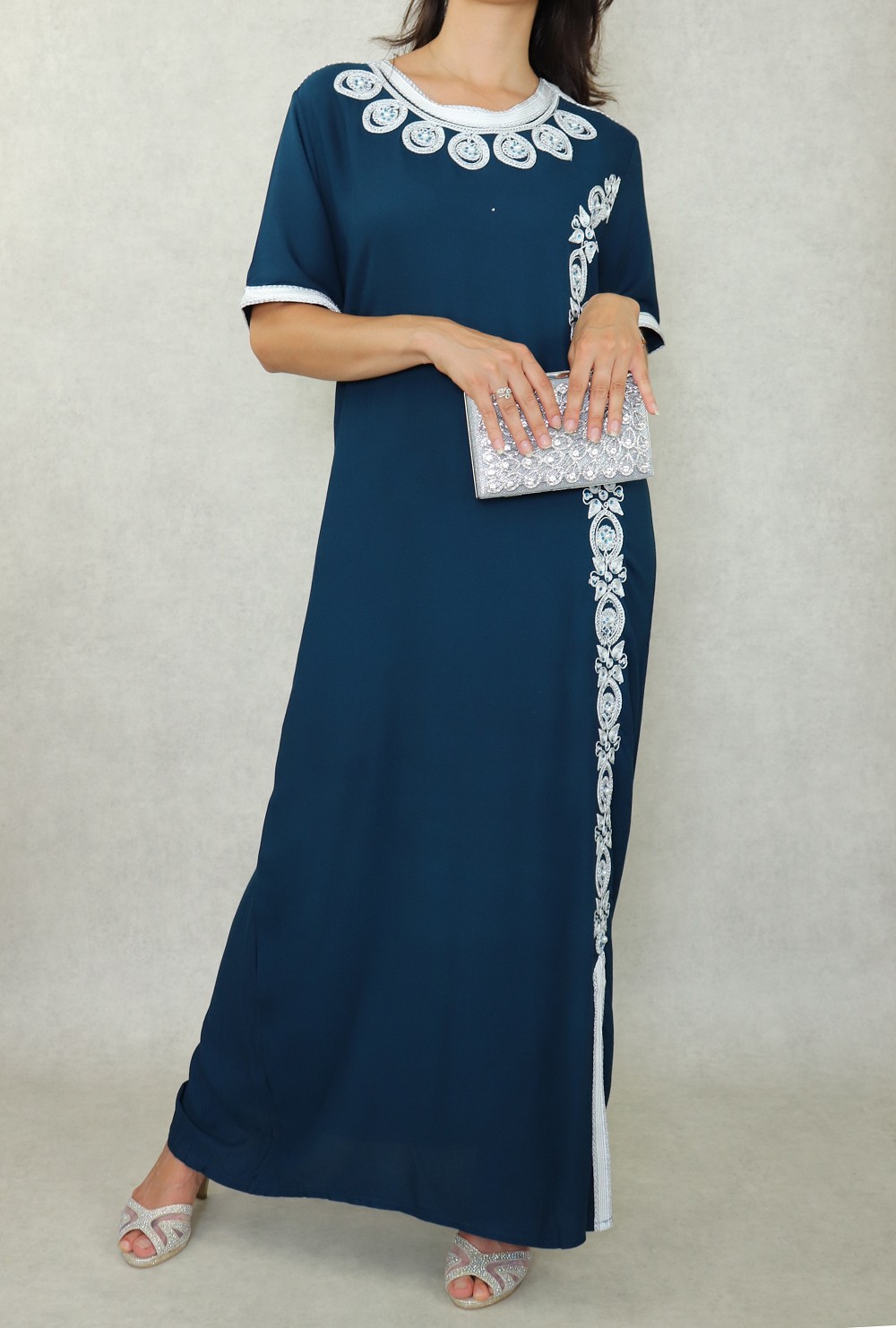 Robe orientale algérienne à manches courte brodée et perlée pour femme - Couleur Bleu marine Vetement & Accessoire