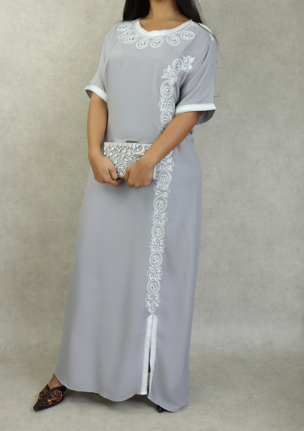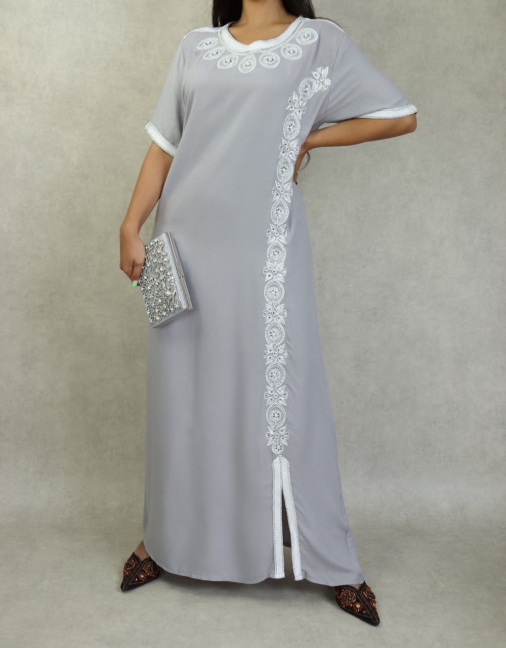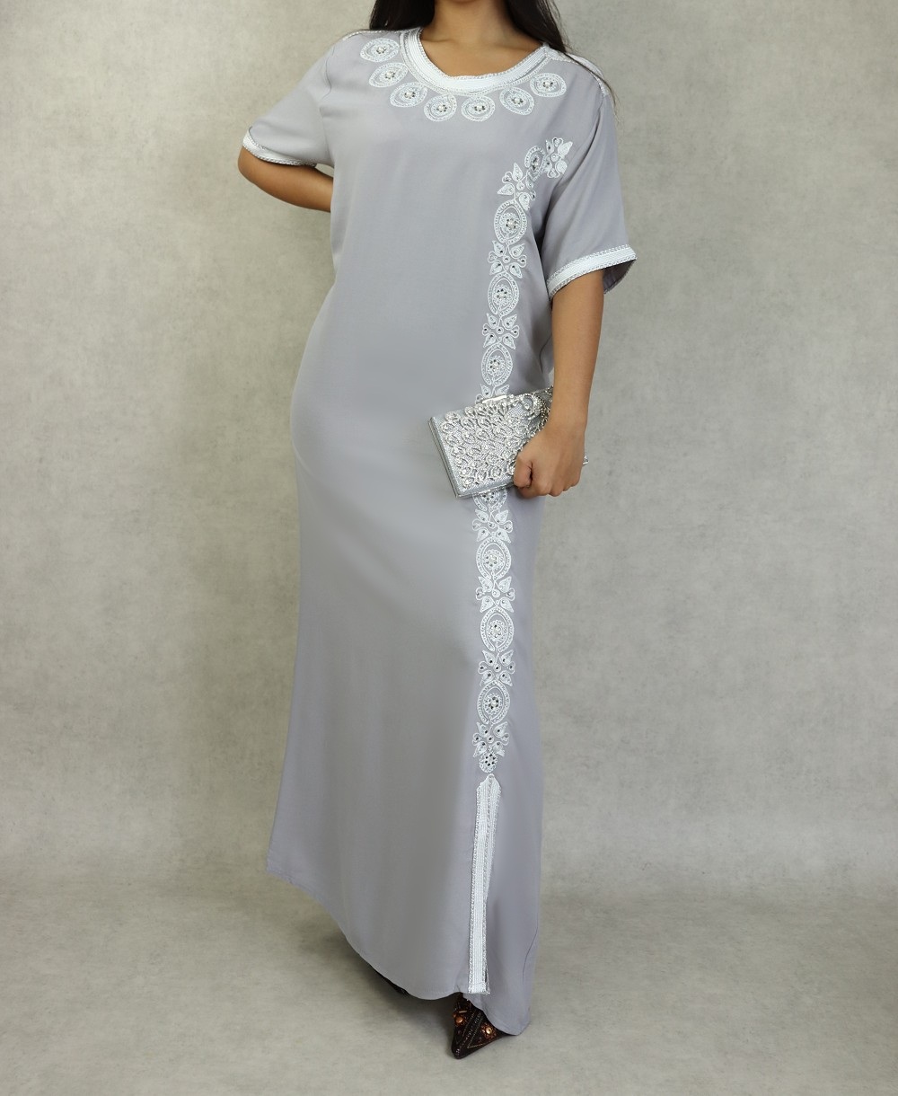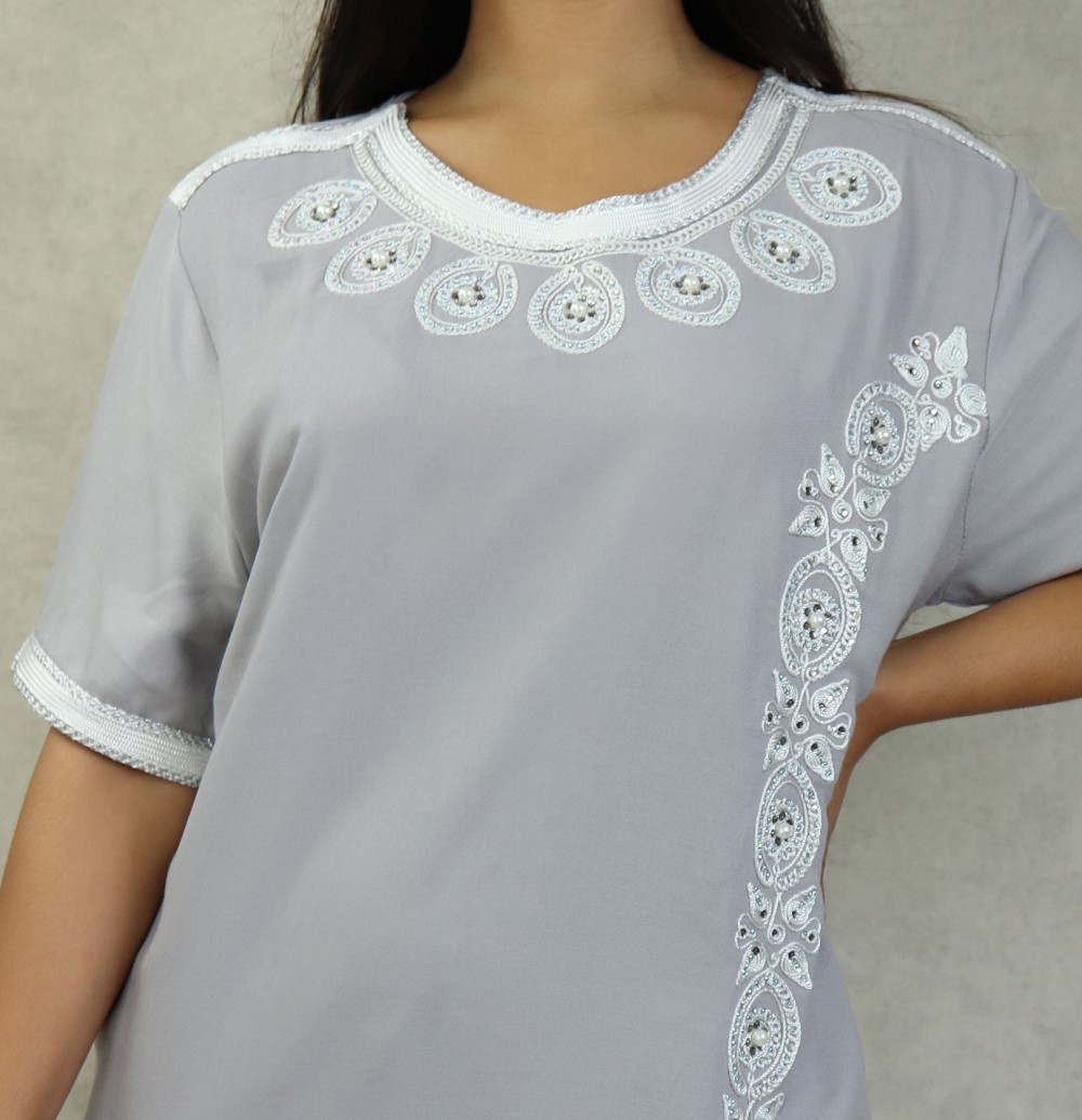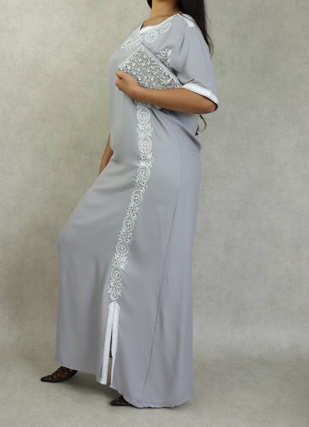 Robe orientale algérienne à manches courte brodée et perlée pour femme - Couleur Gris Vetement & Accessoire