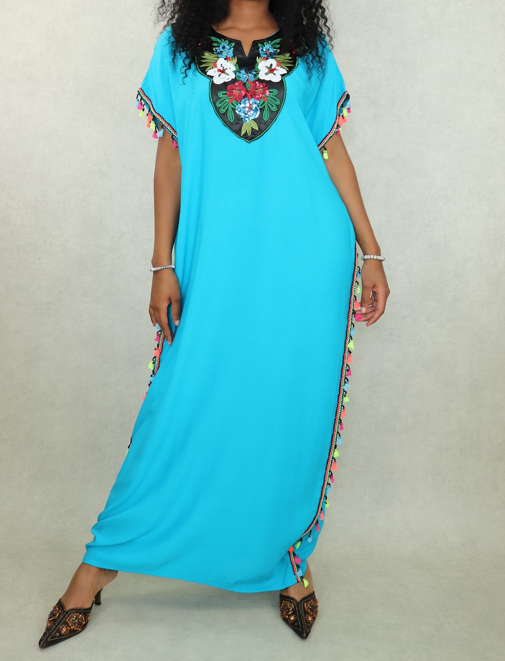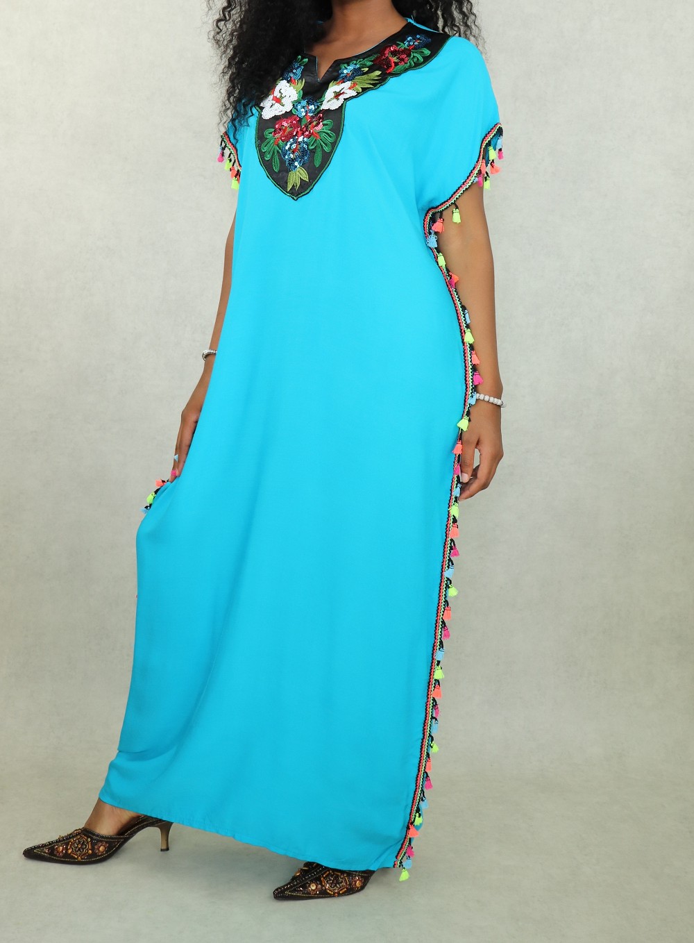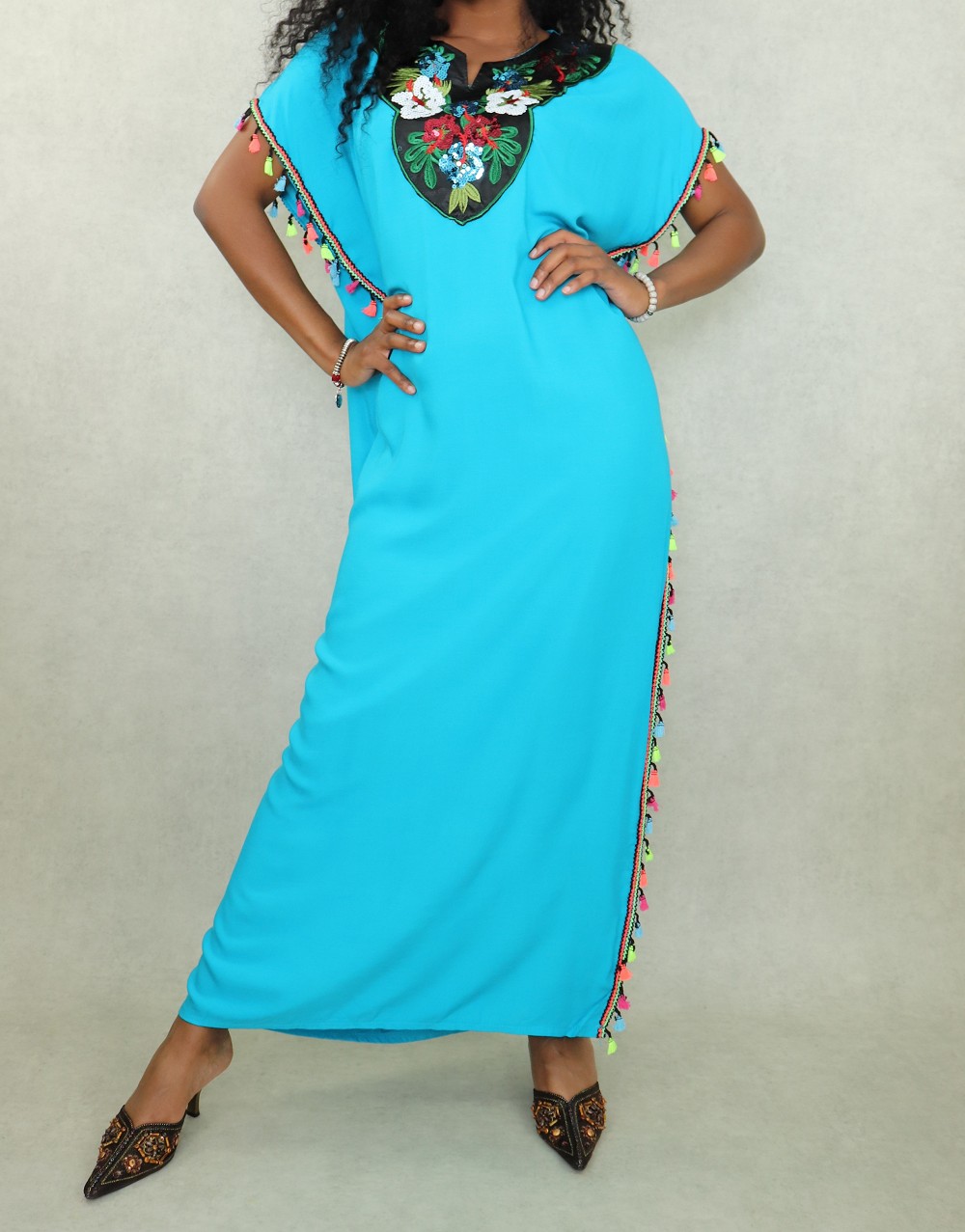 Cette belle robe longue coupe droite, ornée avec de jolis strass et motifs fleuris. Décorée sur les côtés avec des pompons multicolores.