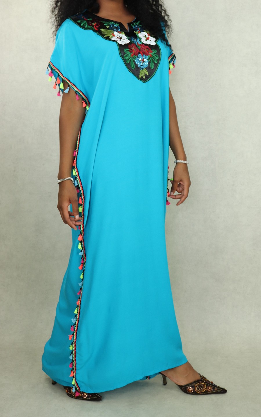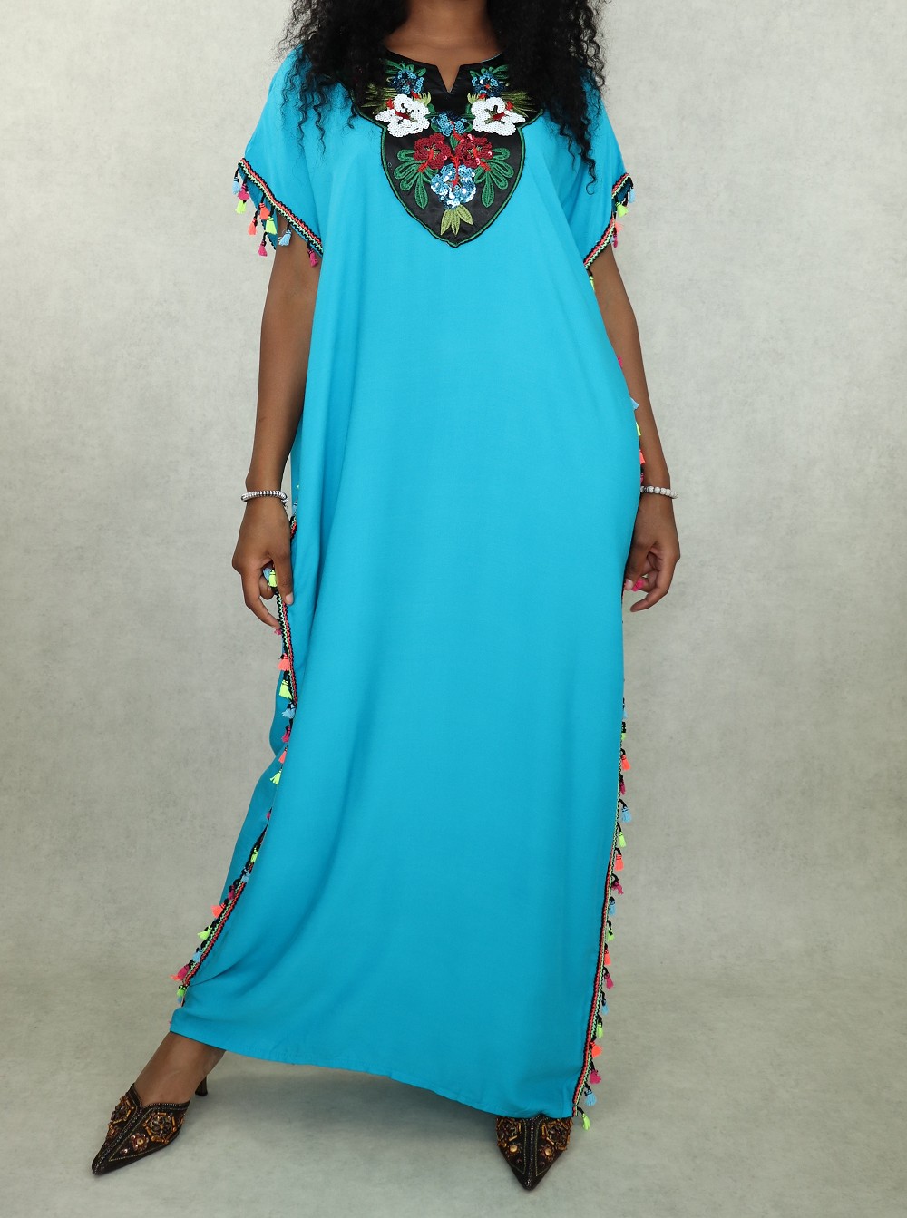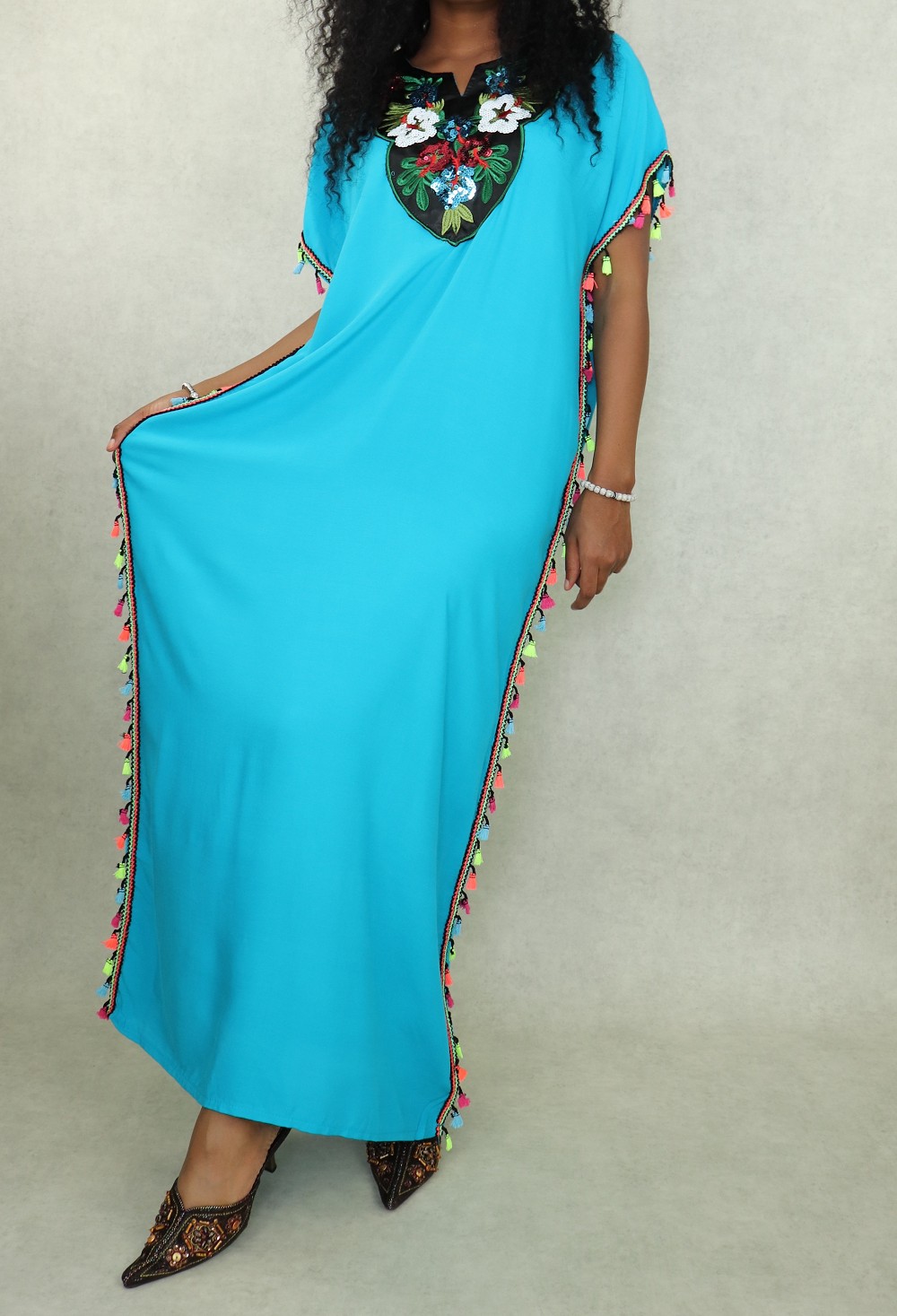 Cette belle robe longue coupe droite, ornée avec de jolis strass et motifs fleuris. Décorée sur les côtés avec des pompons multicolores.