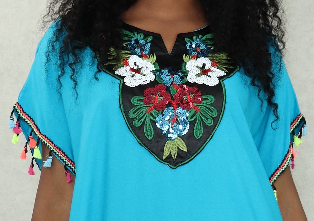 Robe orientale avec strass et pompons multi-couleur en coton pour femme - Couleur Bleu Vetement & Accessoire