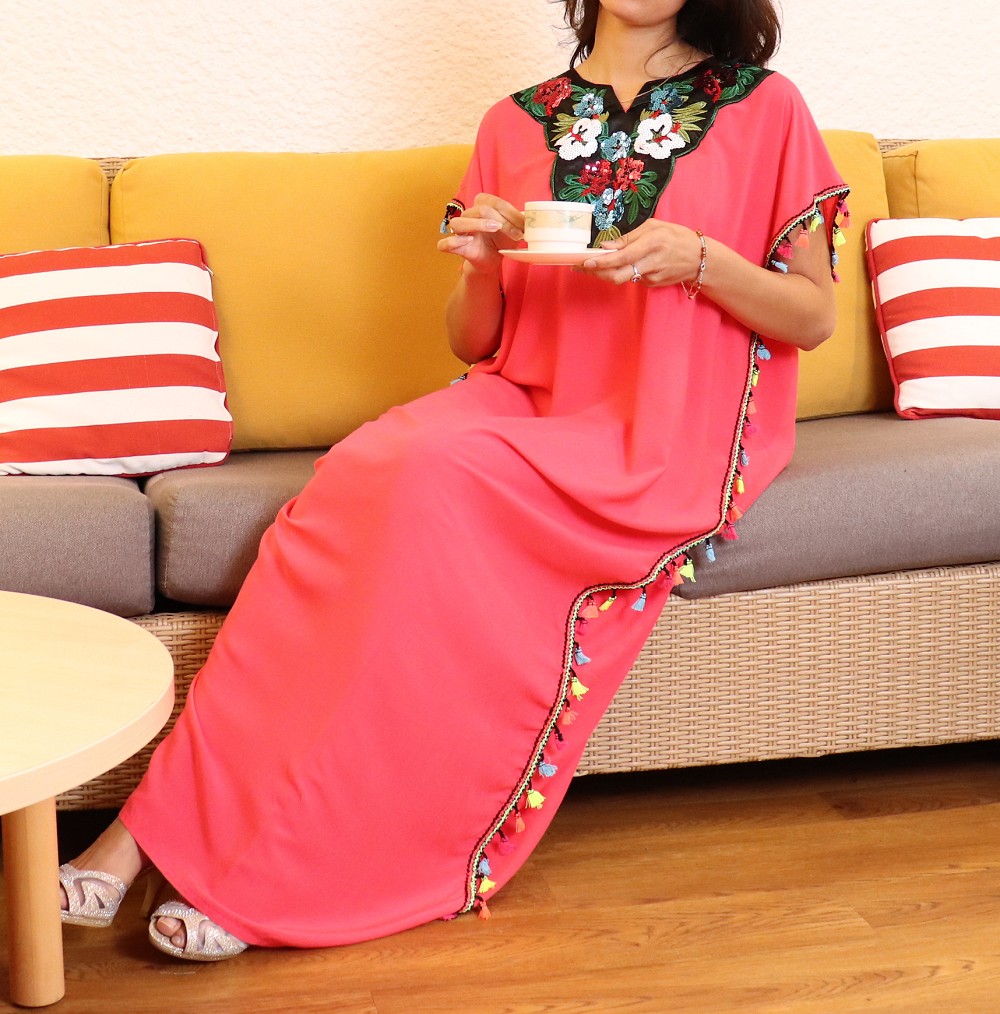 Robe orientale avec strass et pompons multi-couleur en coton pour femme - Couleur Corail Vetement & Accessoire