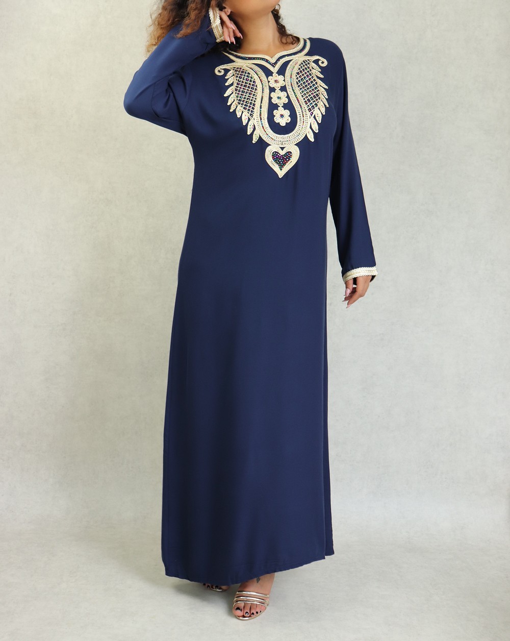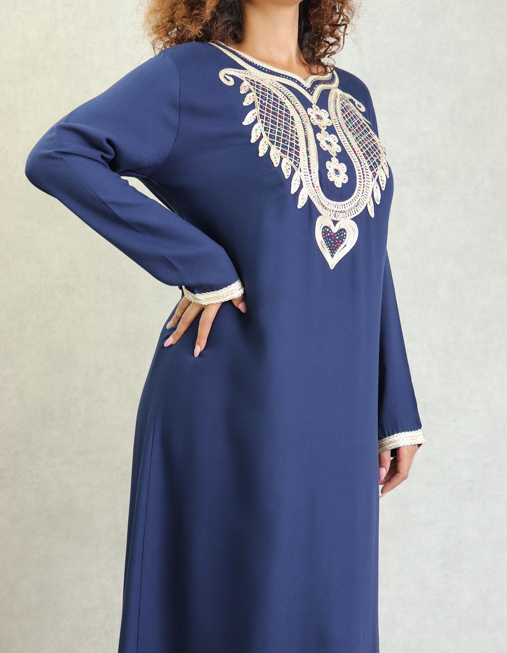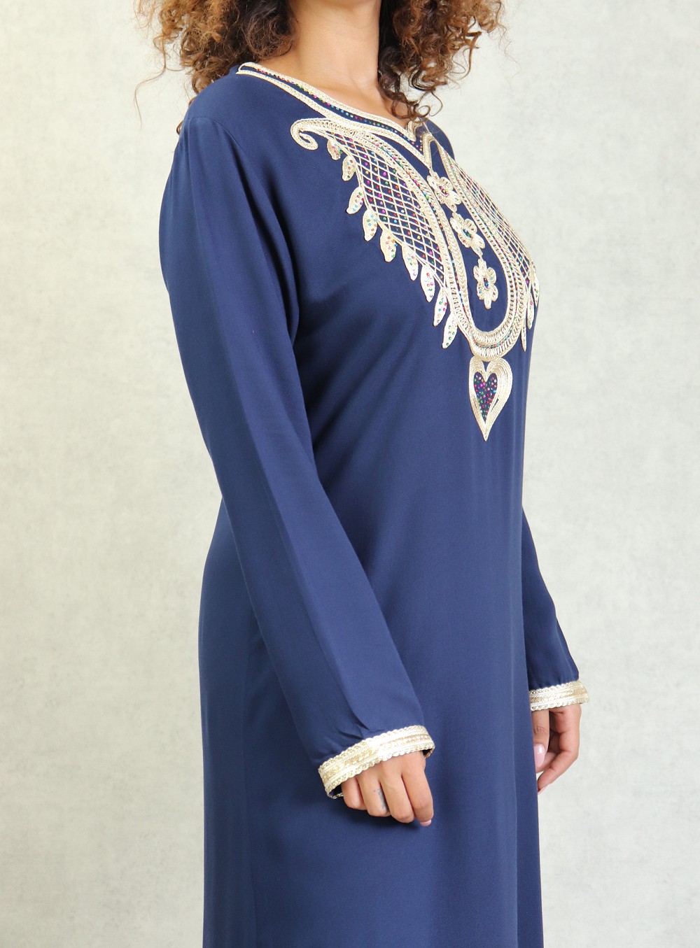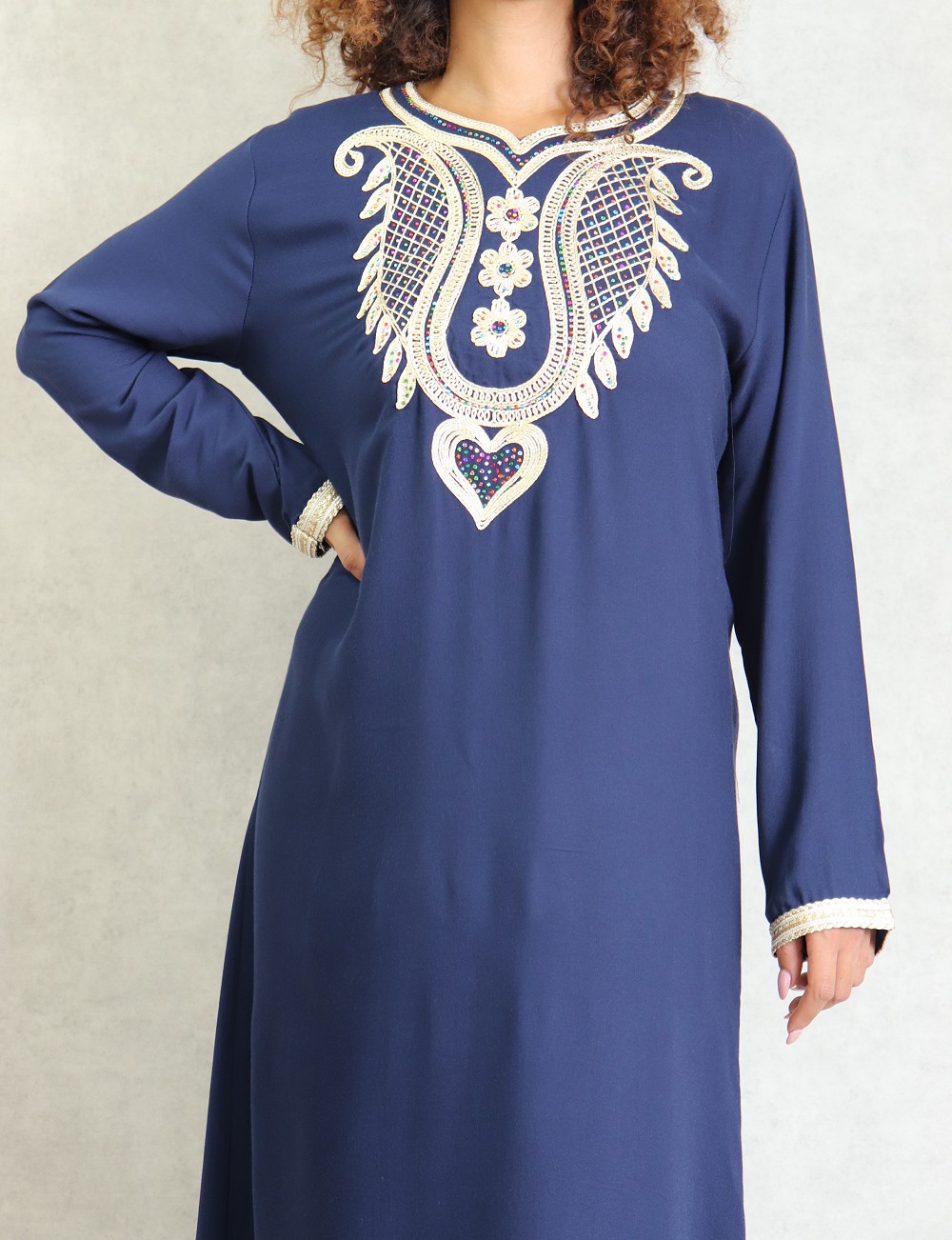 Robe longue, col en cœur, broderies orientale et des strasse multi-couleurs. Modèle classique et sobre, sera parfait pour le quotidien, son style et sa matière vous mettront tout de suite à l'aise.