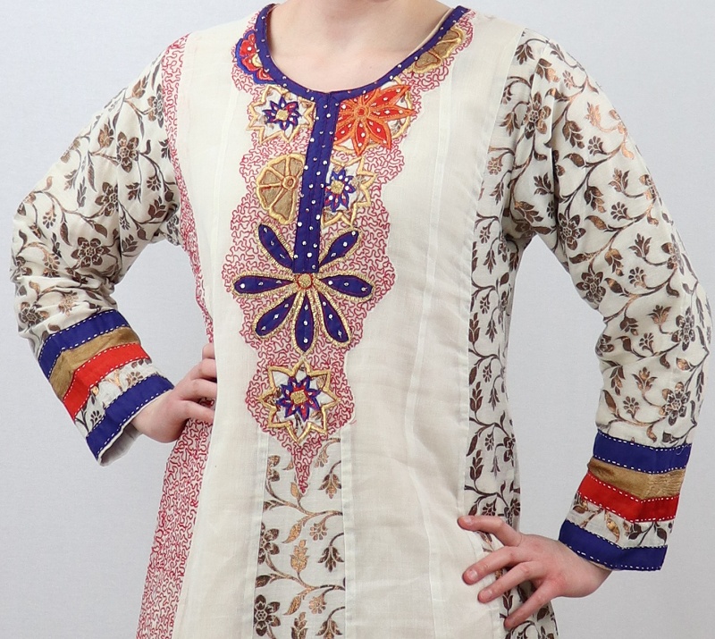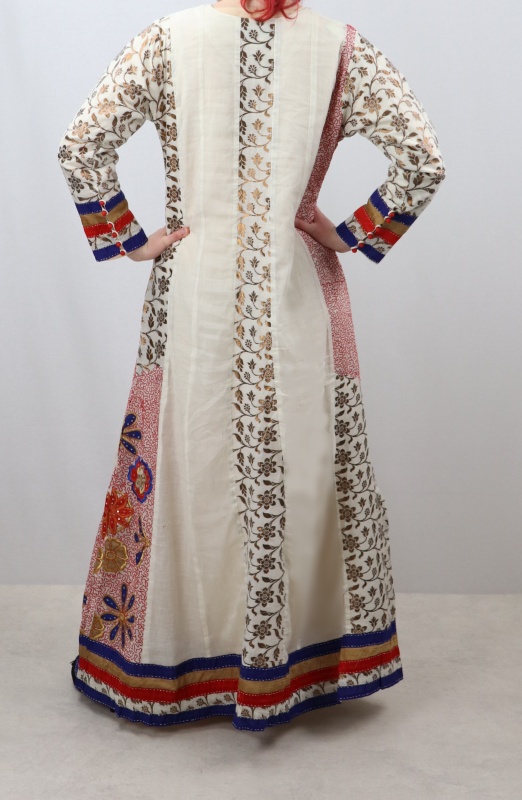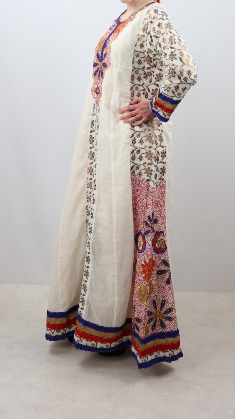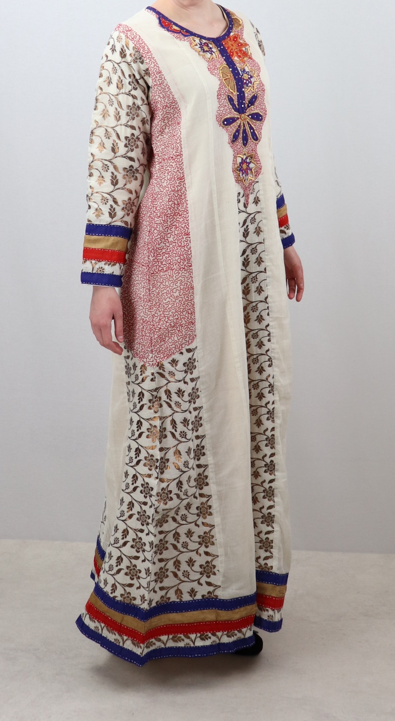 Superbe robe de soirée orientale couleur blanc cassé fabriquée en Inde avec de jolies broderies. Féminine et originale, elle souligne très légèrement votre silhouette mais n'en dévoile pas les contours.