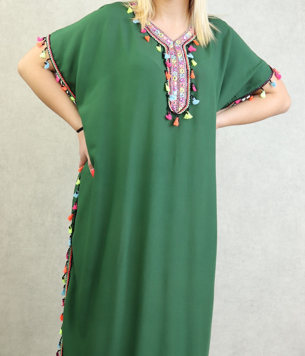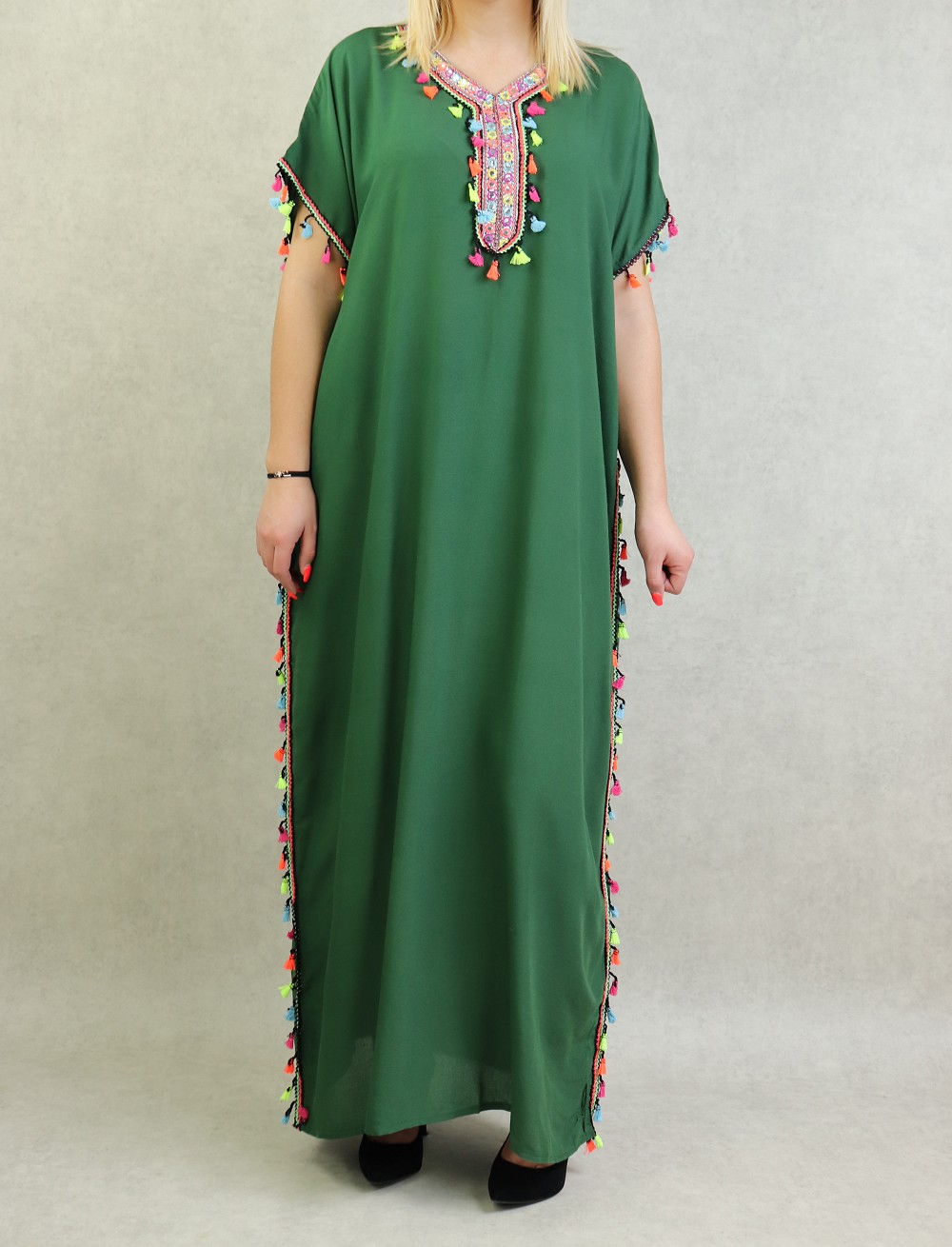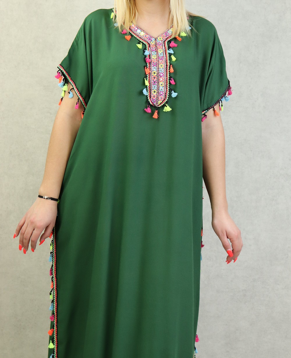 Robe orientale extra large avec pompons multicolores avec effet miroirs au niveau de l'encolure - Couleur Vert