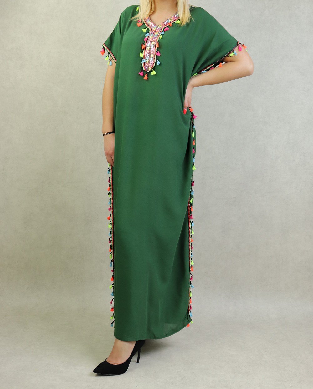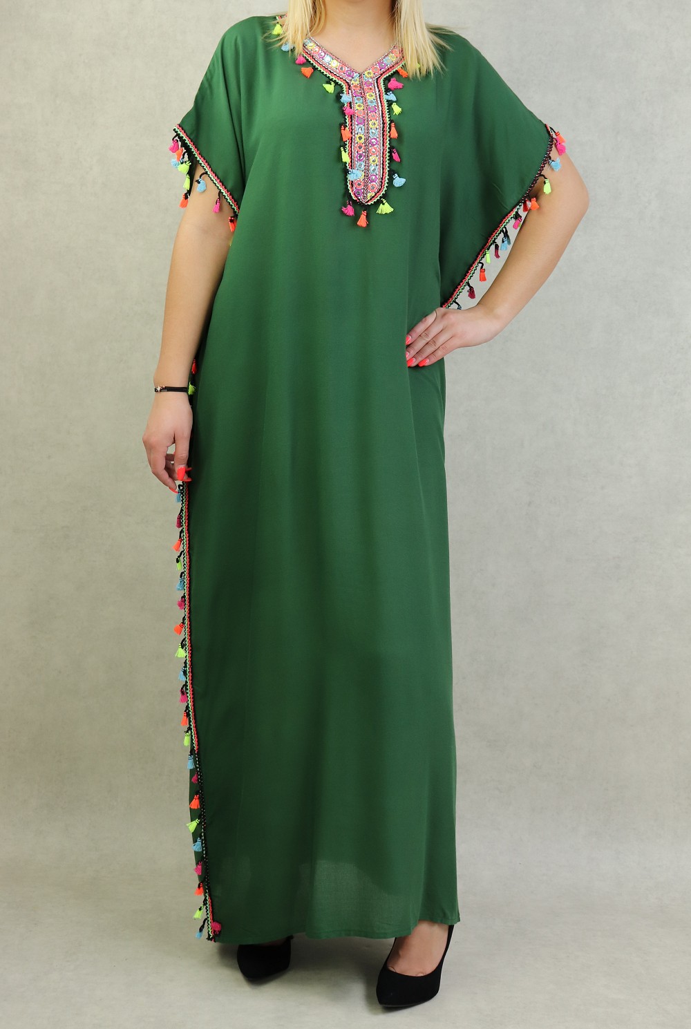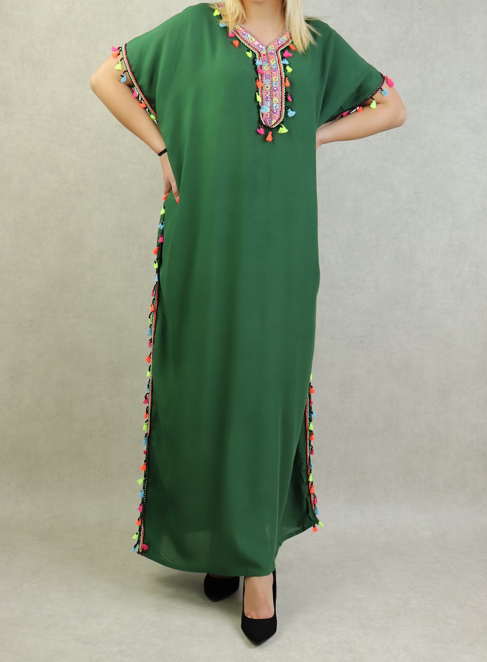 Robe orientale extra large avec pompons multicolores avec effet miroirs au niveau de l'encolure - Couleur Vert