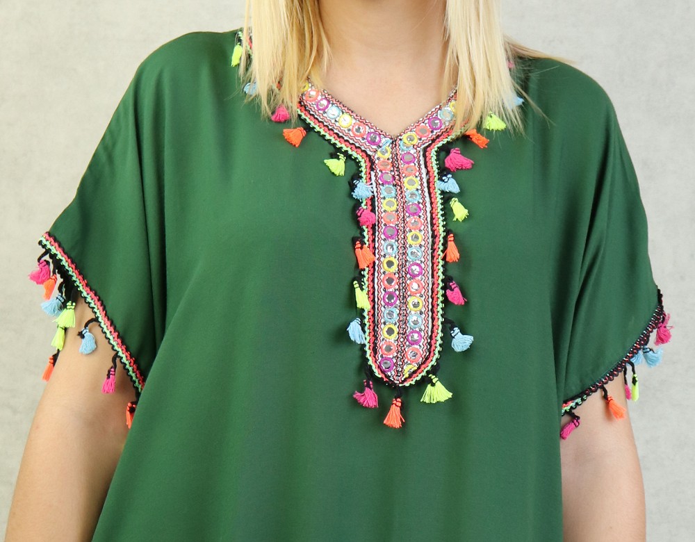 Robe orientale extra large avec pompons multicolores avec effet miroirs au niveau de l'encolure - Couleur Vert Vetement & Accessoire