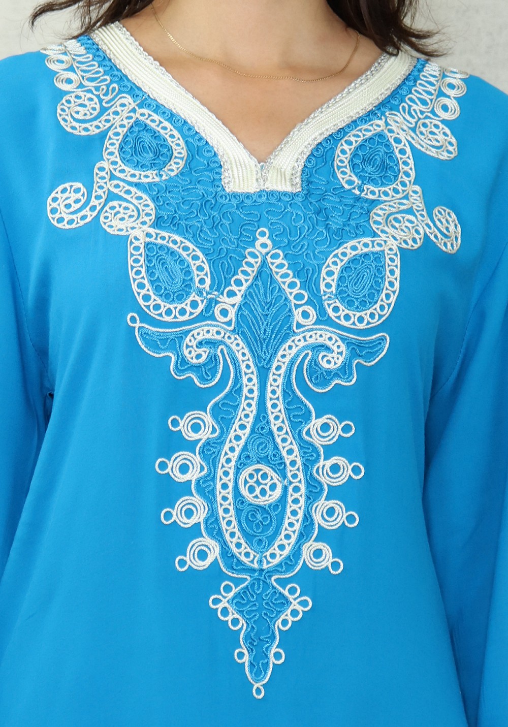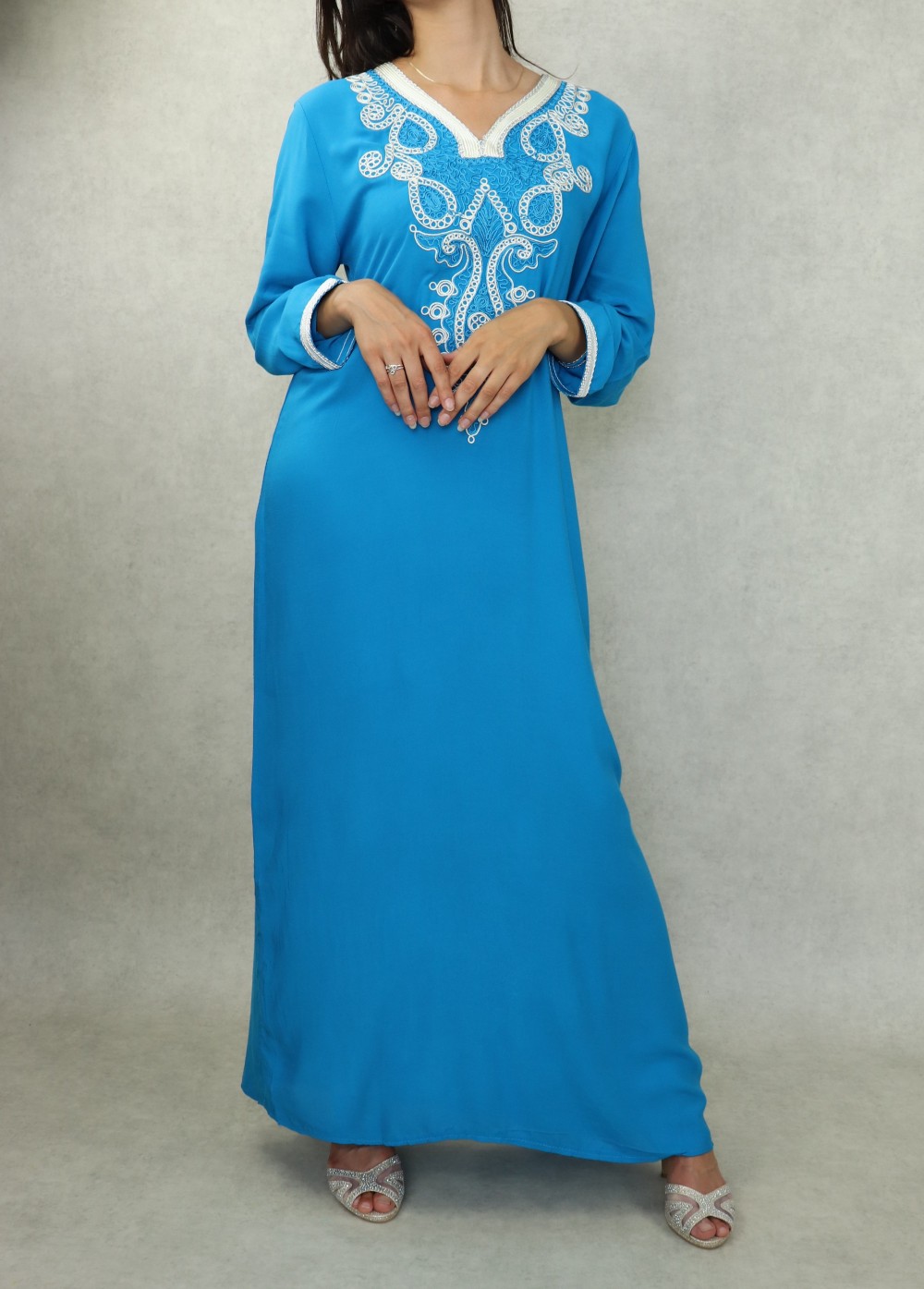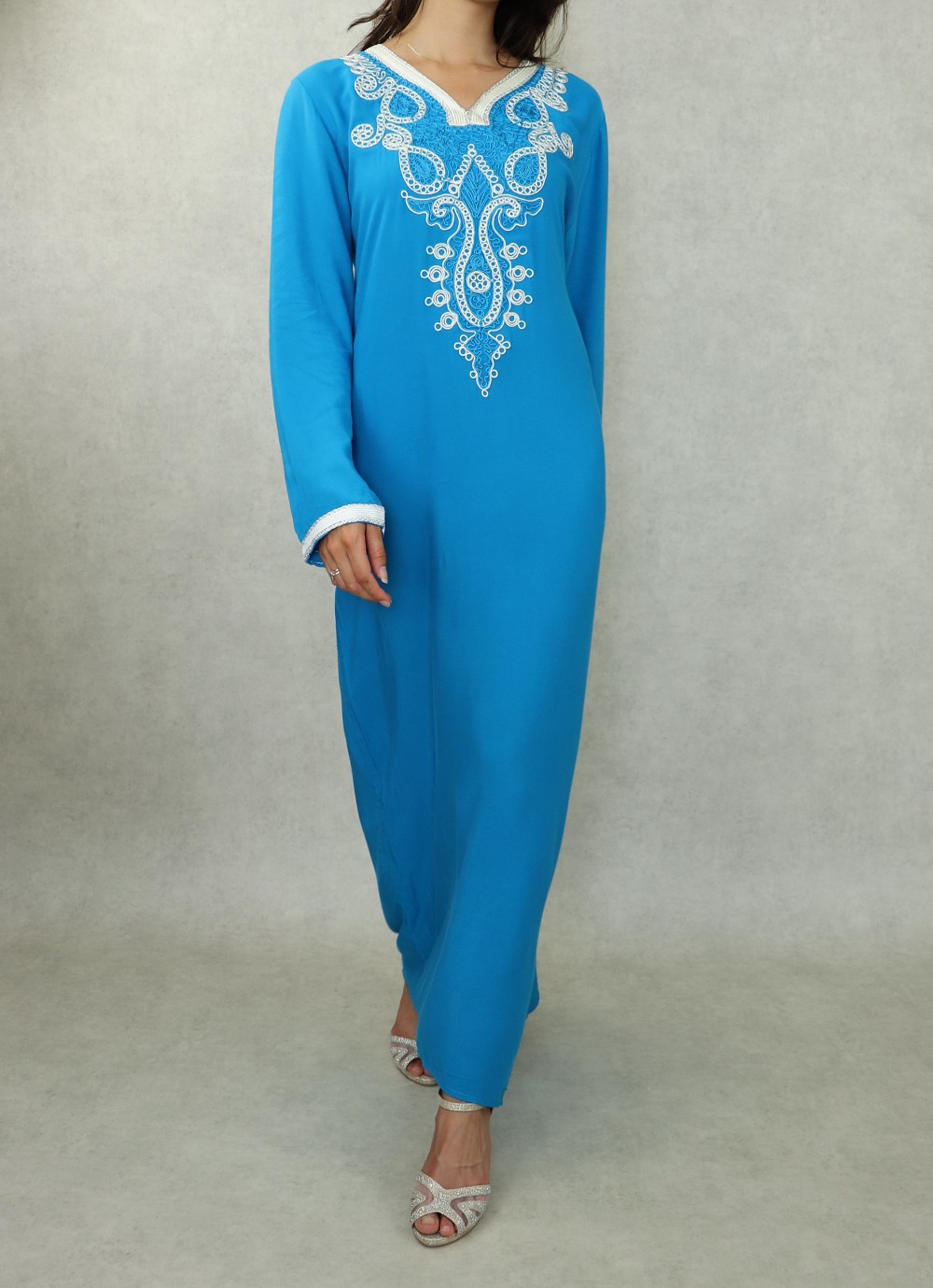 Robe longue, col en V, manches longues décorées de broderies aux poignets ainsi que sur tout le buste. Coupe droite, tissu doux et fluide