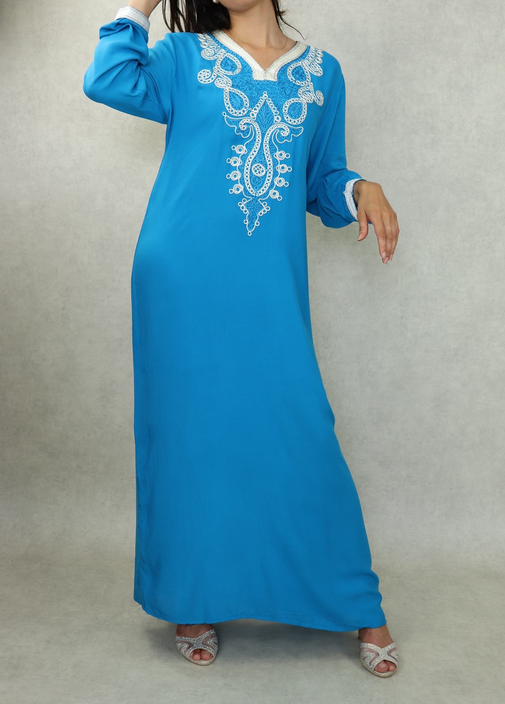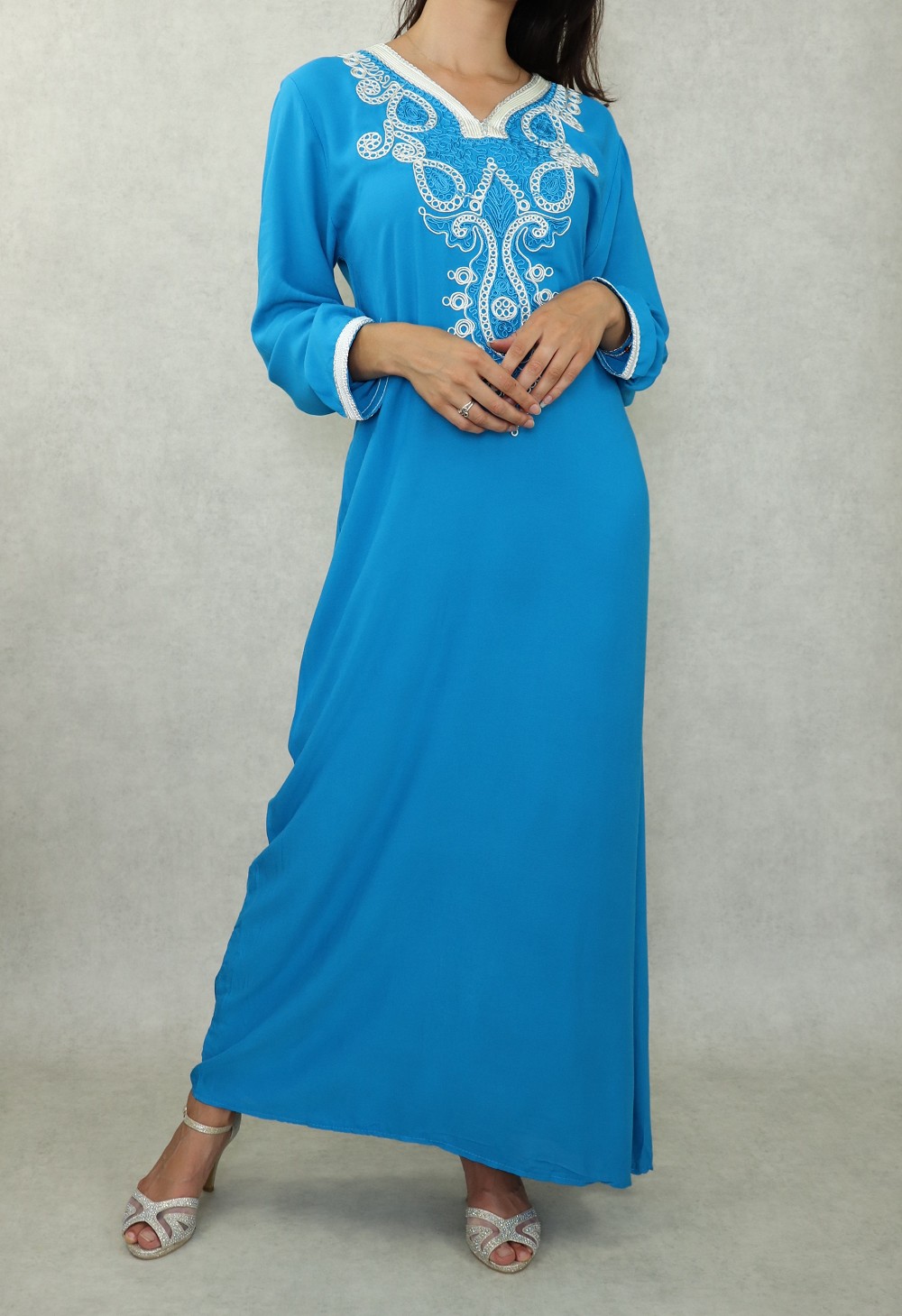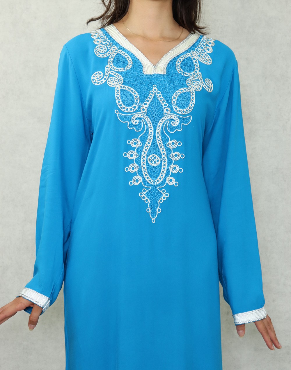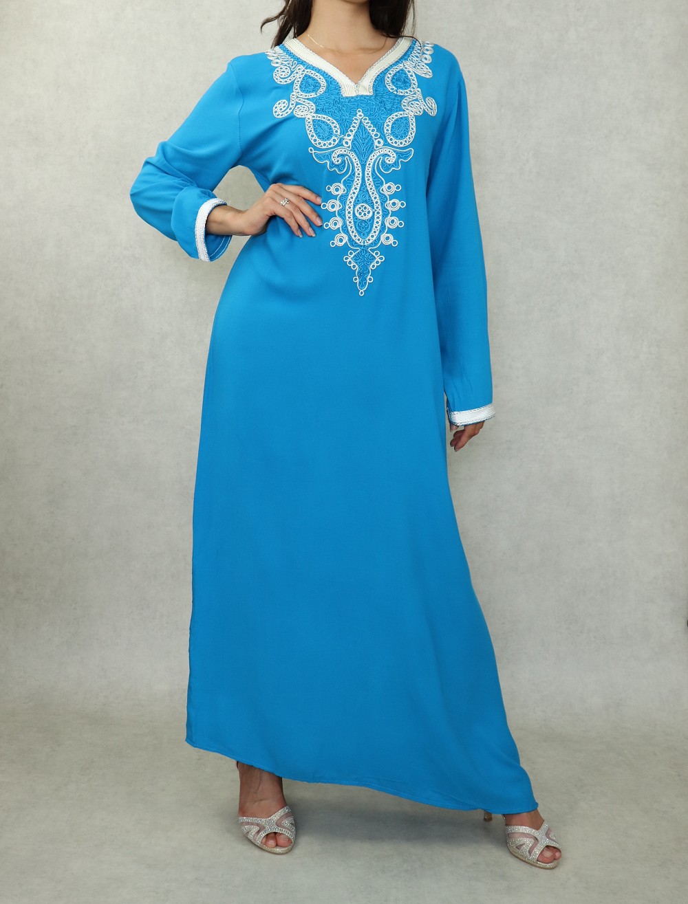 Robe longue, col en V, manches longues décorées de broderies aux poignets ainsi que sur tout le buste. Coupe droite, tissu doux et fluide