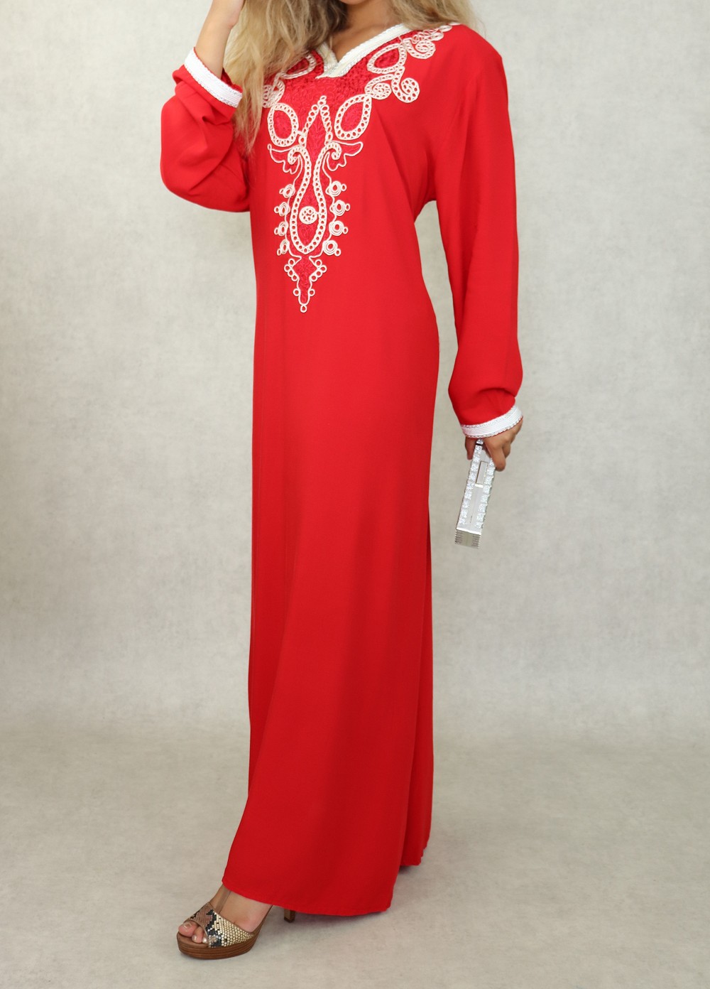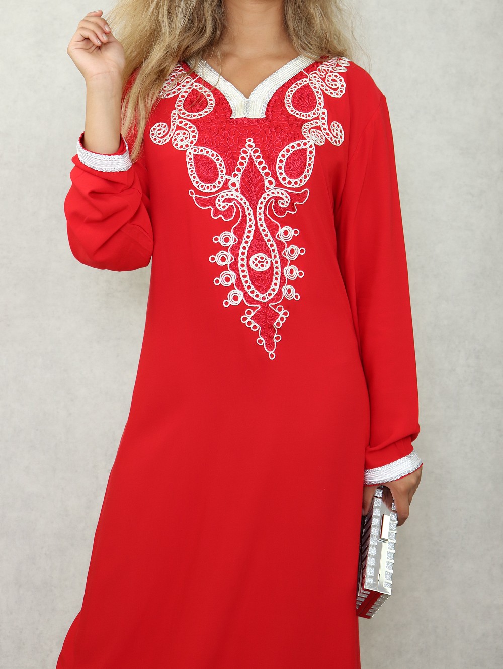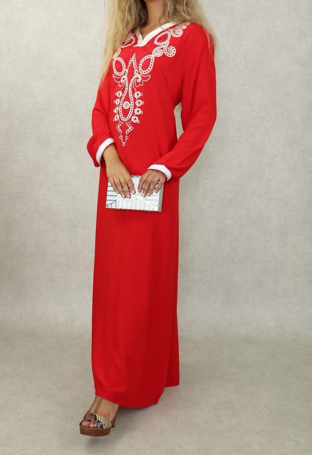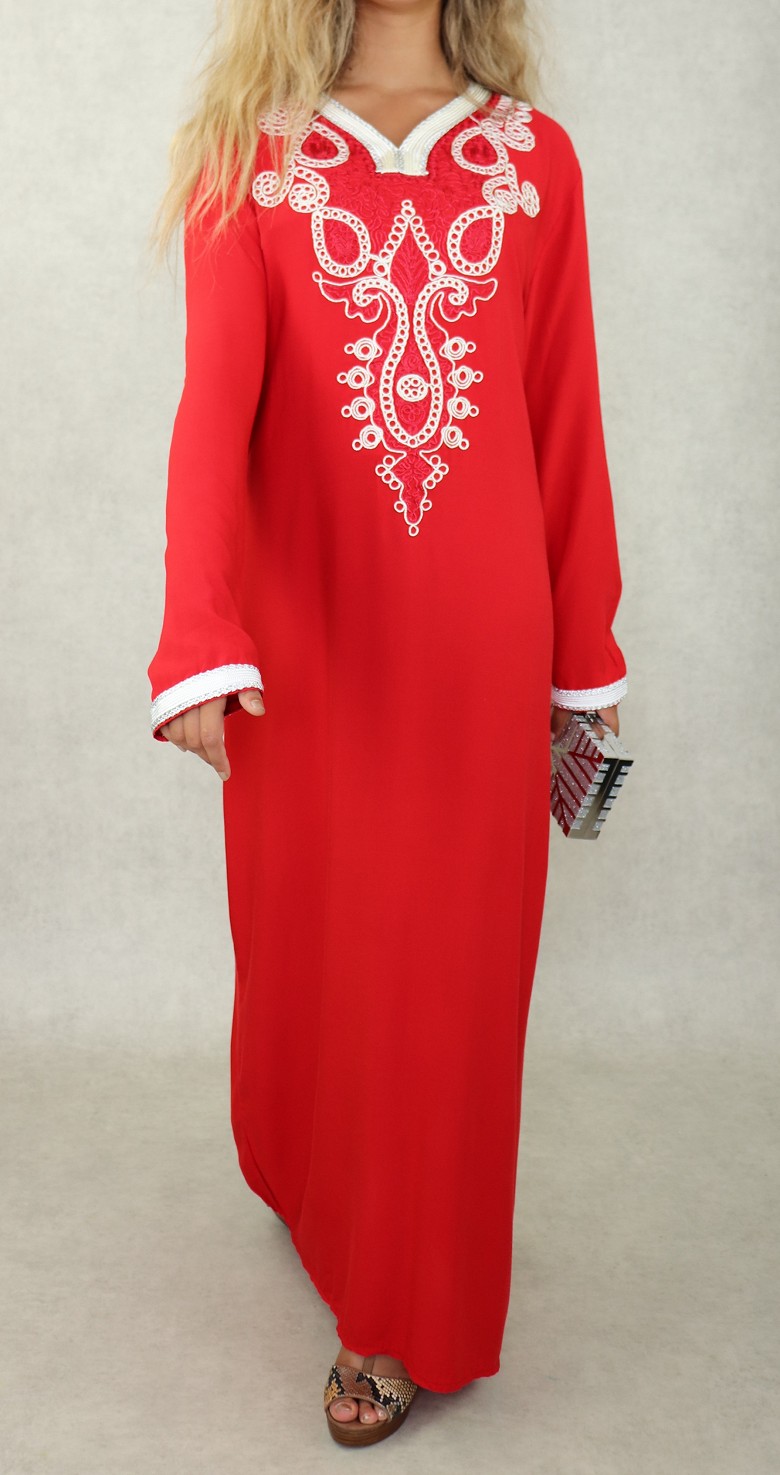 Robe orientale longue avec belles broderies en coton pour femme - Couleur rouge Vetement & Accessoire