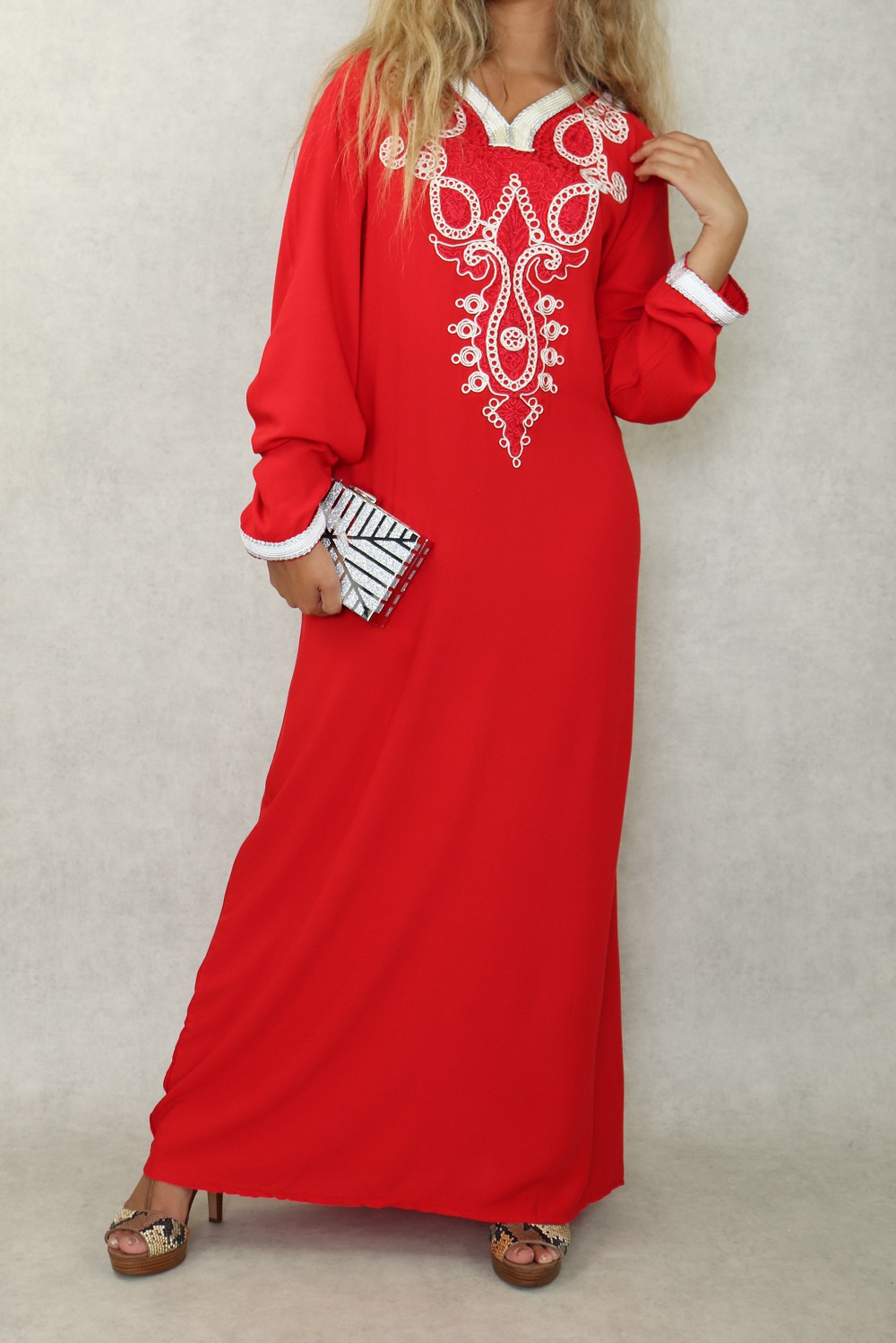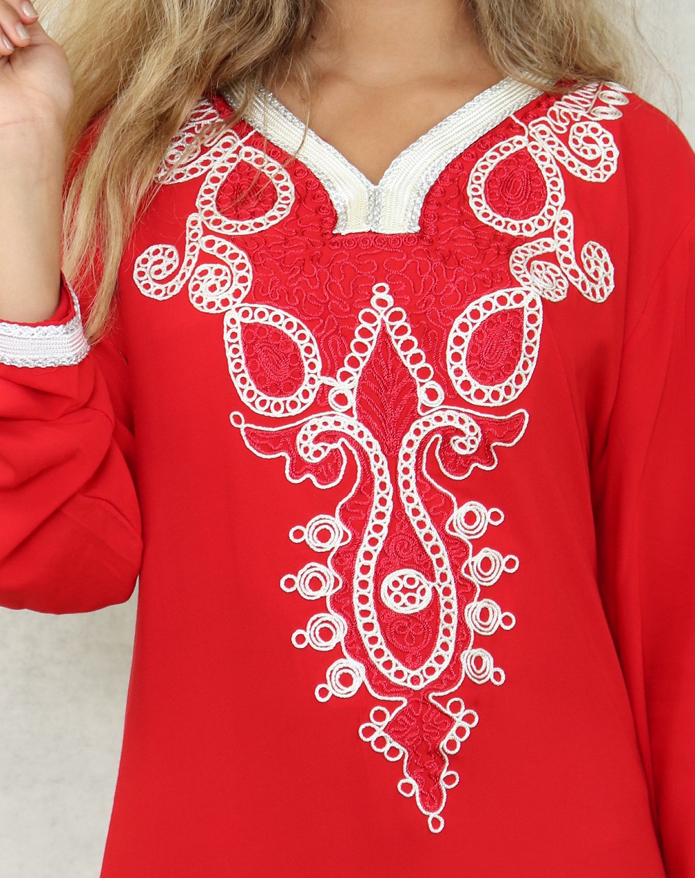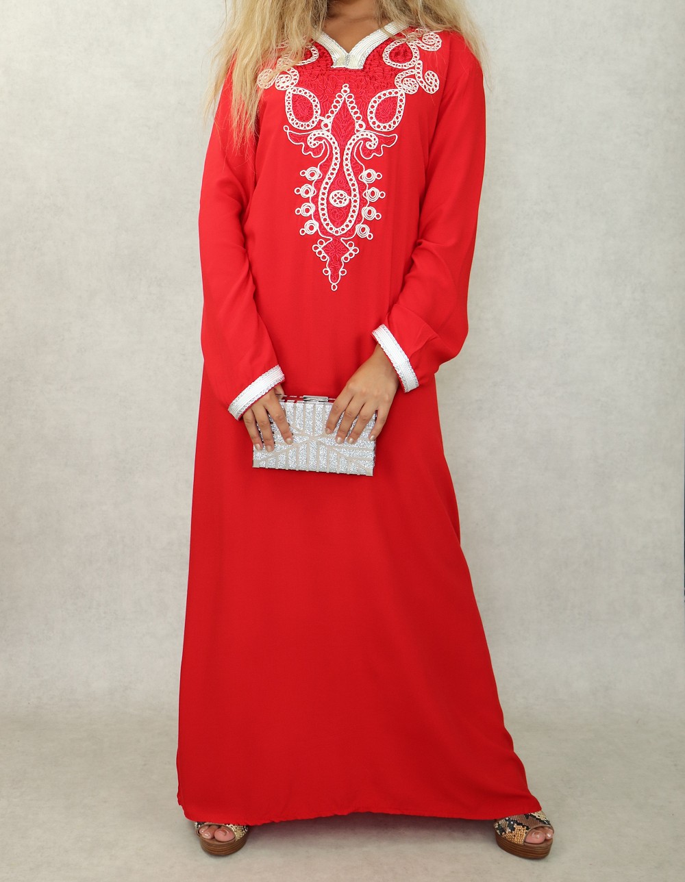 Robe orientale longue avec belles broderies en coton pour femme - Couleur rouge Vetement & Accessoire