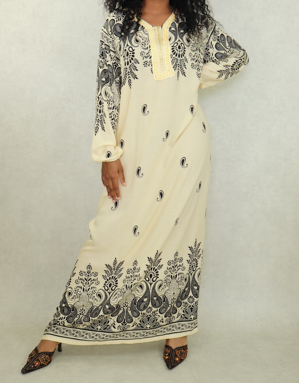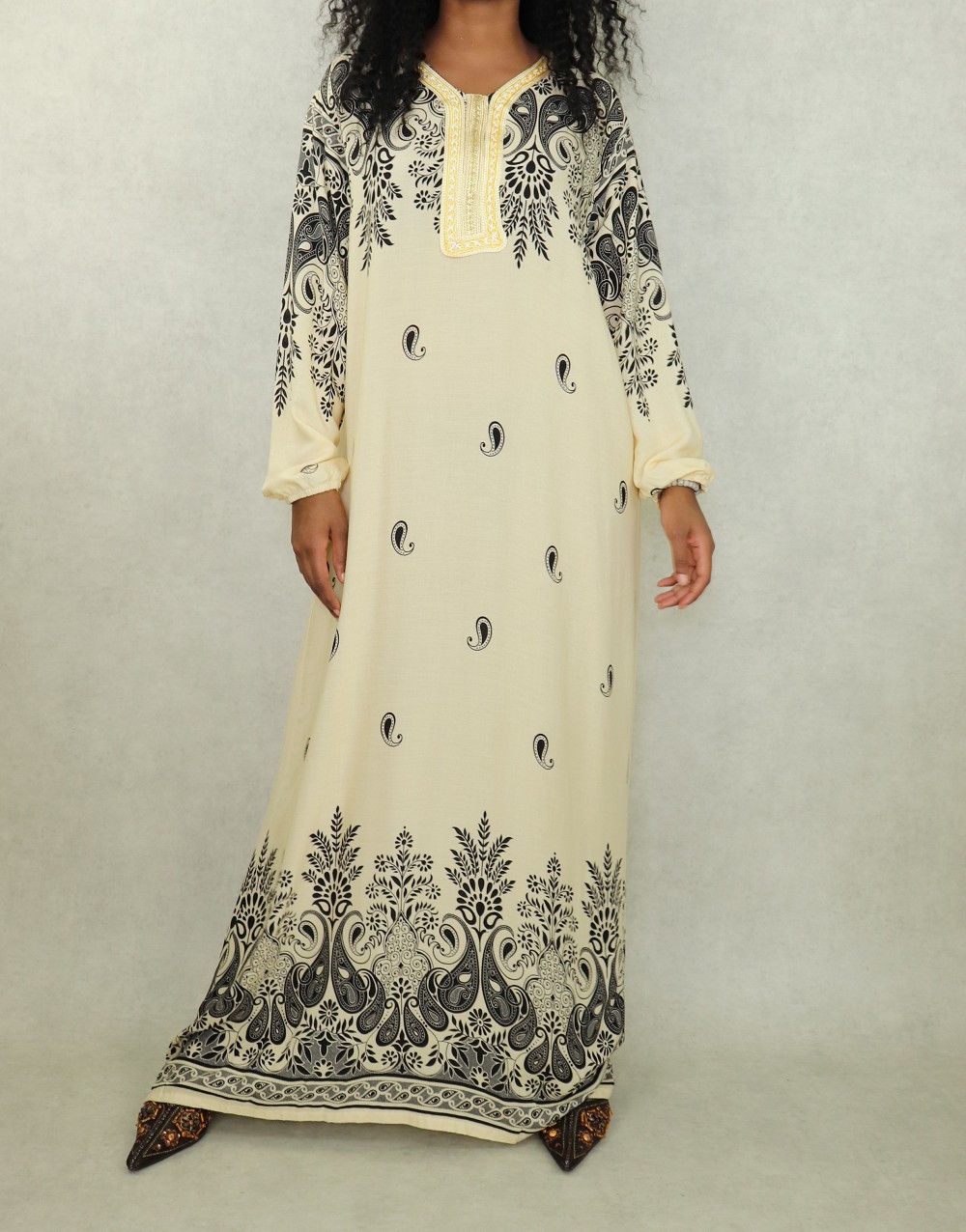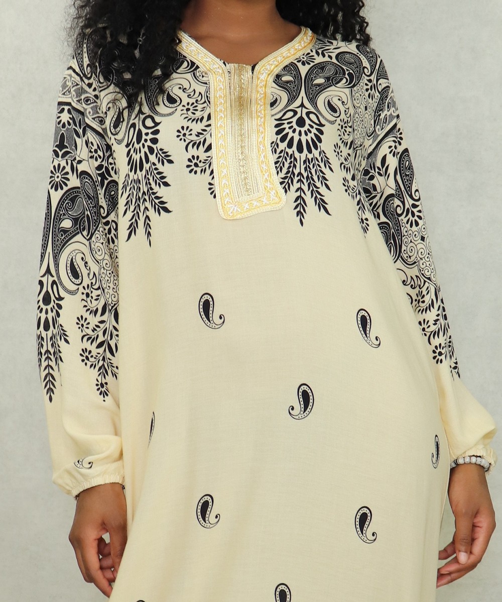 Robe orientale longue avec motifs noirs cachemire en coton pour femme - Couleur beige Vetement & Accessoire