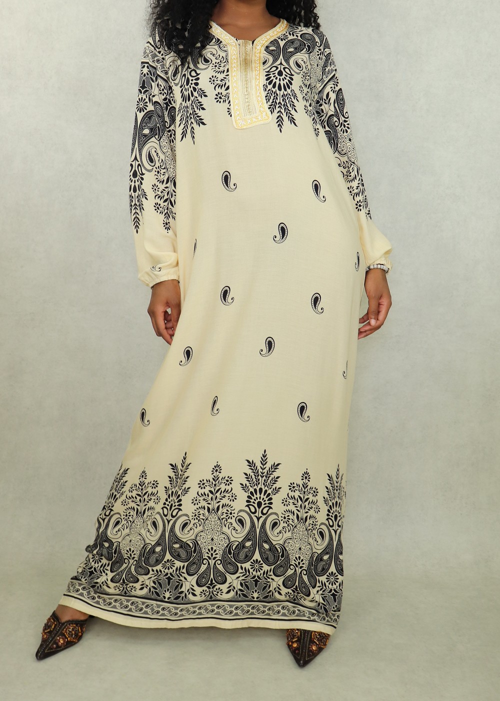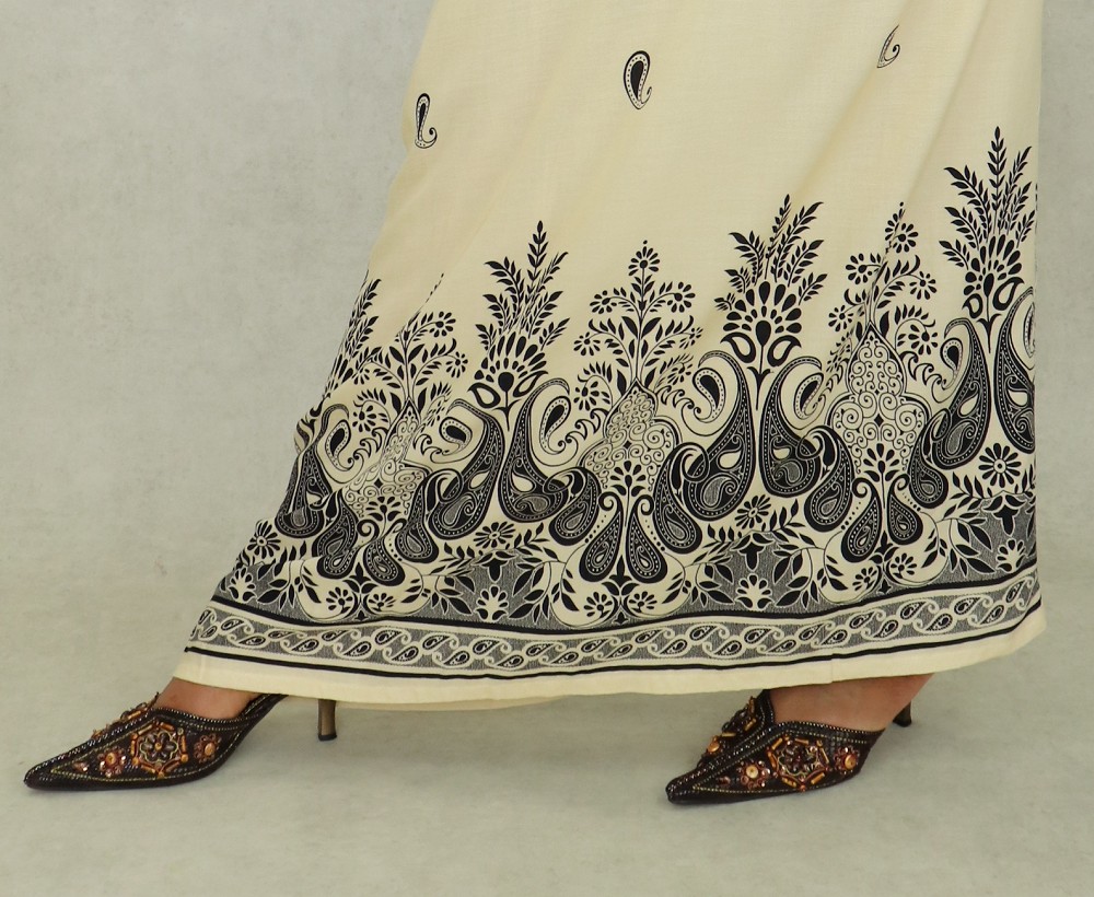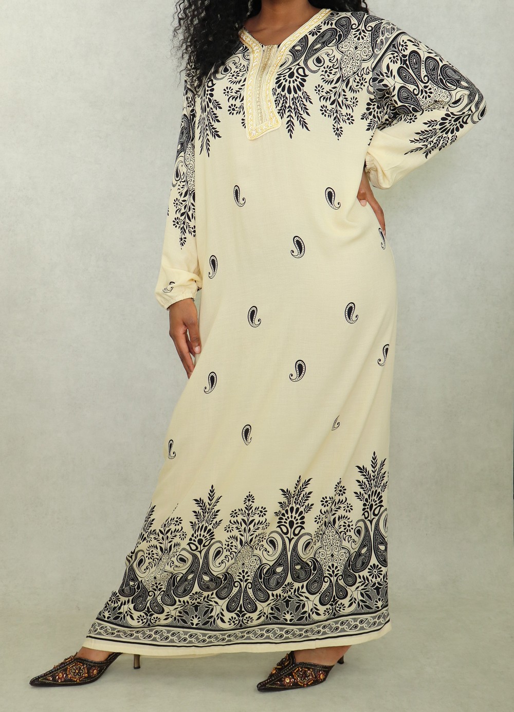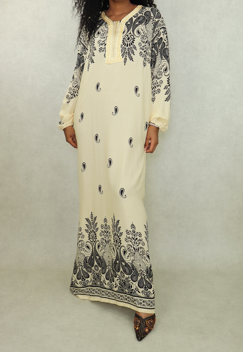 Robe orientale longue avec motifs noirs cachemire en coton pour femme - Couleur beige Vetement & Accessoire