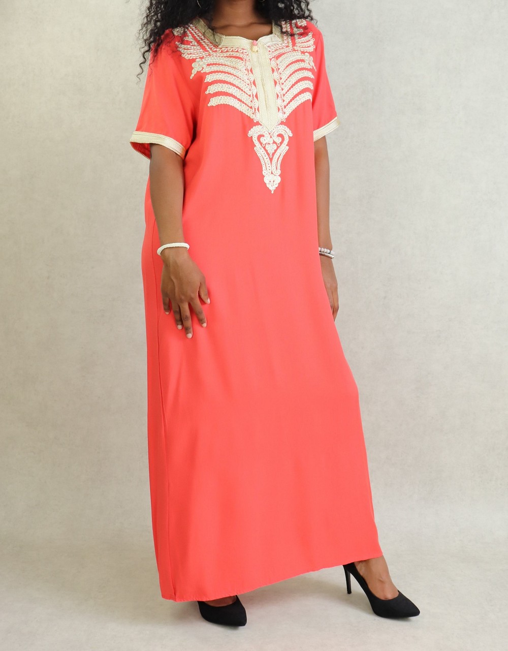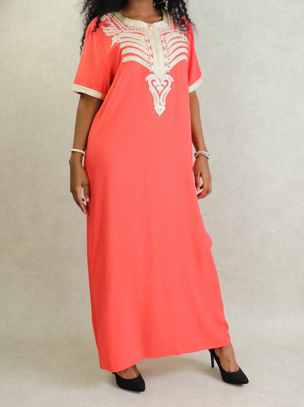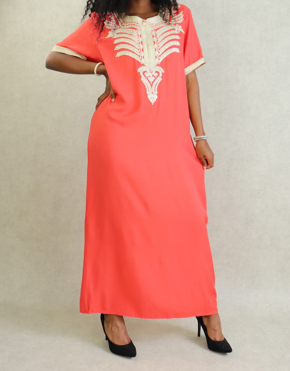 Robe orientale longue brodée manches courtes fluide et décontractée pour femme - Couleur Corail Vetement & Accessoire