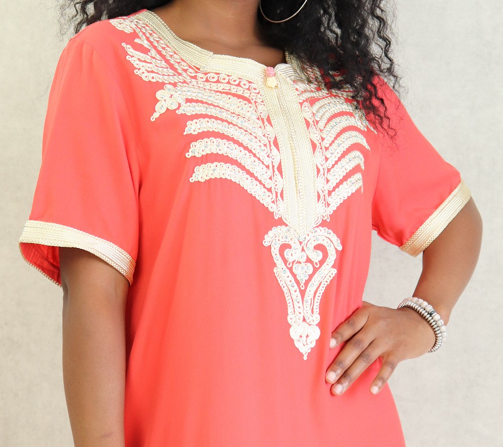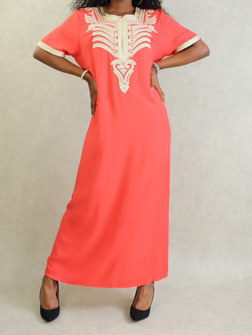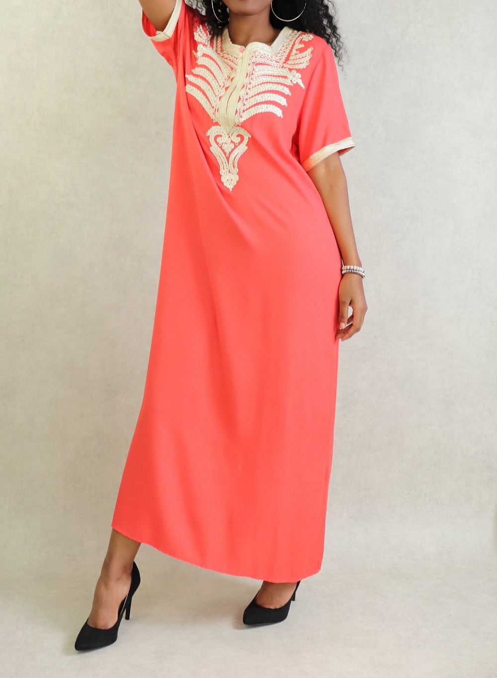 Robe orientale longue brodée manches courtes fluide et décontractée pour femme - Couleur Corail Vetement & Accessoire