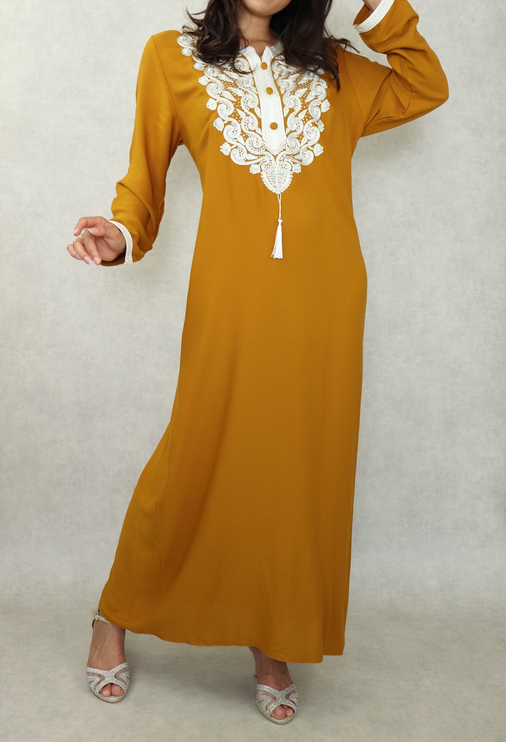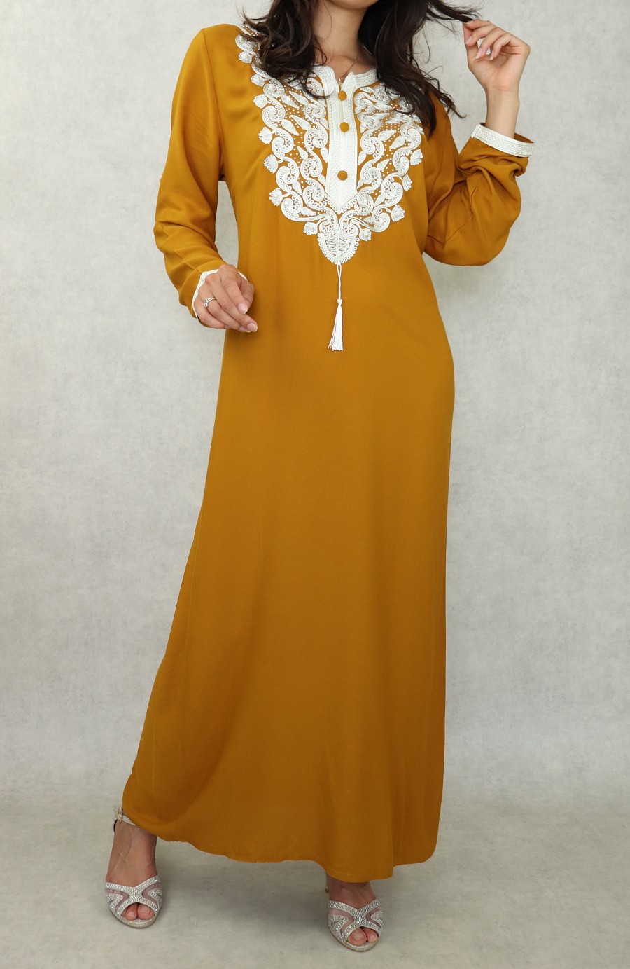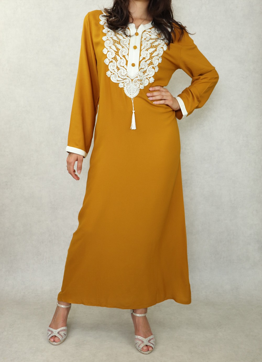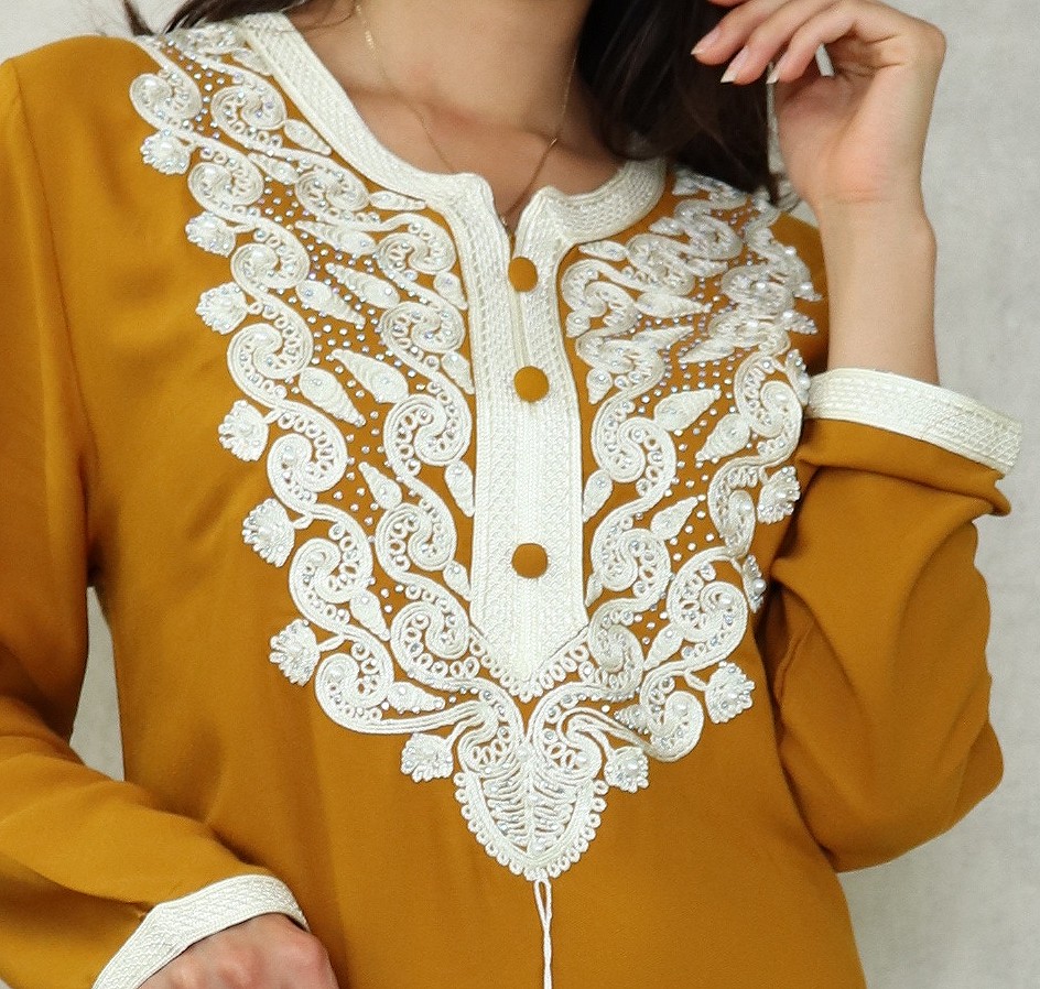 Robe orientale longue brodée pour femme - Couleur Jaune moutarde Vetement & Accessoire