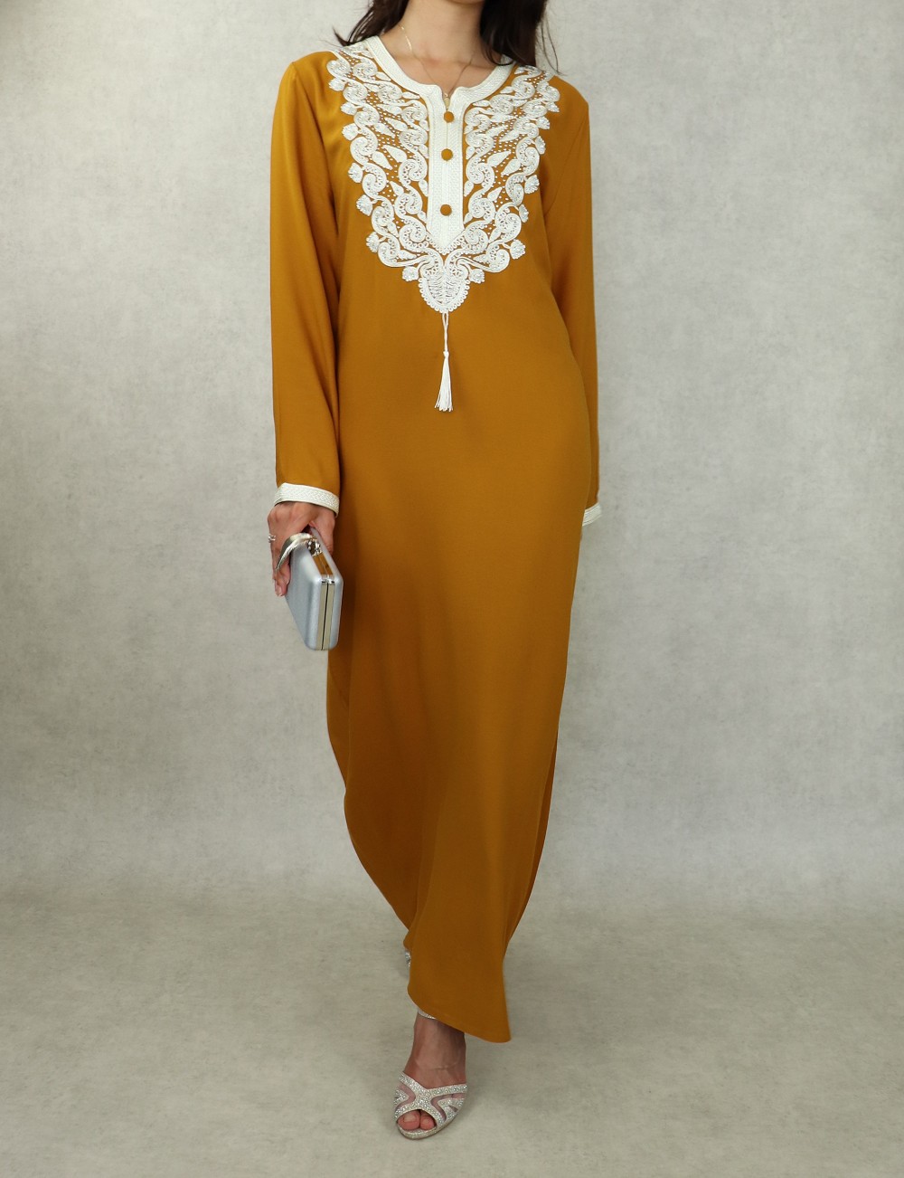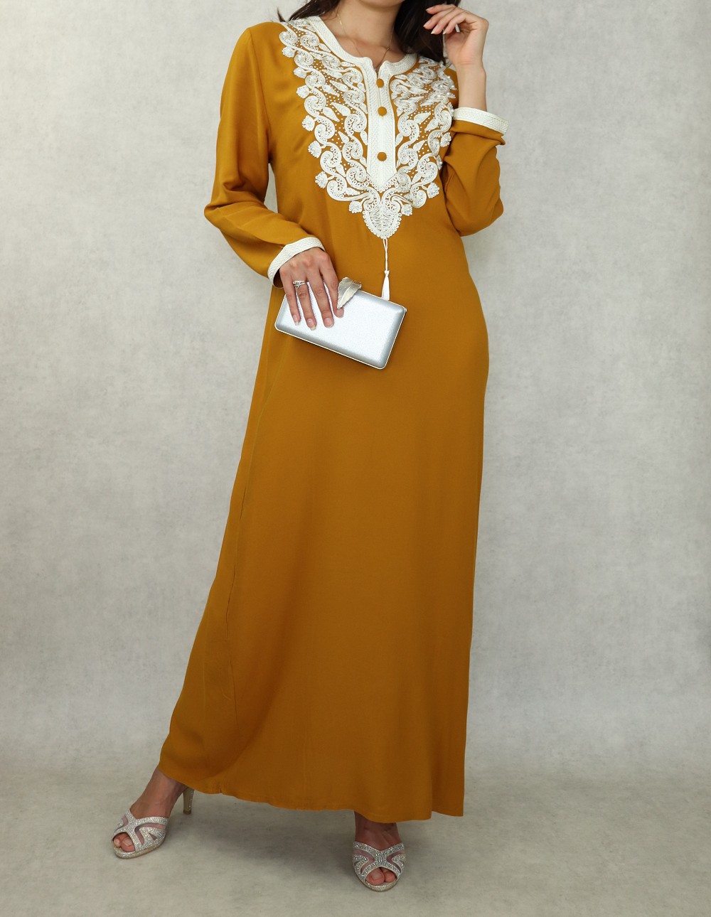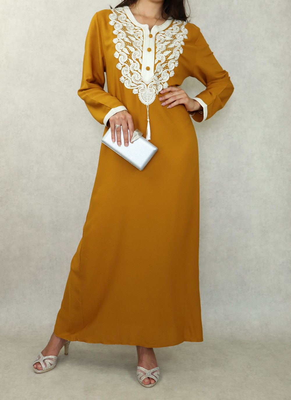 Robe orientale longue brodée pour femme - Couleur Jaune moutarde Vetement & Accessoire