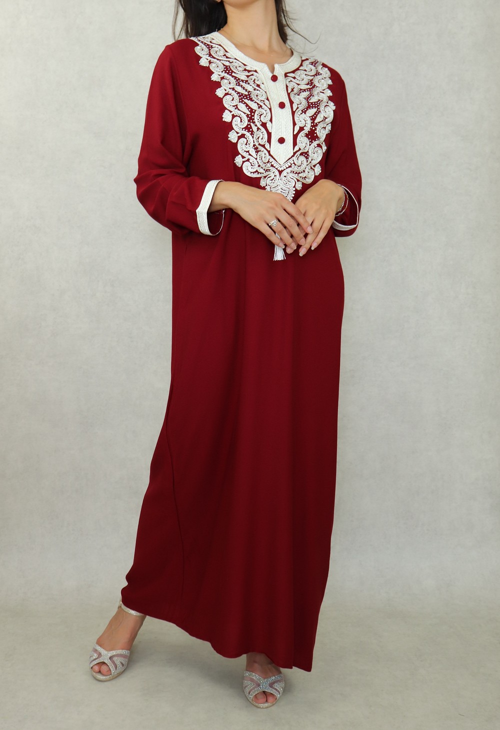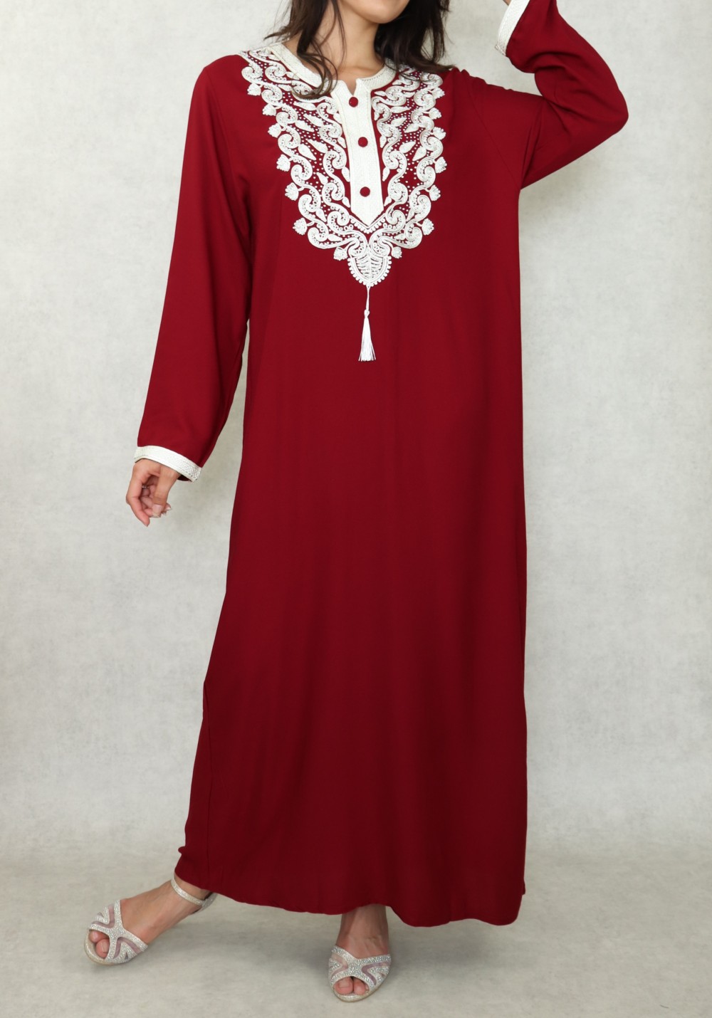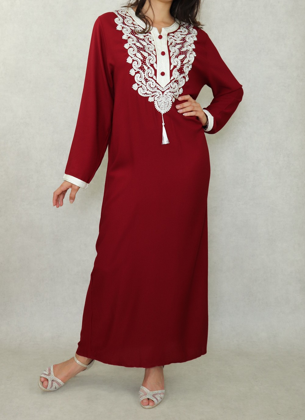 Cette robe manches longues est brodée de motifs orientaux de couleur blanc cassé et strasse sur la poitrine. L'élégance orientale dans toute sa splendeur. Porter cette robe c'est la garantie d'un look élégant sans effort.
