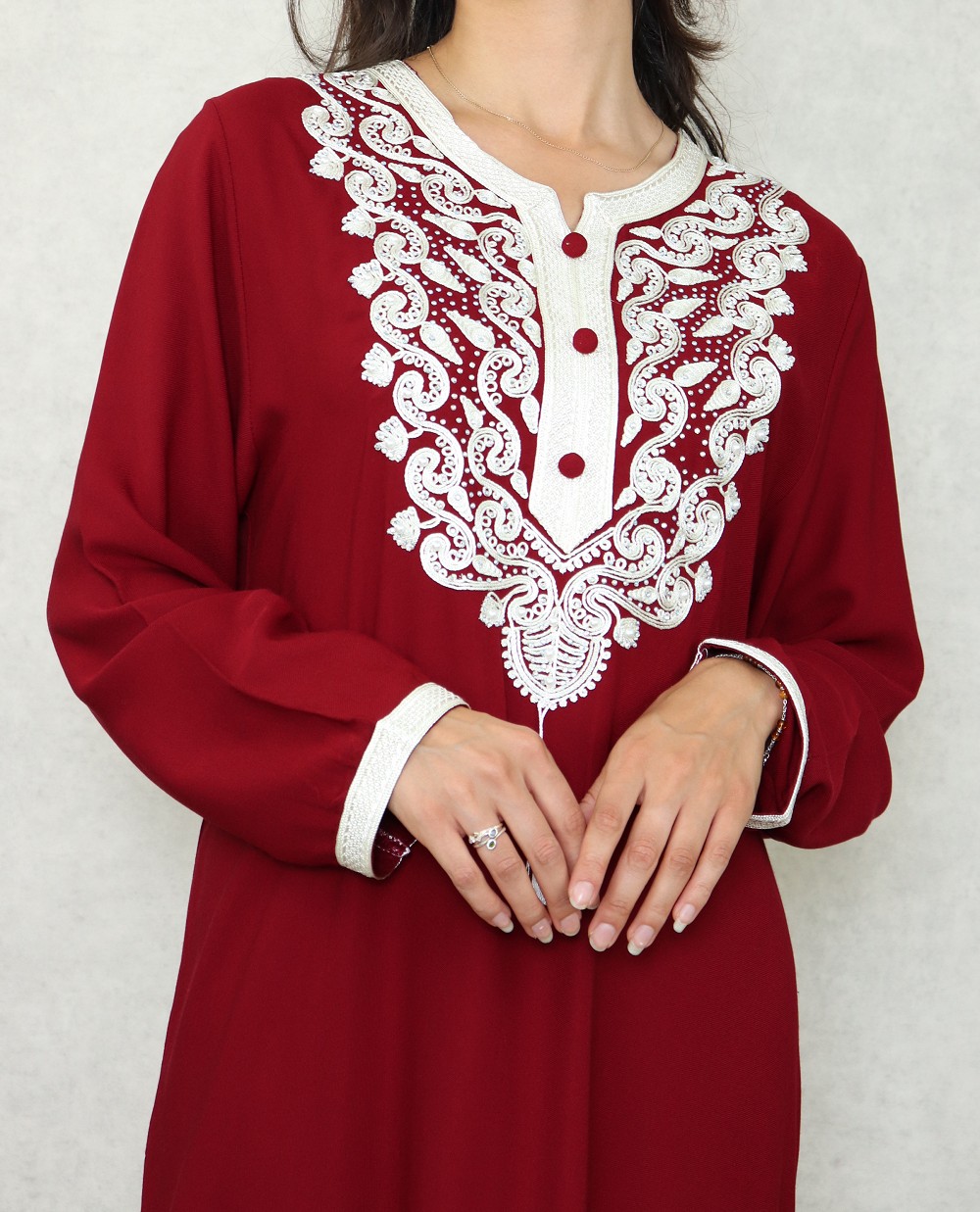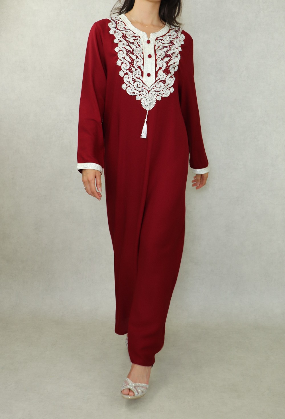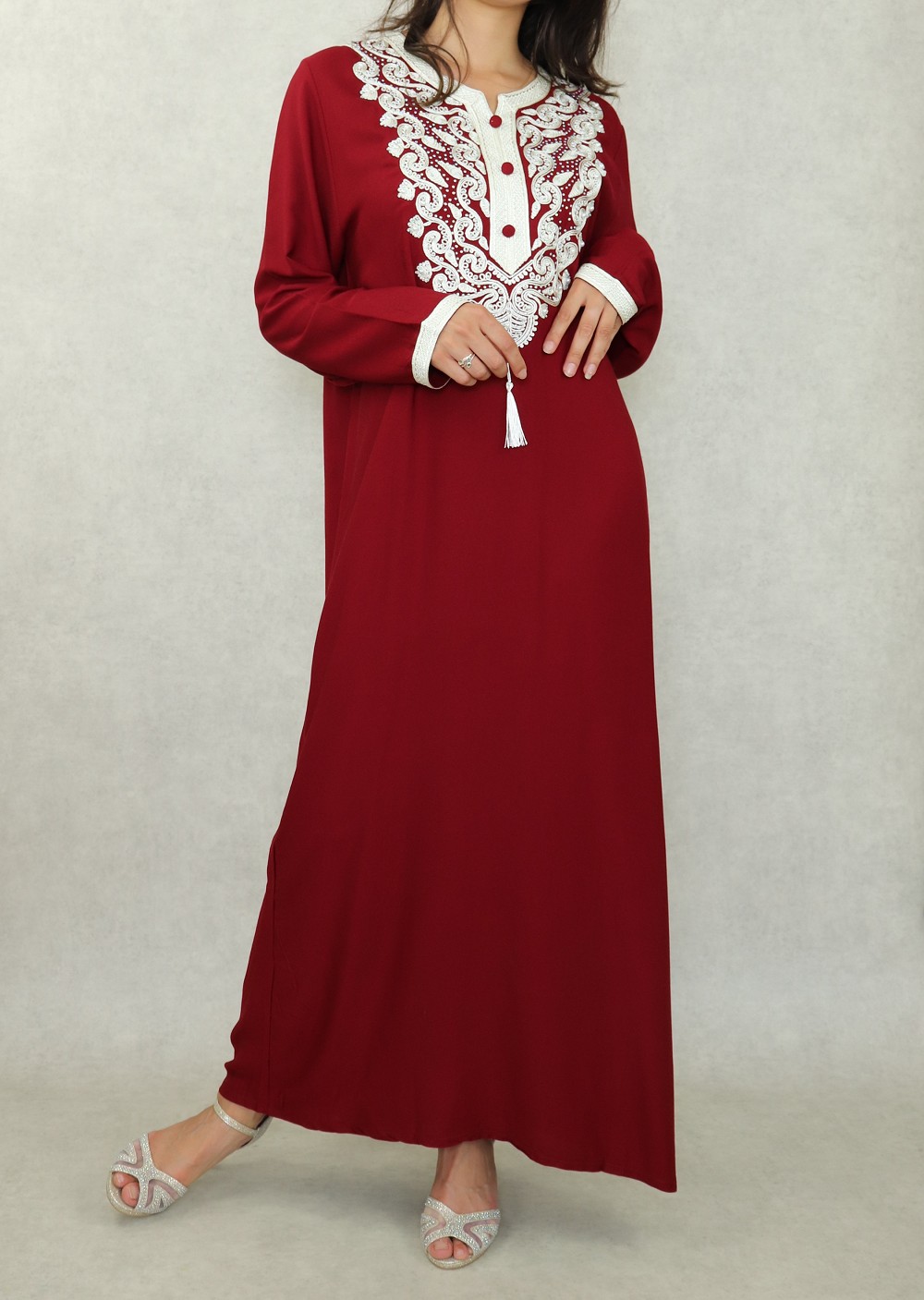Cette robe manches longues est brodée de motifs orientaux de couleur blanc cassé et strasse sur la poitrine. L'élégance orientale dans toute sa splendeur. Porter cette robe c'est la garantie d'un look élégant sans effort.
