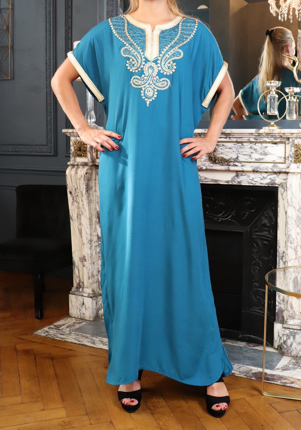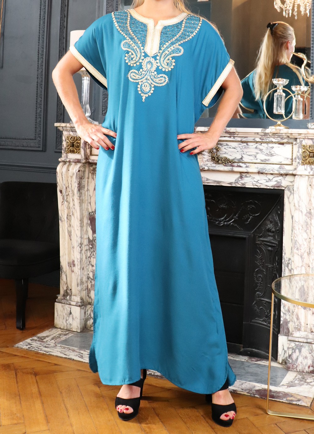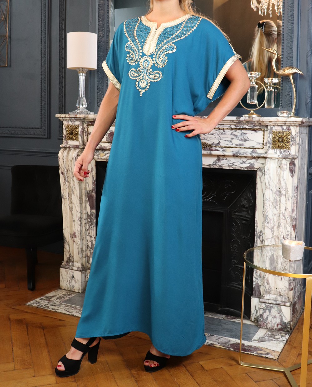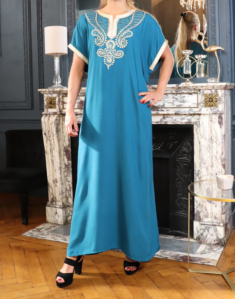 Robe orientale longue de maison / d'été manche courte avec belles broderies pour femme - Couleur Bleu canard Vetement & Accessoire
