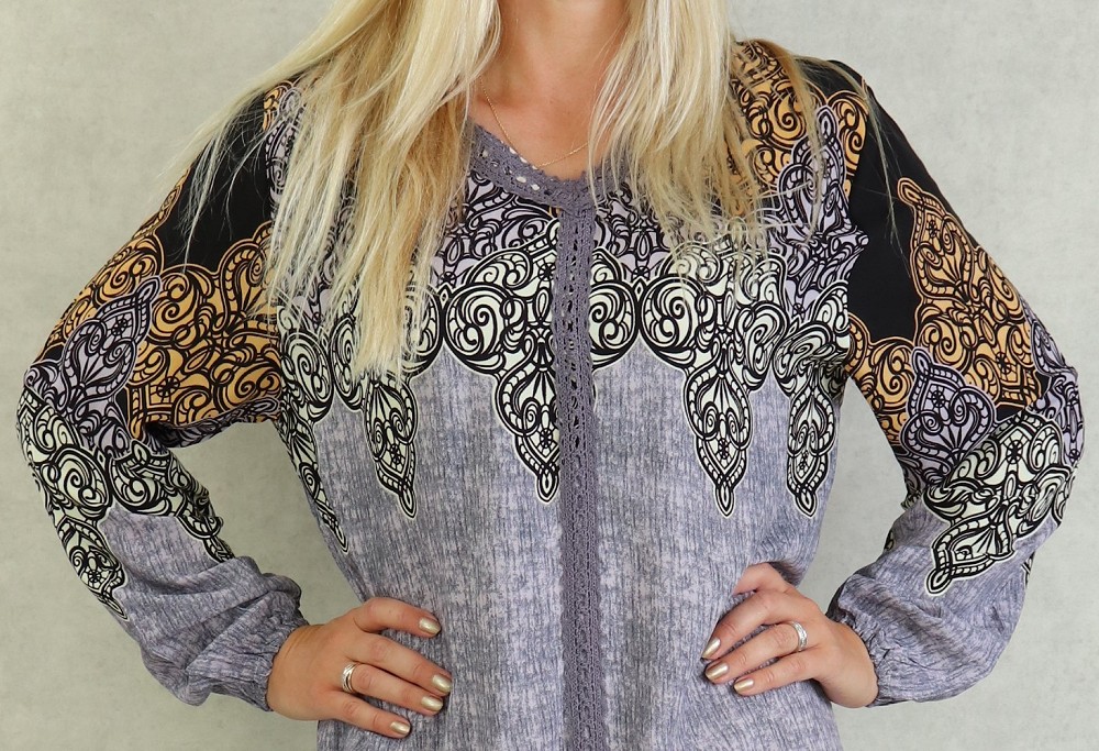 Longue robe imprimée avec motifs d'été, manches longues élastique aux poignets, col en V avec dentelles ainsi que sur toute la longueur devant, non transparente. Coupe droite, tissu léger et fluide.