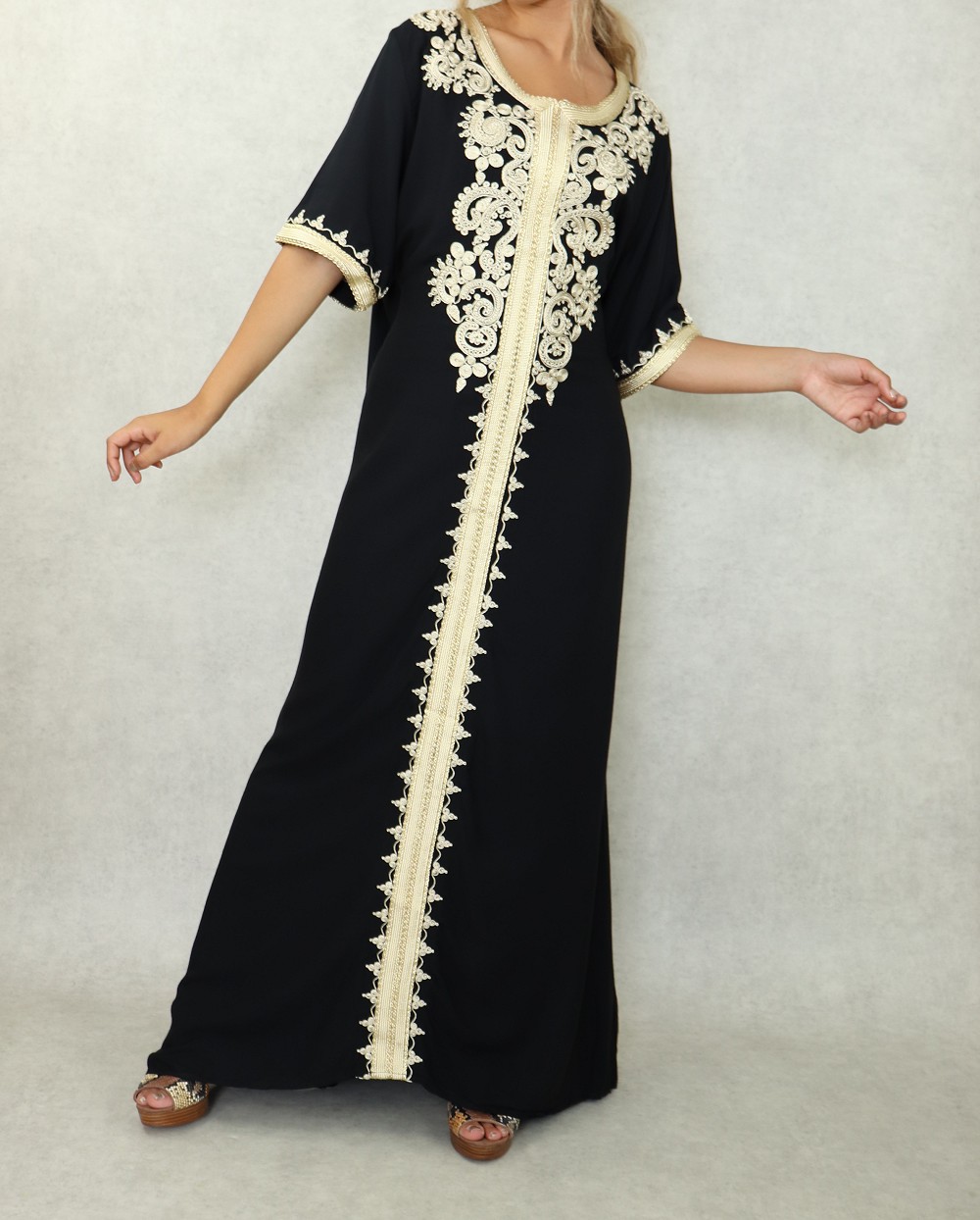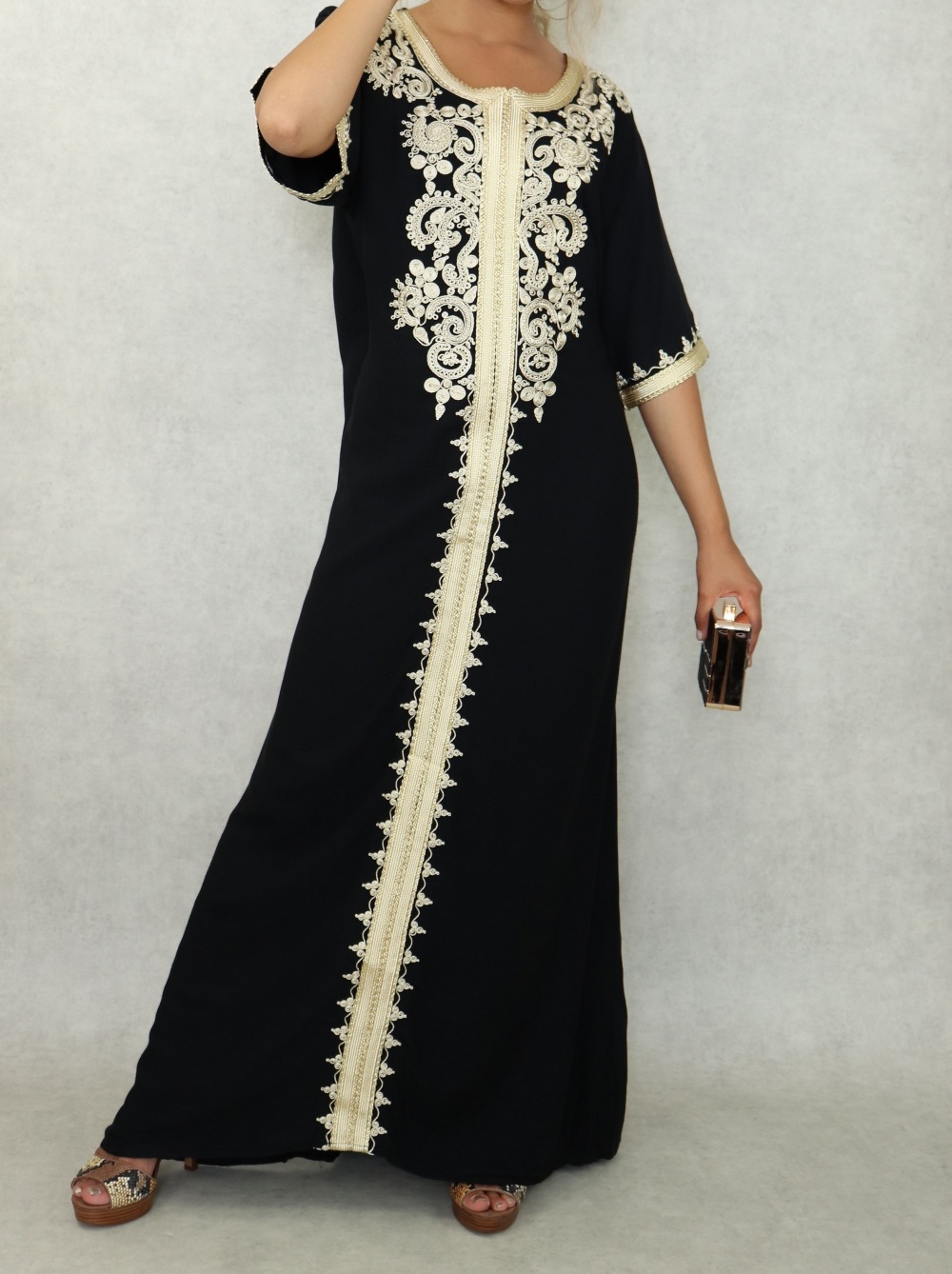 Robe de soirée noire style Abaya Dubaï de qualité avec motifs strass et perles noires - REF. 38176 (45.00 €)
