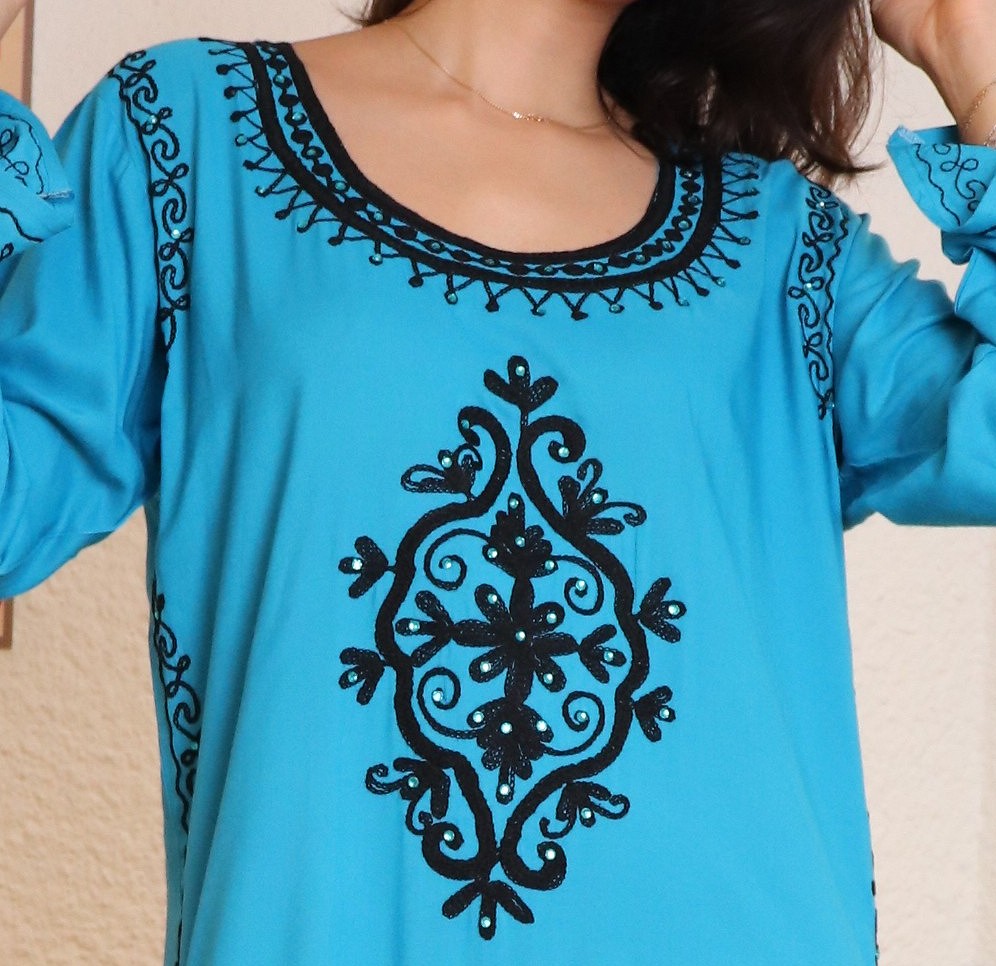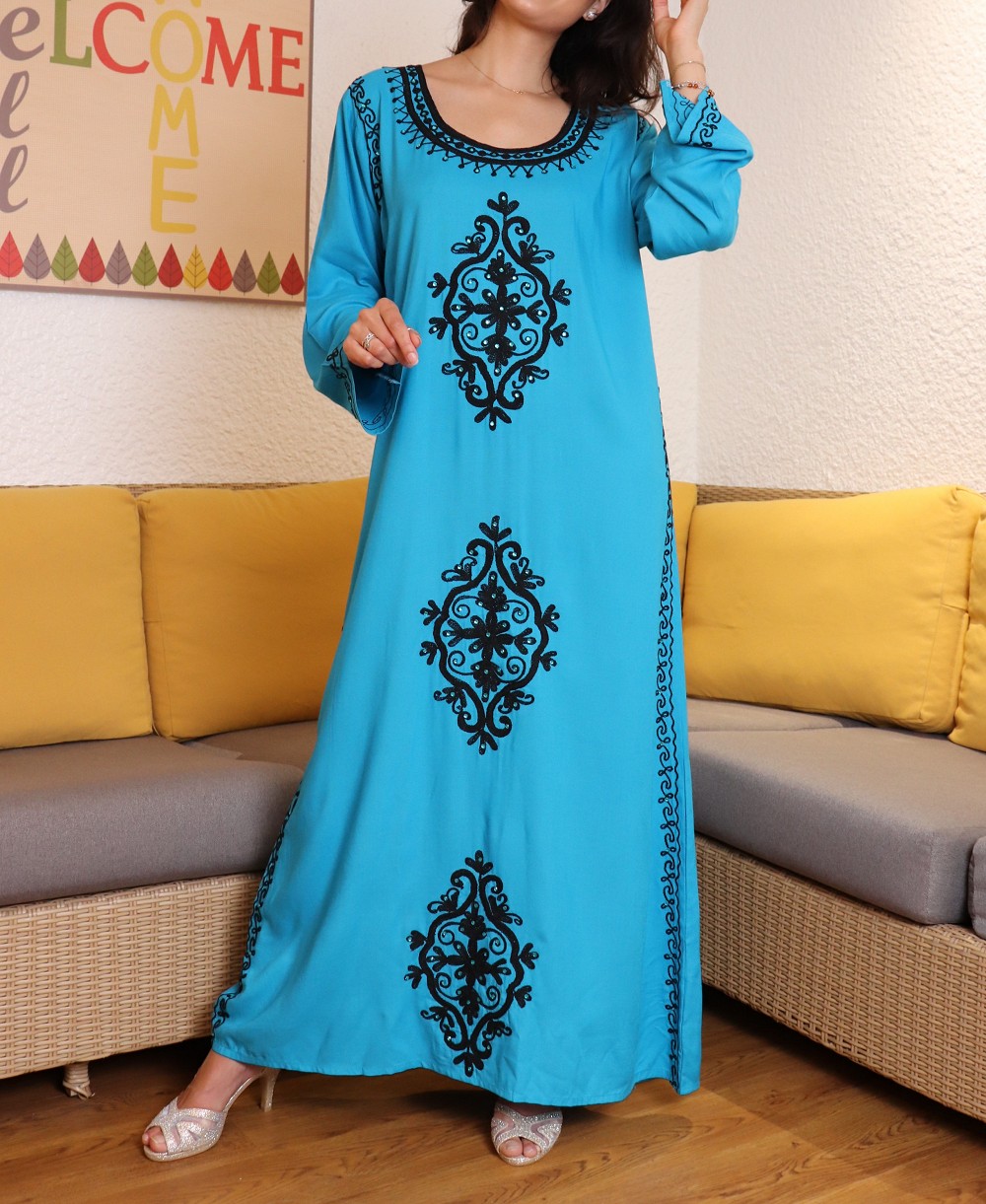 Robe orientale maxi-longue avec de nombreuses broderies à motif fleurs pour femme - Couleur bleu - REF. 33415 (29.00 €)