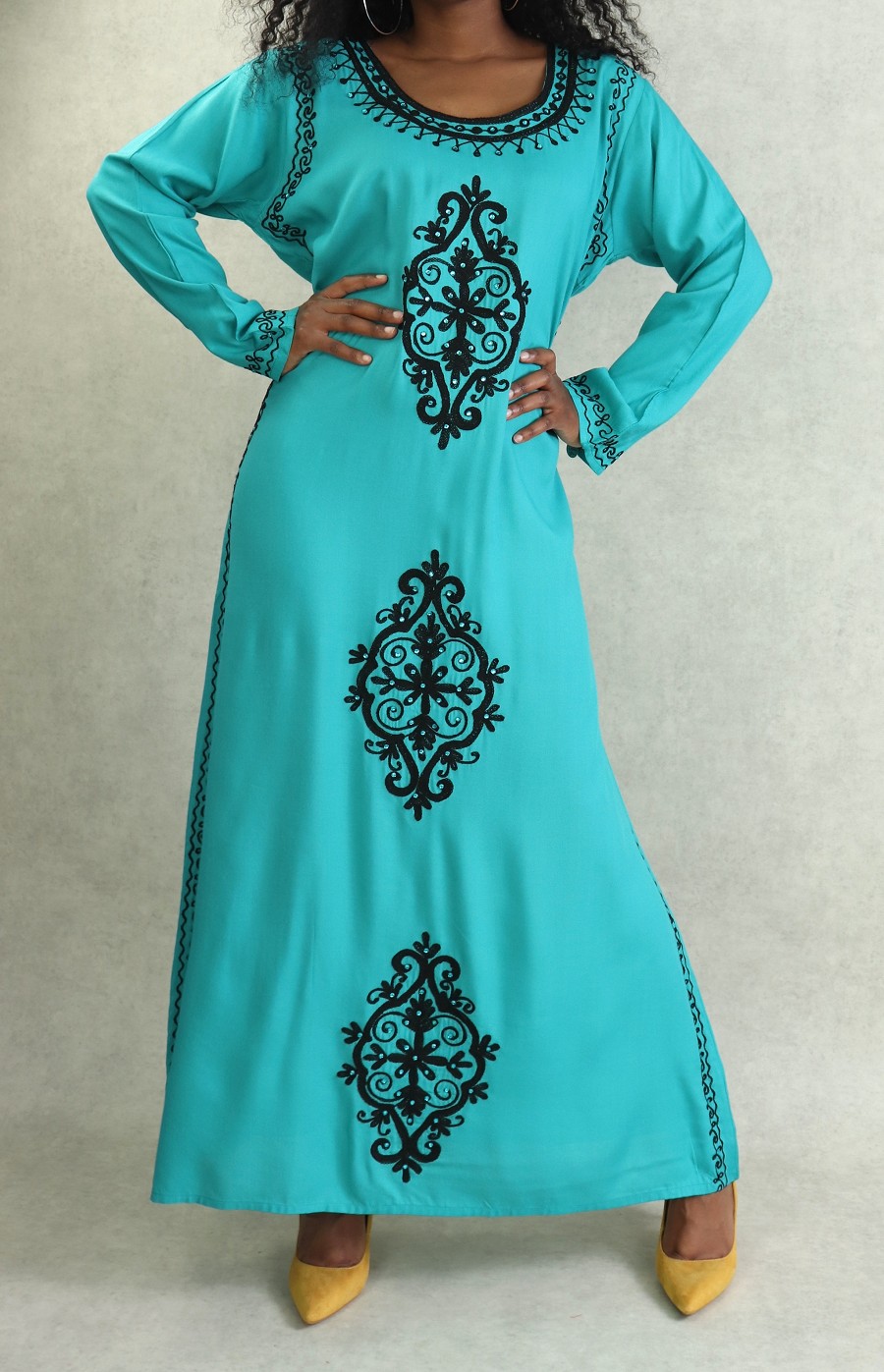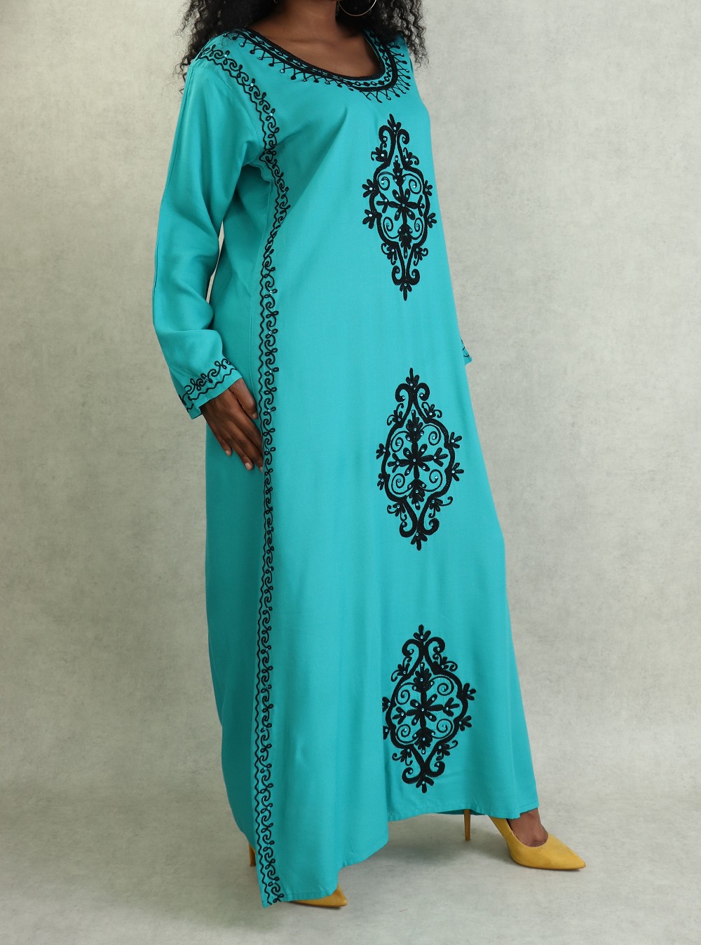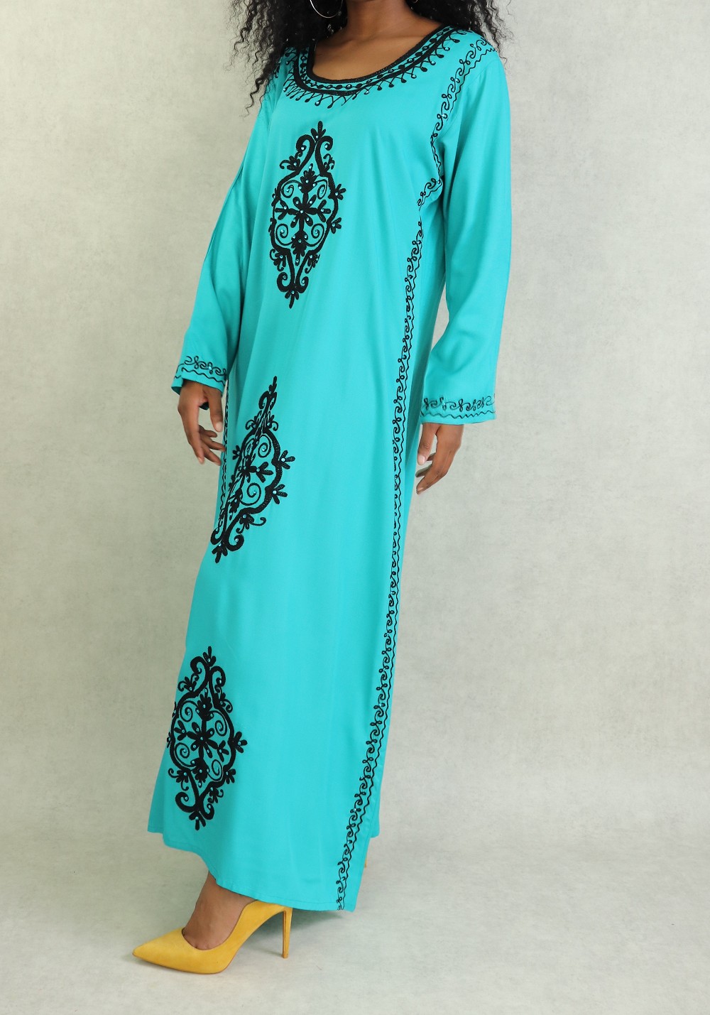 Robe orientale maxi-longue avec motifs noirs cachemire en coton pour femme - Couleur bleu turquoise - REF. 38837 (19.00 €)