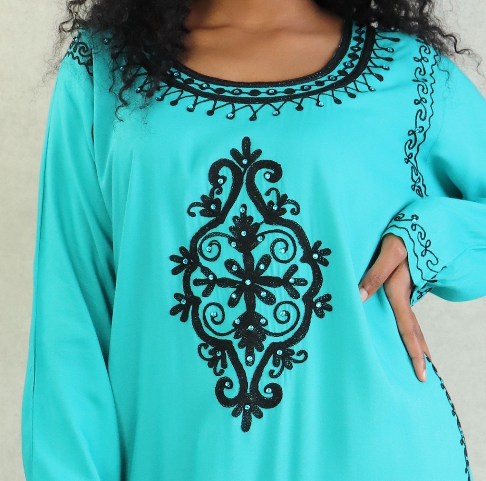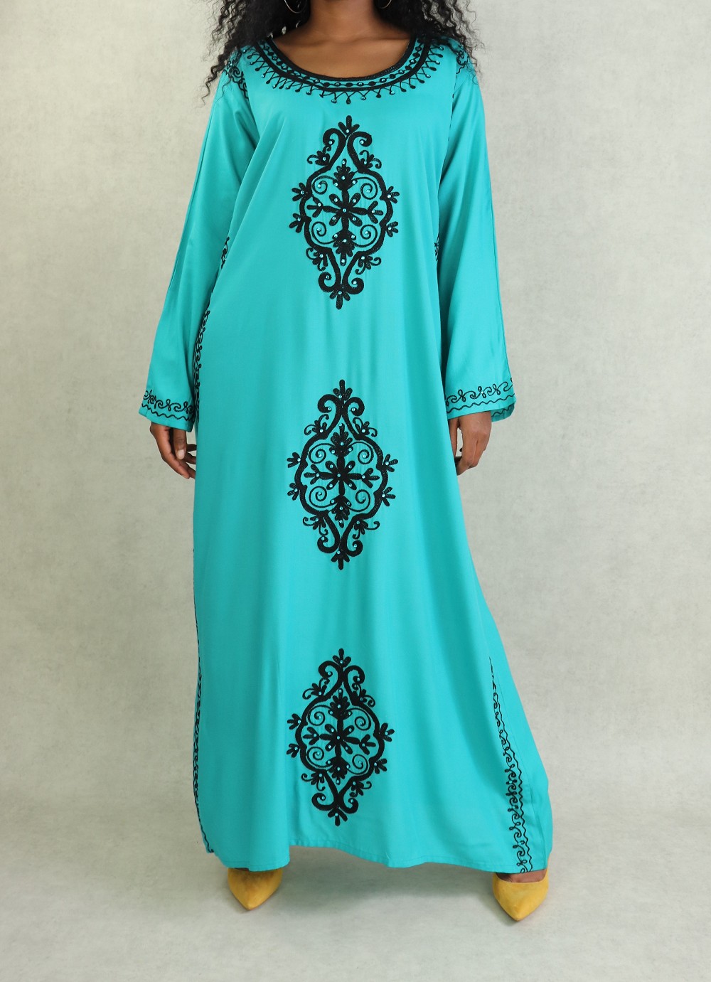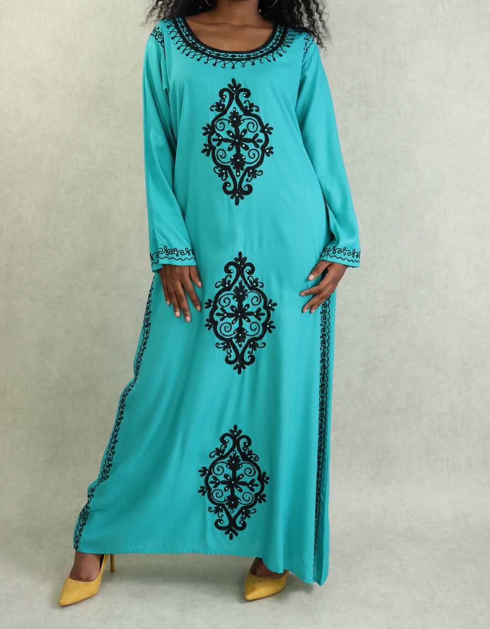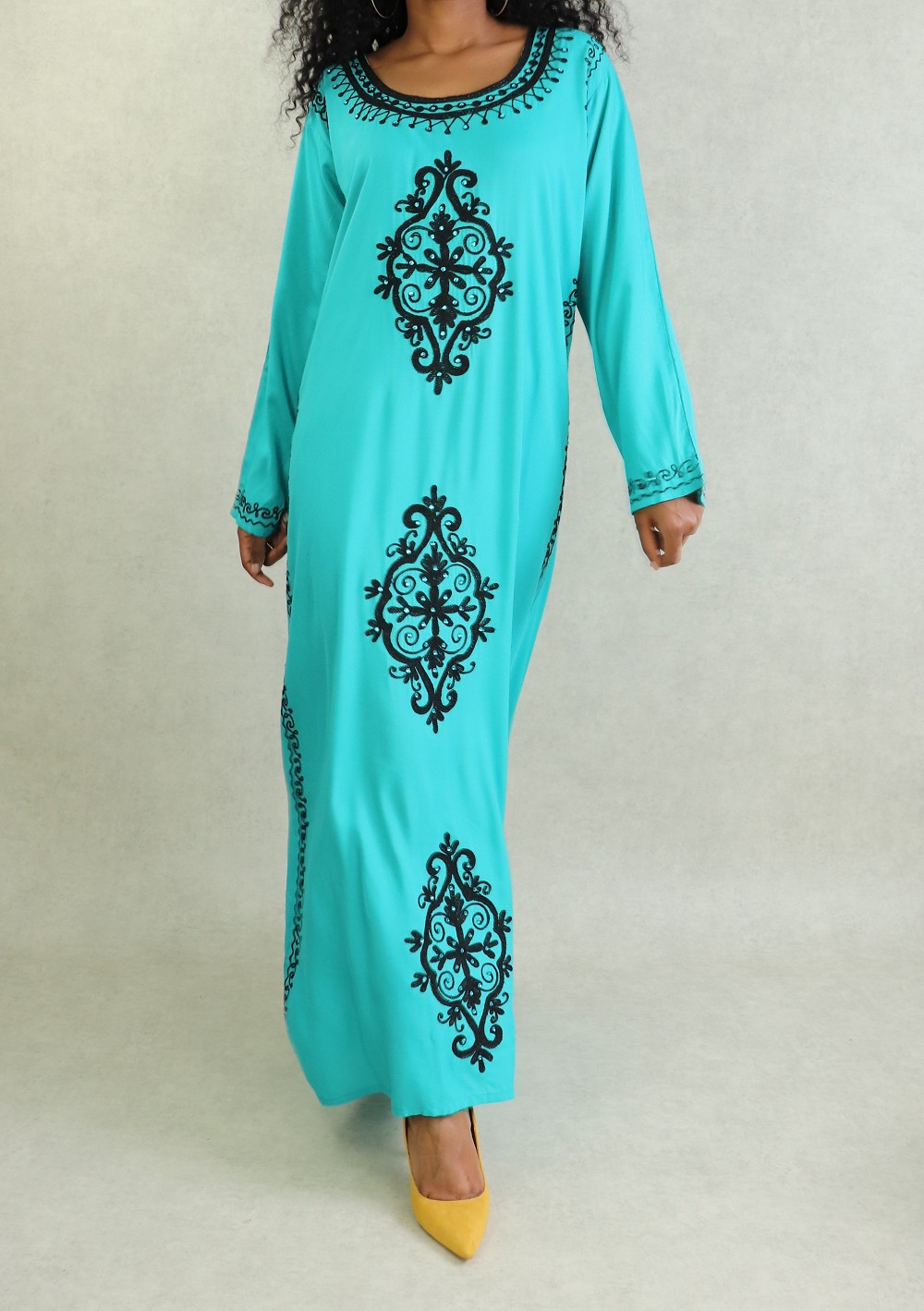 Robe orientale maxi-longue avec motifs noirs cachemire en coton pour femme - Couleur bleu turquoise - REF. 38837 (19.00 €)