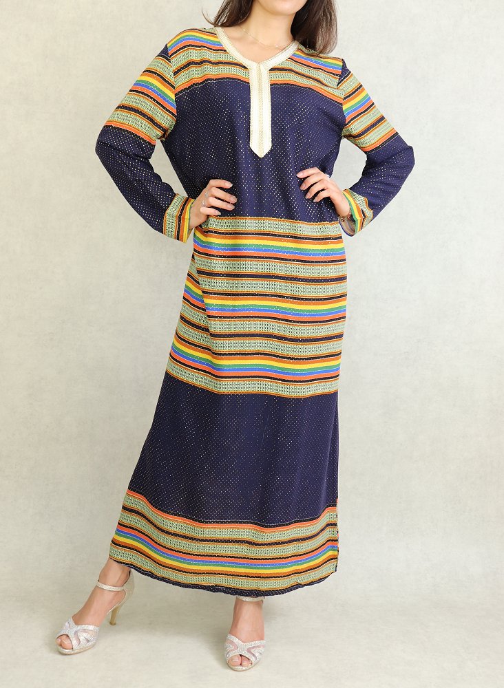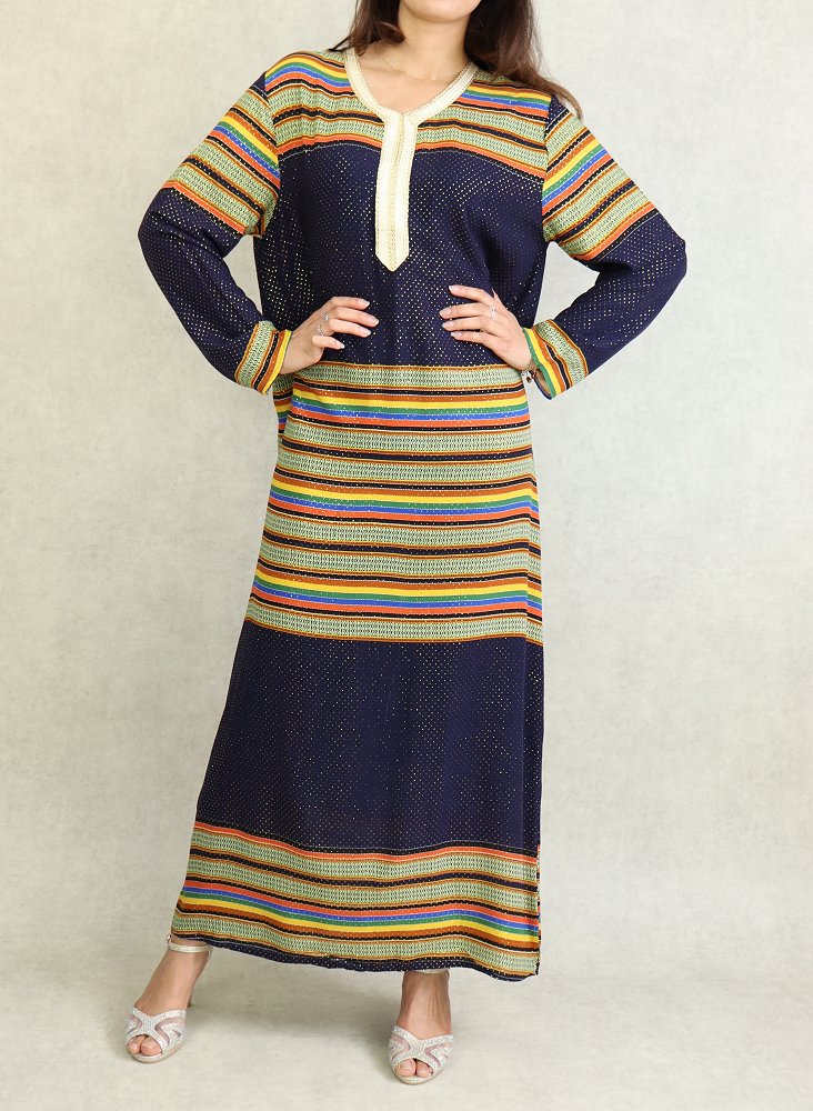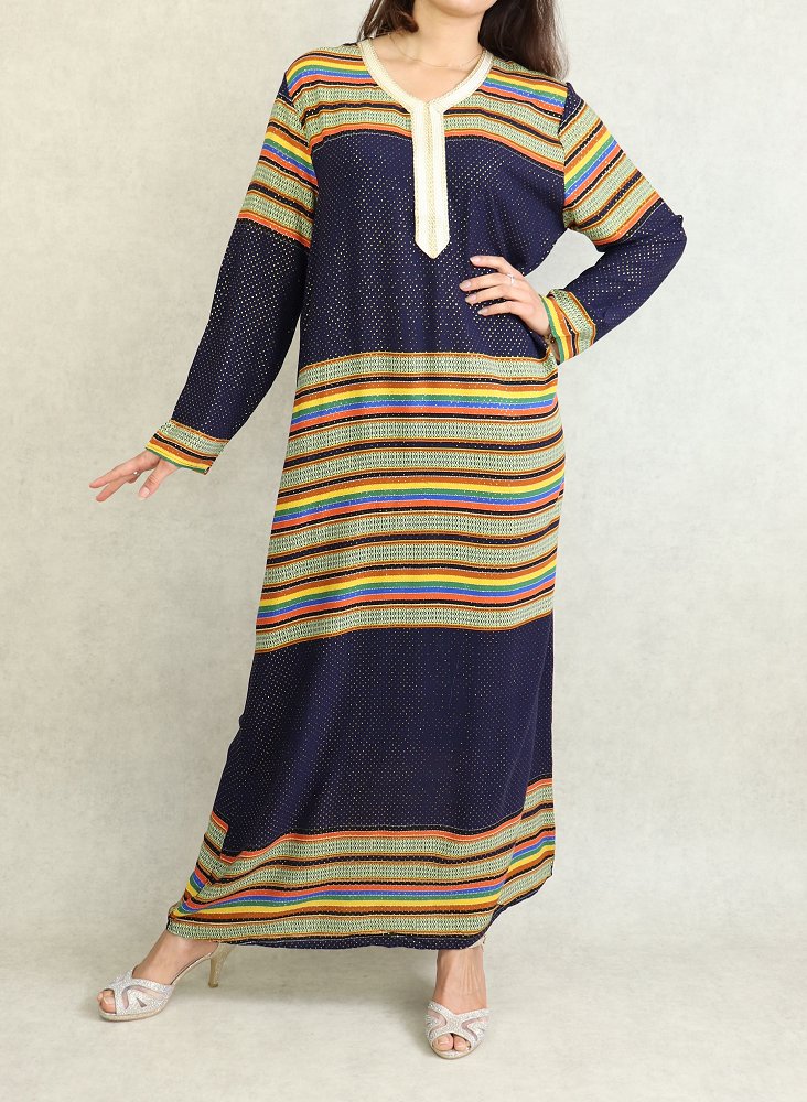 Robe orientale moderne manches longues à paillettes et rayures multi-couleurs horizontales - Couleur Bleu nuit Vetement & Accessoire