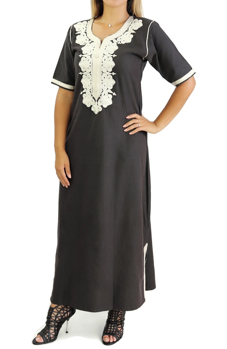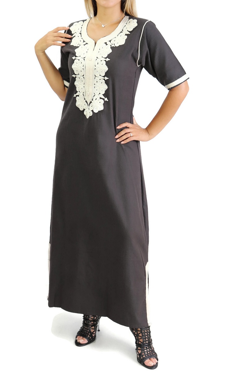 Cette Gandoura aux réalisée dans un tissu épais manches coutres est brodée de motifs orientaux beige sur la poitrine. L'élégance orientale dans toute sa splendeur.