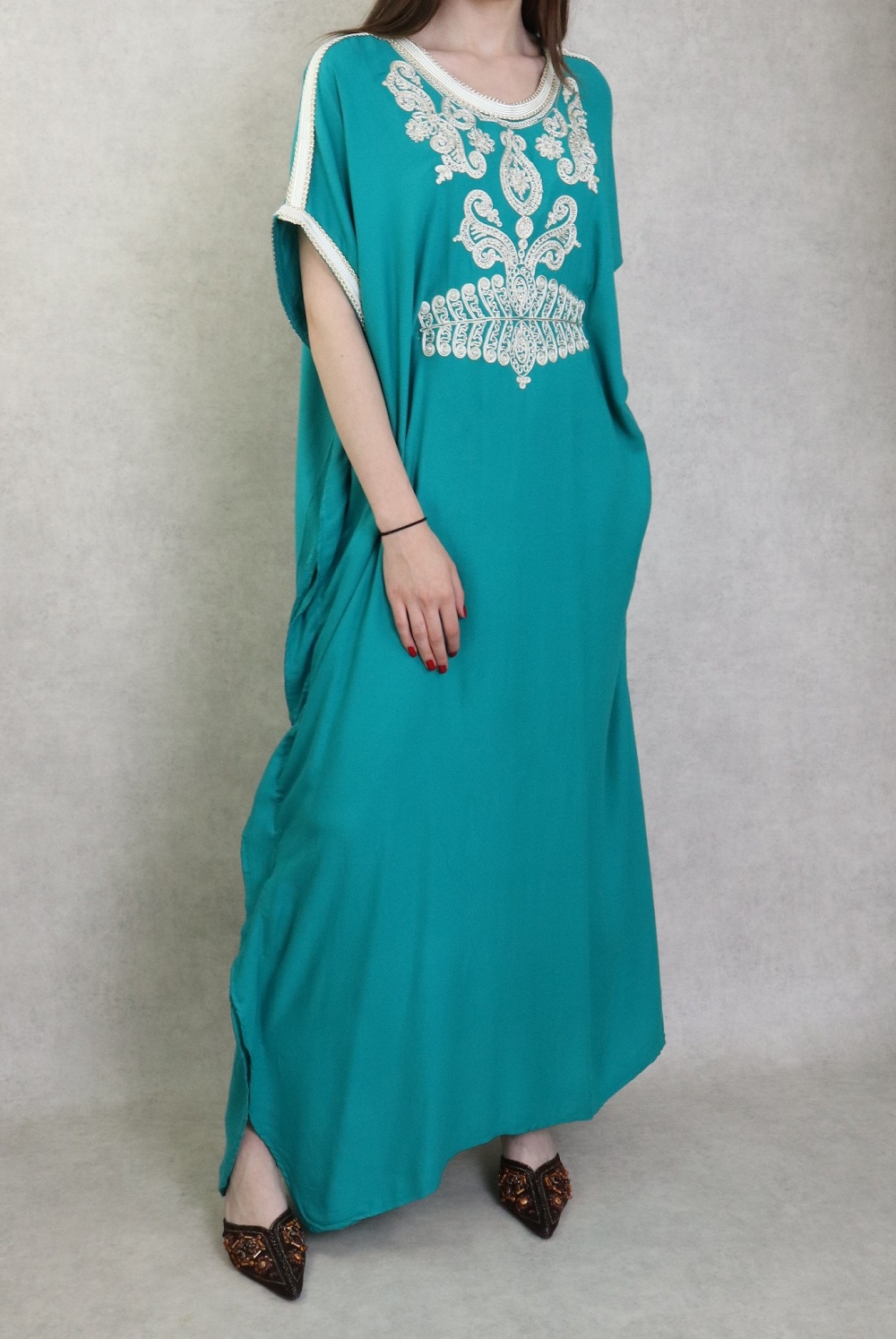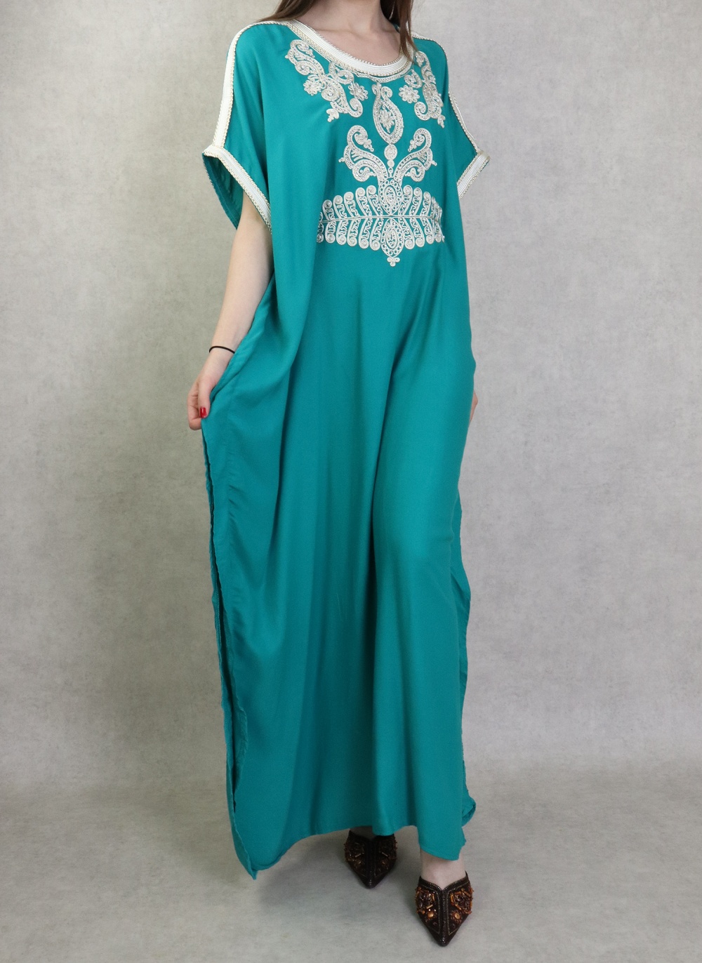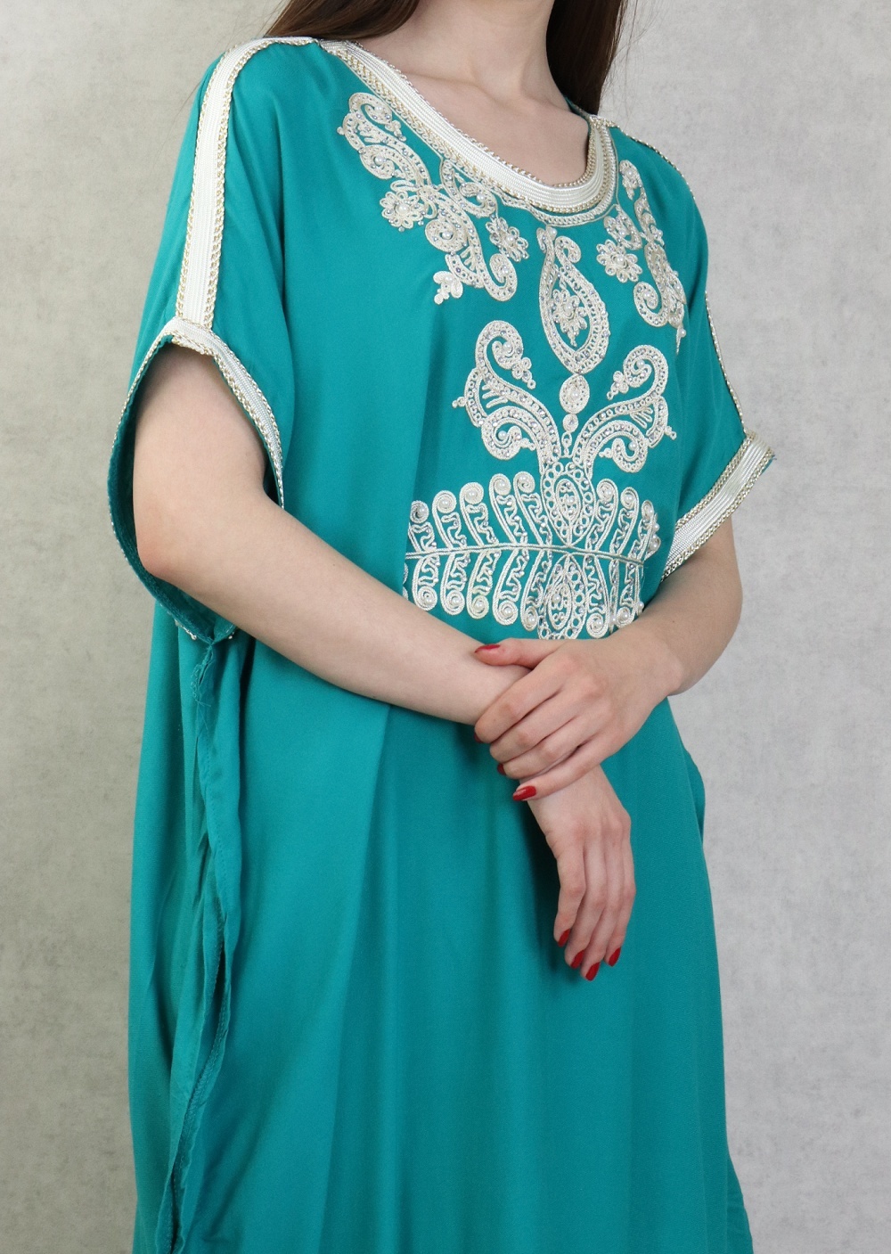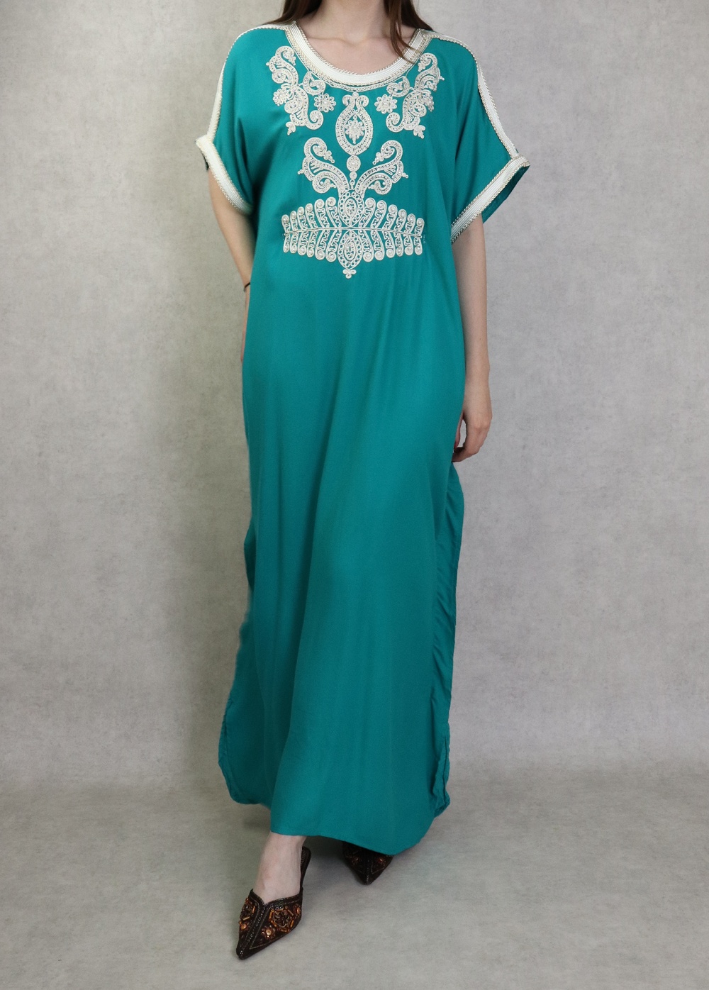 Robe longue, col rond, broderies à base de strasse et de perles sur le buste ainsi qu'à la taille. Coupe droite, tissu doux et fluide.