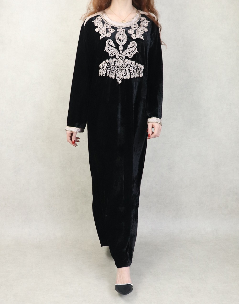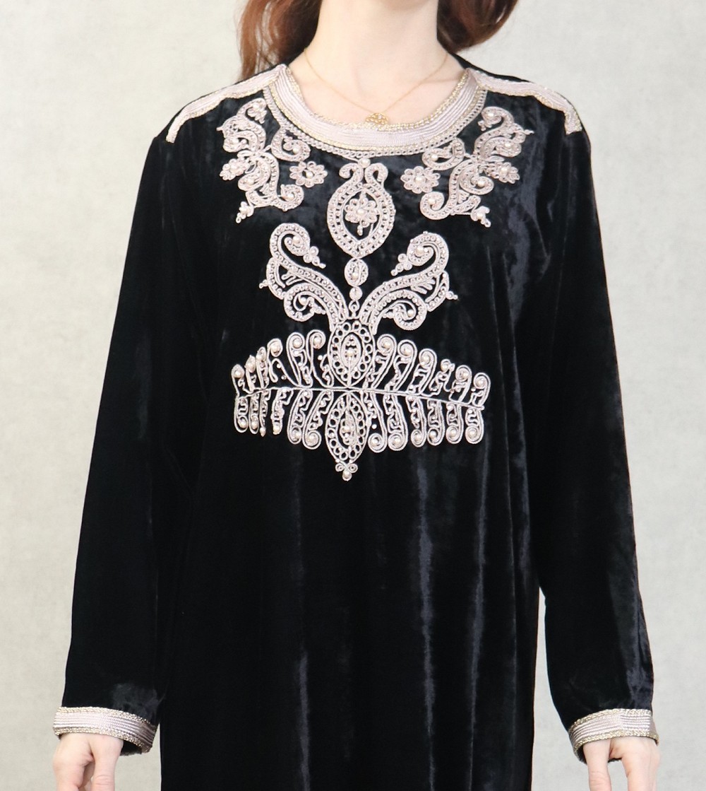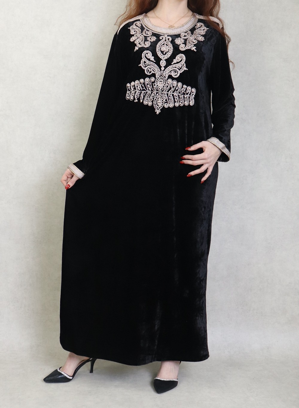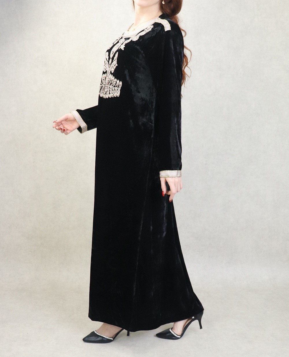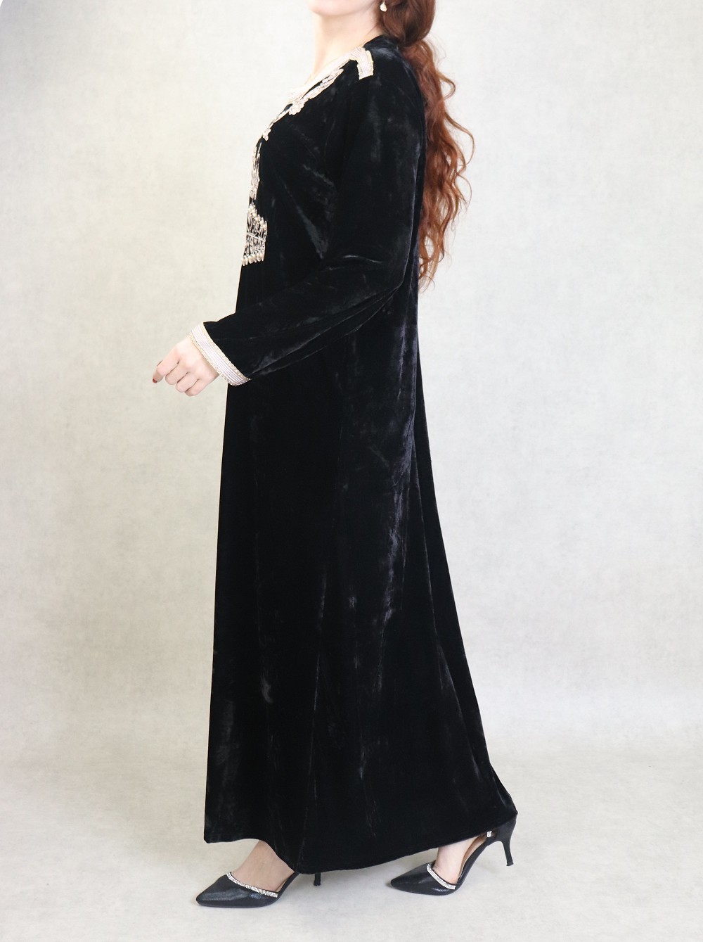 Robe orientale tunisienne manches longues effet velours avec broderies et perles pour femme (Automne Hiver) - Couleur Noir