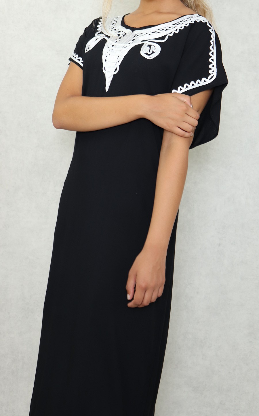 Robe longue, col dégagé, manches courte ornées de broderies blanches ainsi que sur le haut. Coupe droite, tissu léger et agréable.