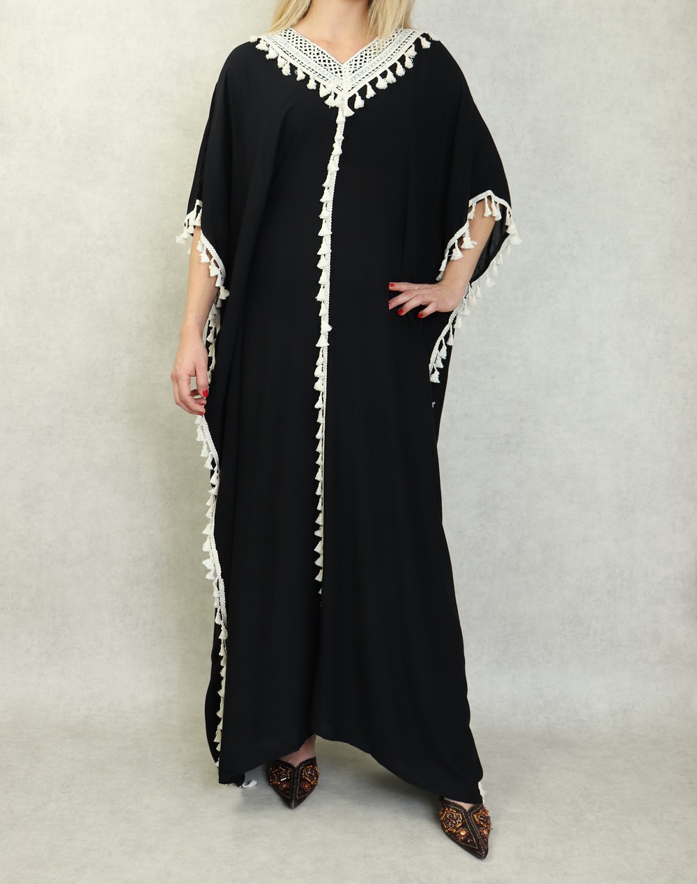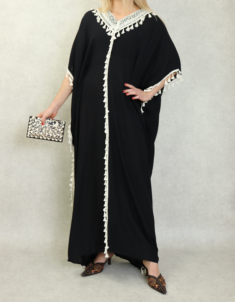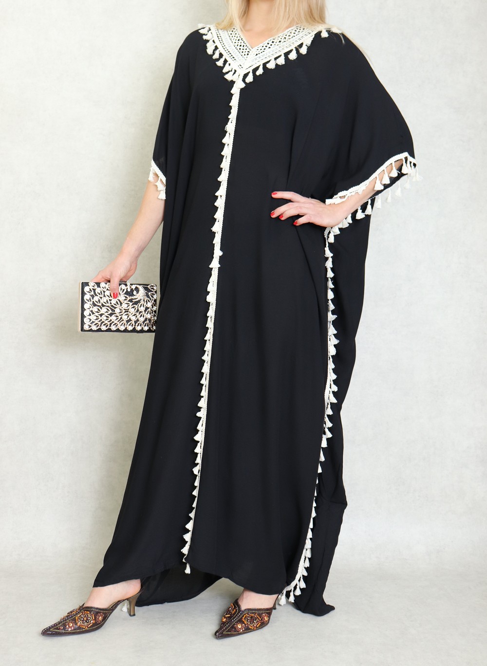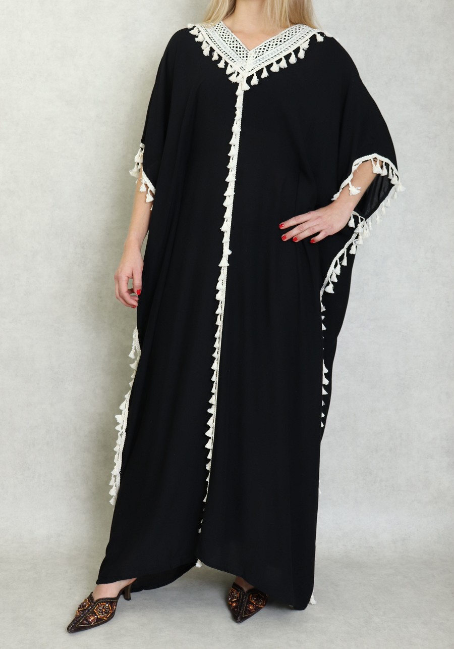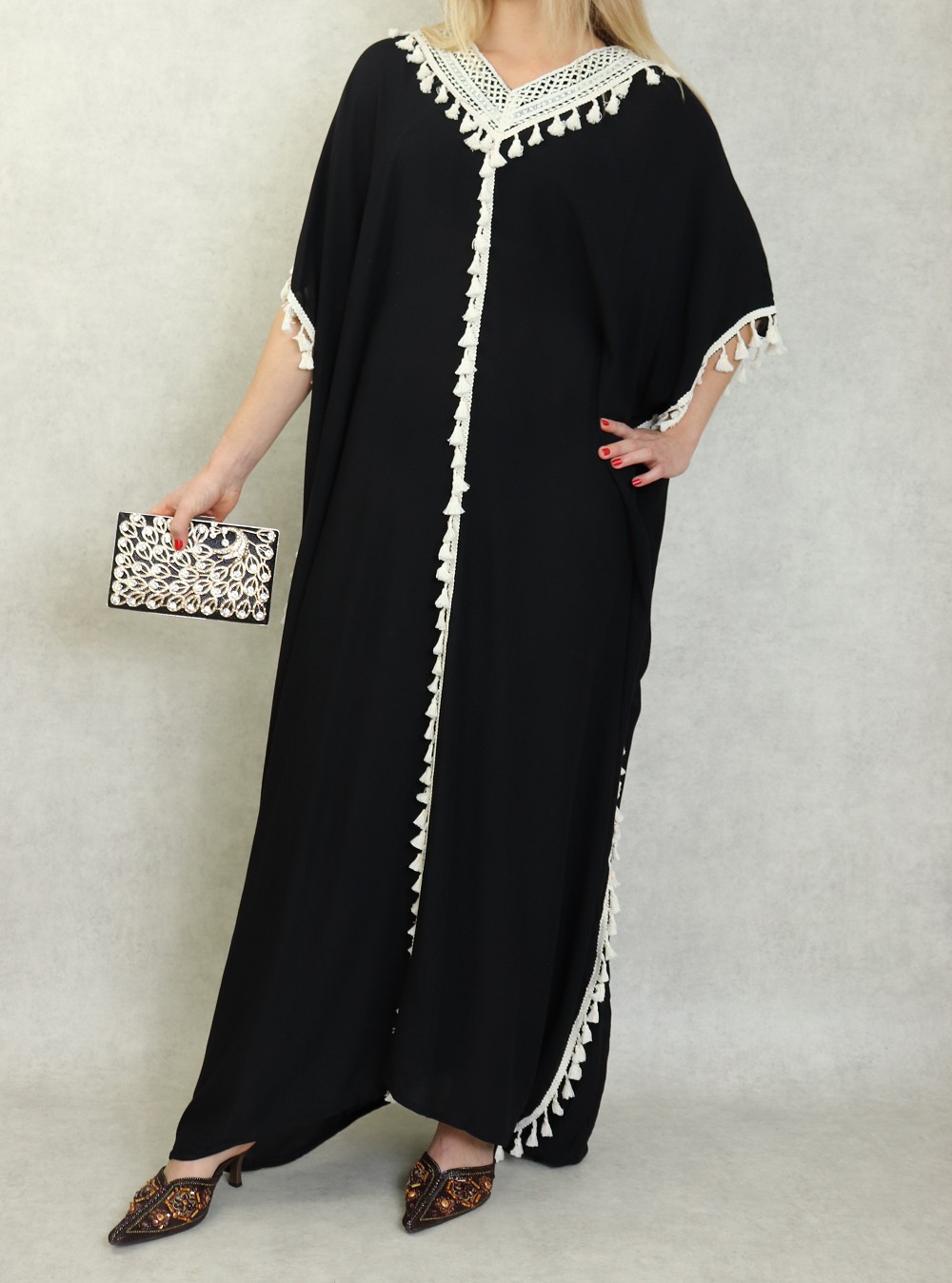 Robe de soirée Abaya Dubaï de qualité avec pompons, strass dorés et broderies - Couleur noir - REF. 38178 (45.00 €)