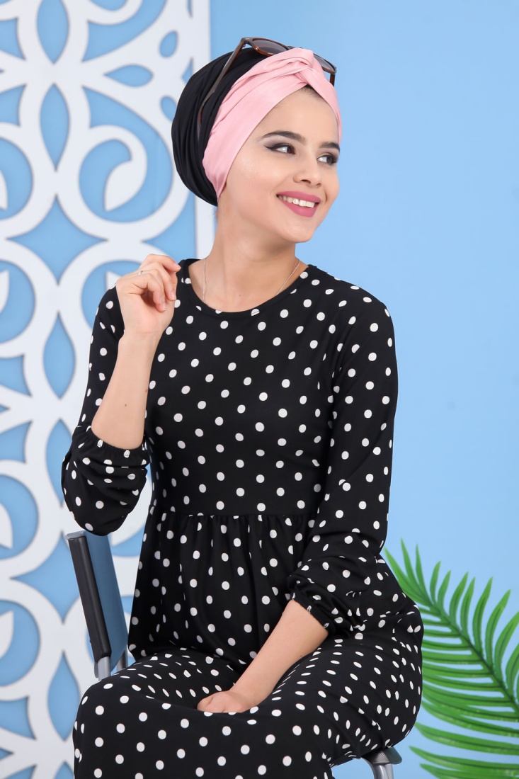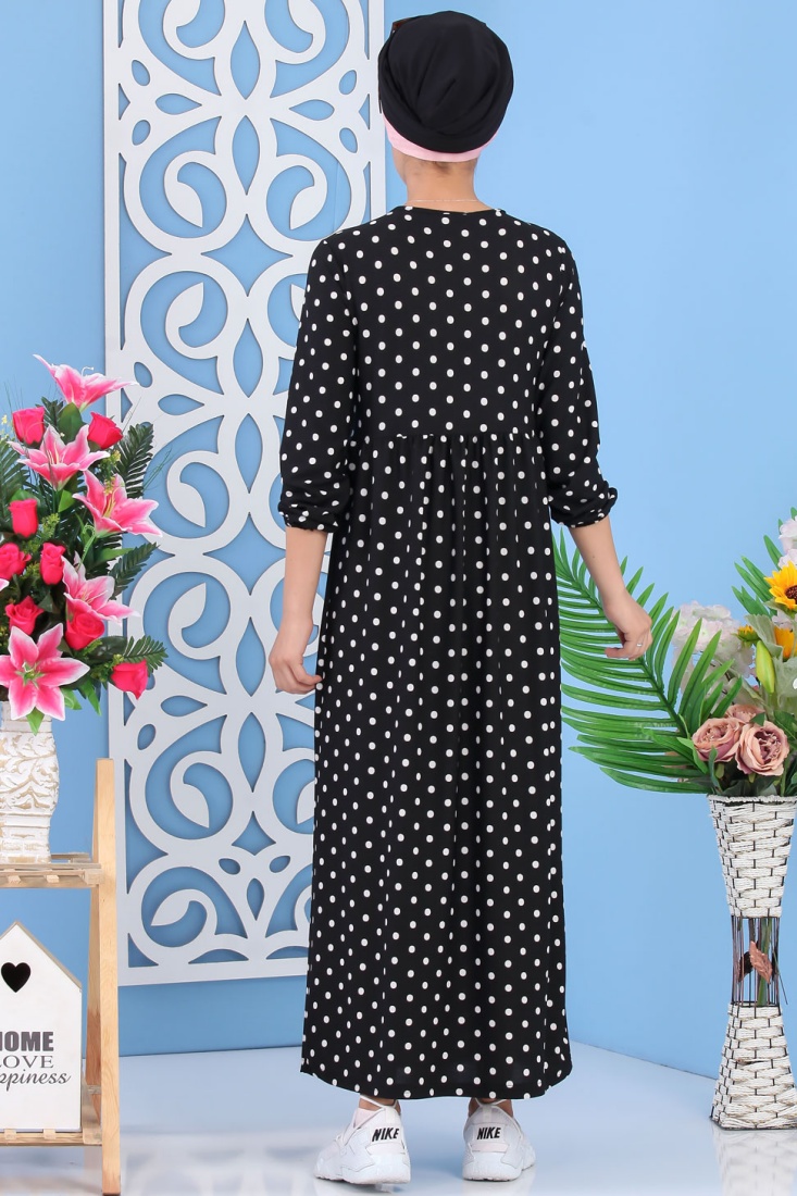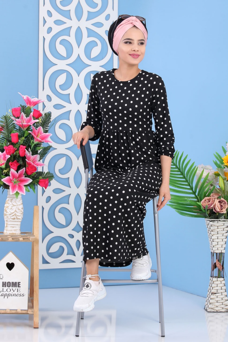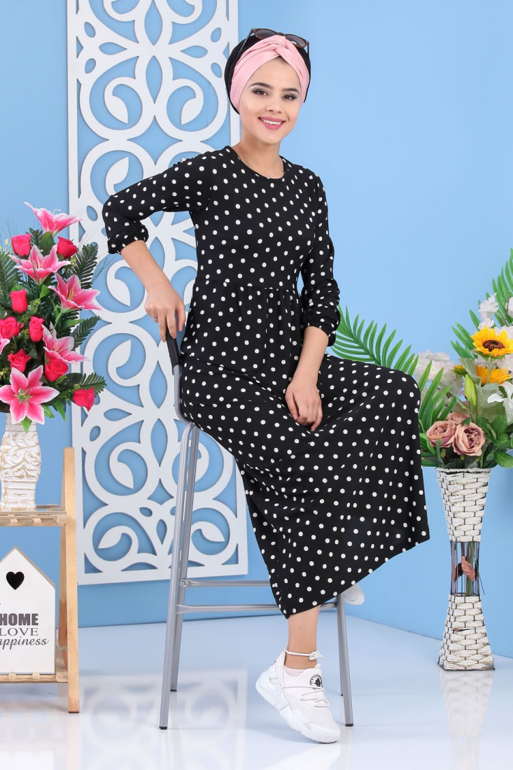 Belle robe à pois tendance et indémodable. Coupe légèrement évasée, col rond, manches longues, élastiques aux poignets, froncé au niveau de la taille. Tissu léger et fluide.