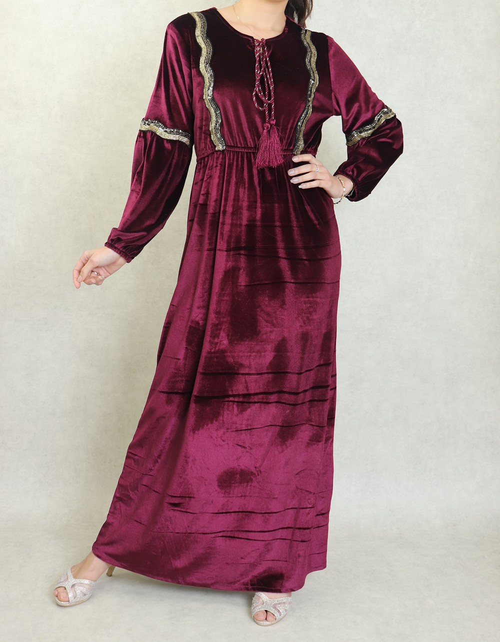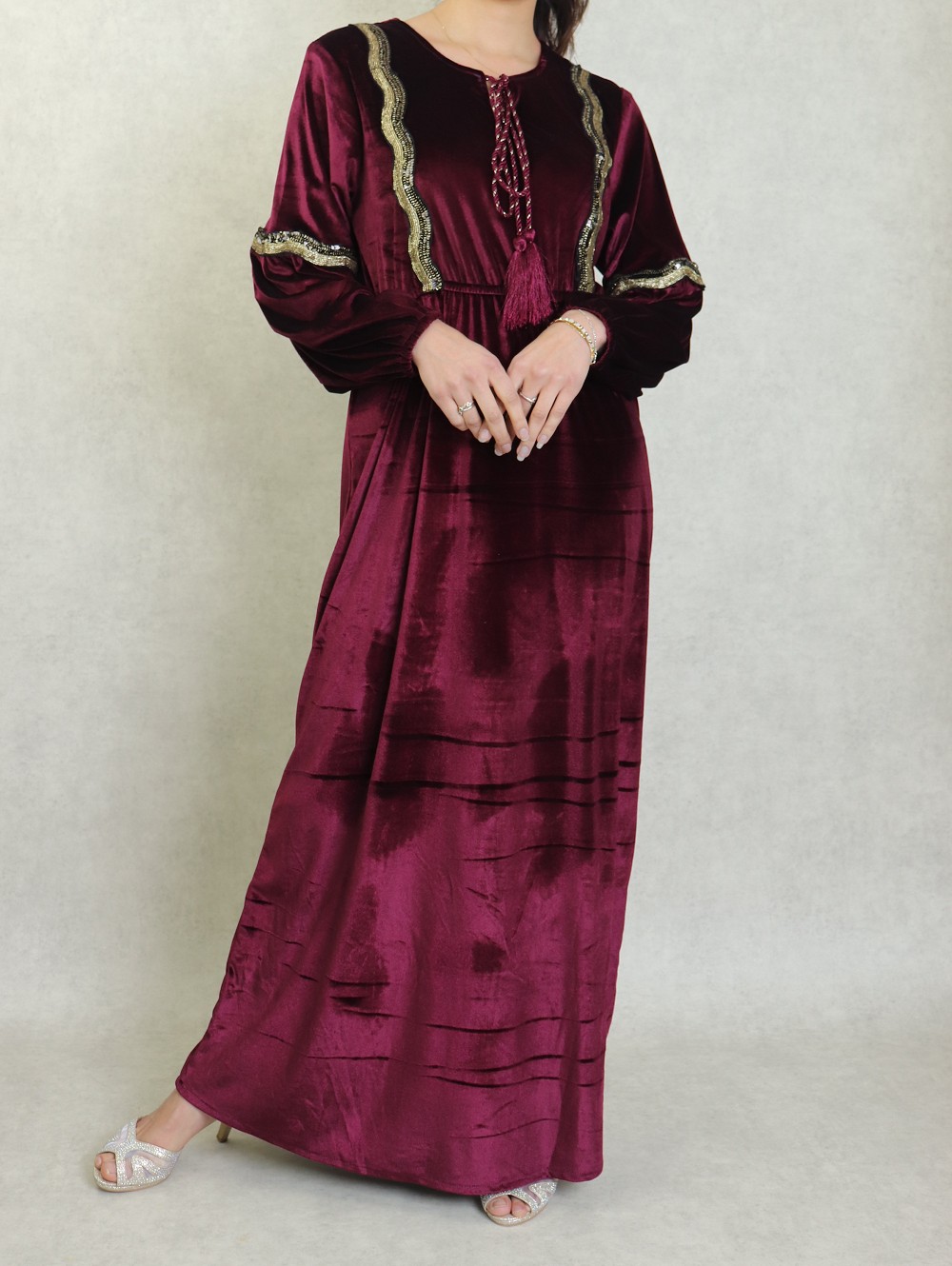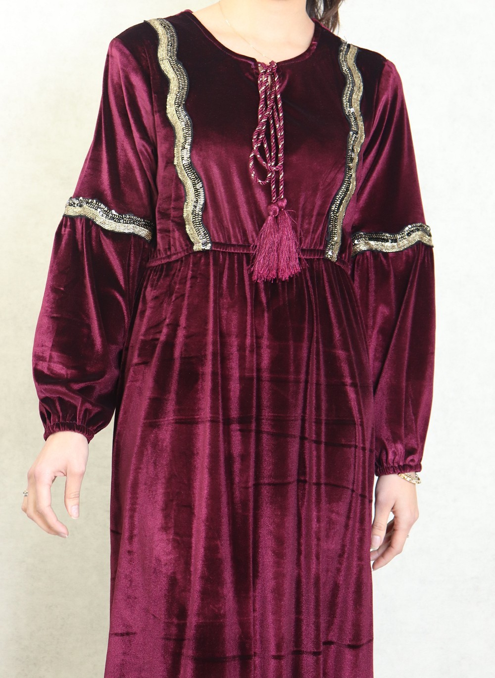 Robe style oriental en velours brodee pailletee pour femme (Automne Hiver) - Couleur Prune