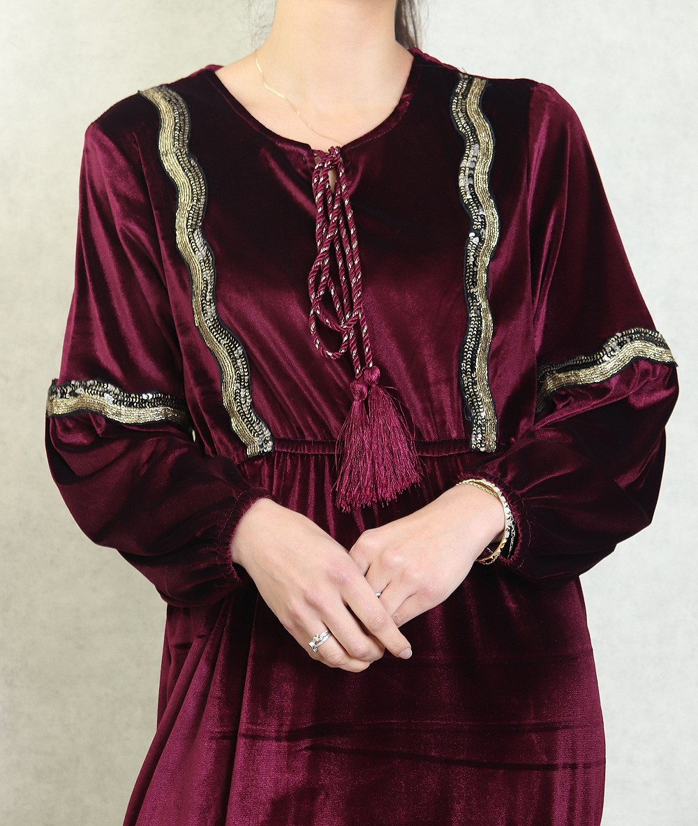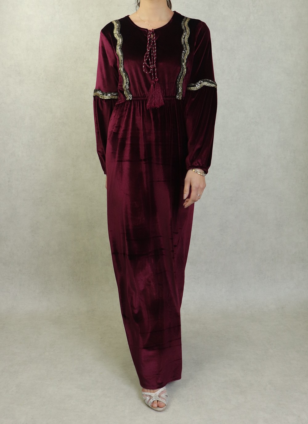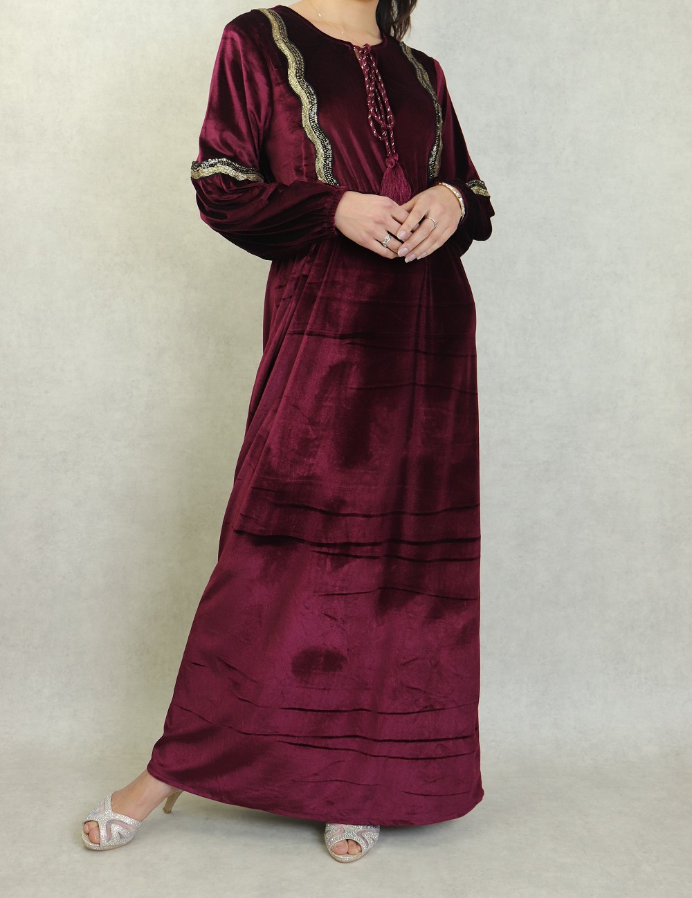 Robe style oriental en velours brodee pailletee pour femme (Automne Hiver) - Couleur Prune