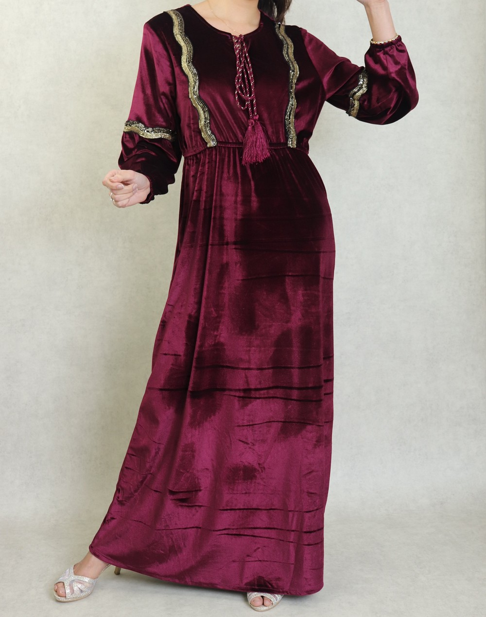 Robe style oriental en velours brodée pailletée pour femme (Automne Hiver) - Couleur Prune Vetement & Accessoire
