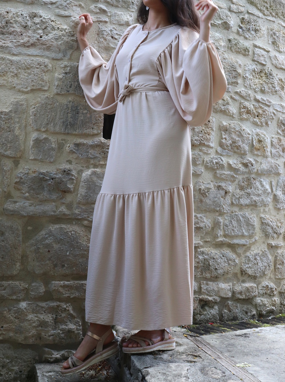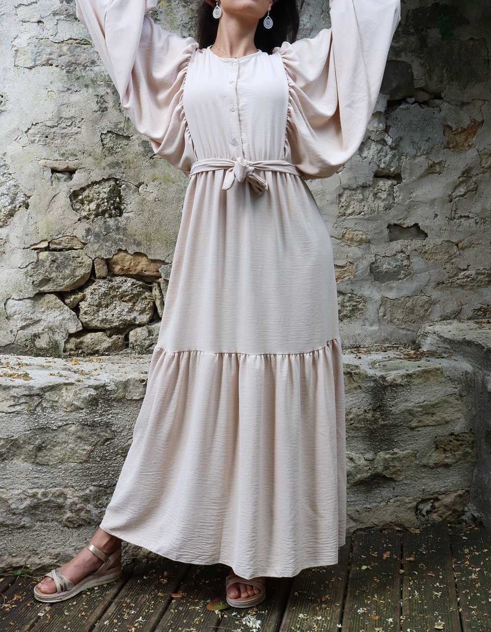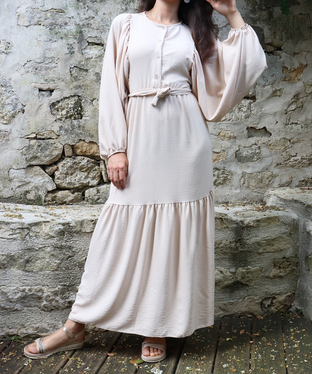 Robe longue habillée avec ceinture pour femme (Vêtement chic pour hijab) - Couleur beige clair - REF. 36617 (32.00 €)