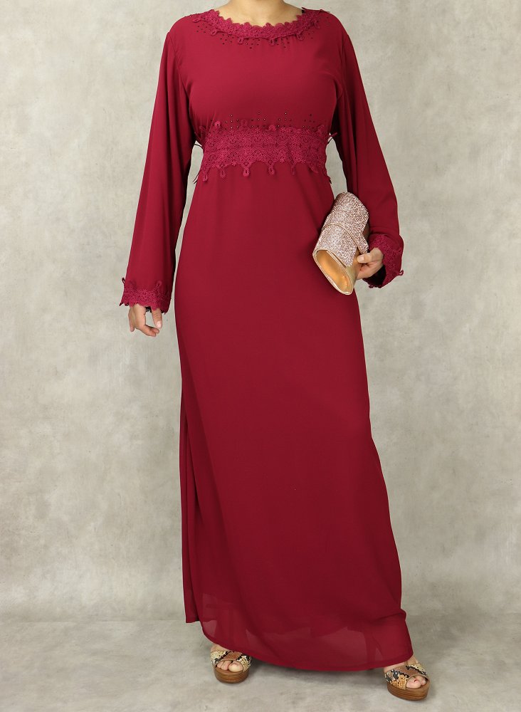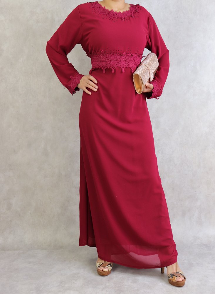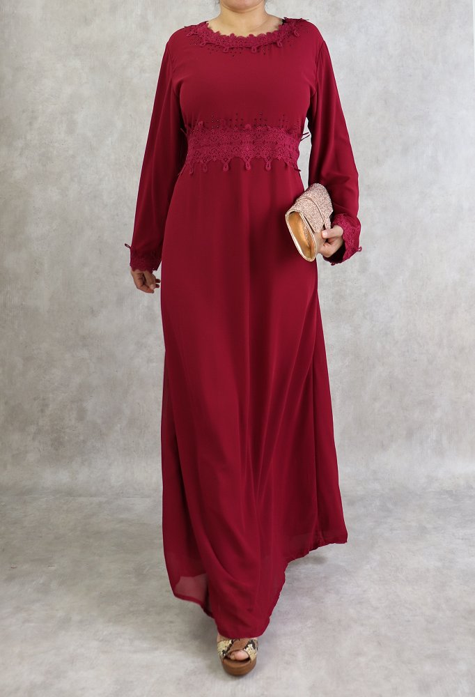 Robe à dentelles et strass sur un col dégagé ainsi que sur la taille et les poignets. Intégralement doublée. 2 liens qui peuvent aussi bien se nouer à l’avant comme à l'arrière afin de faire un effet cintré. Ce modèle sobre et distingué vous conviendra pour différents événements.